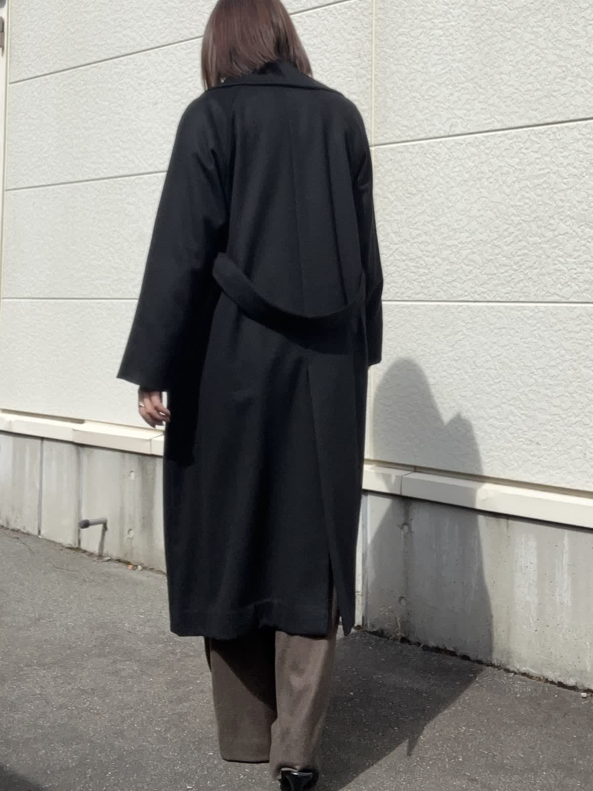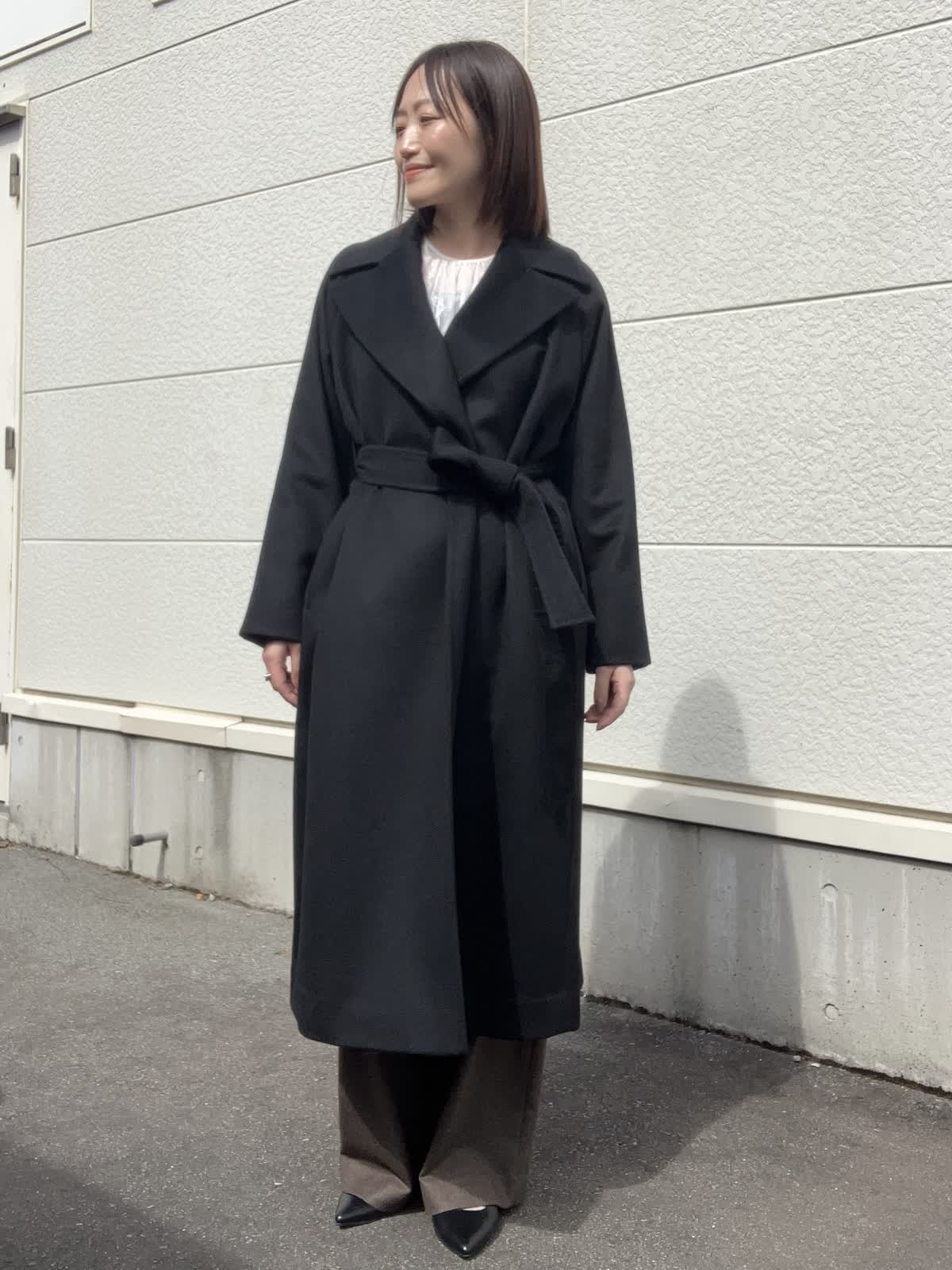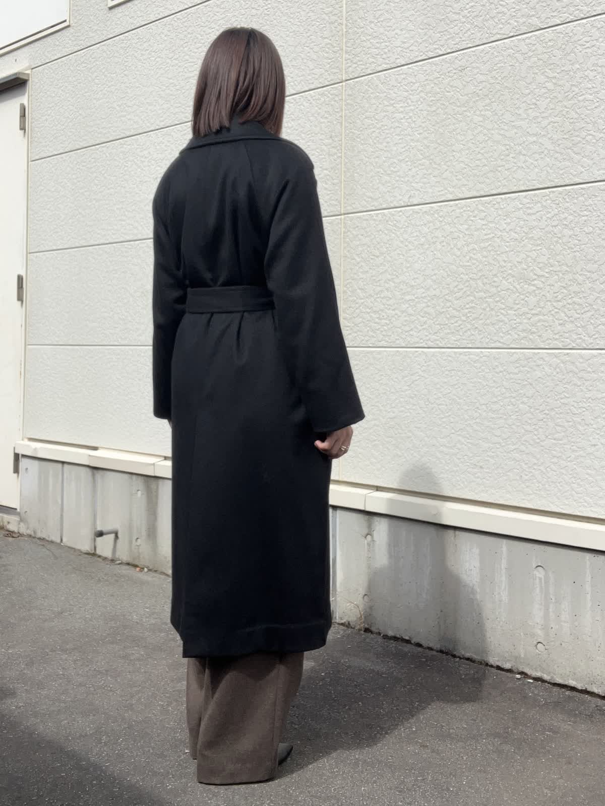 【着用サイズ】全て9号【着用カラー】コート:ブラック ブラウス:オフホワイト パンツ:ダークブラウン 1着は持っていたい黒のカシミヤ100%のコート。通勤や冠婚葬祭などのきちんとしたシーンからお休みの日まで幅広く対応できます。冬の始まりは薄手のインナーにサッと羽織っても素敵に着こなせる、頼れるコート。トレンドに左右されず長くご愛用いただけます。
