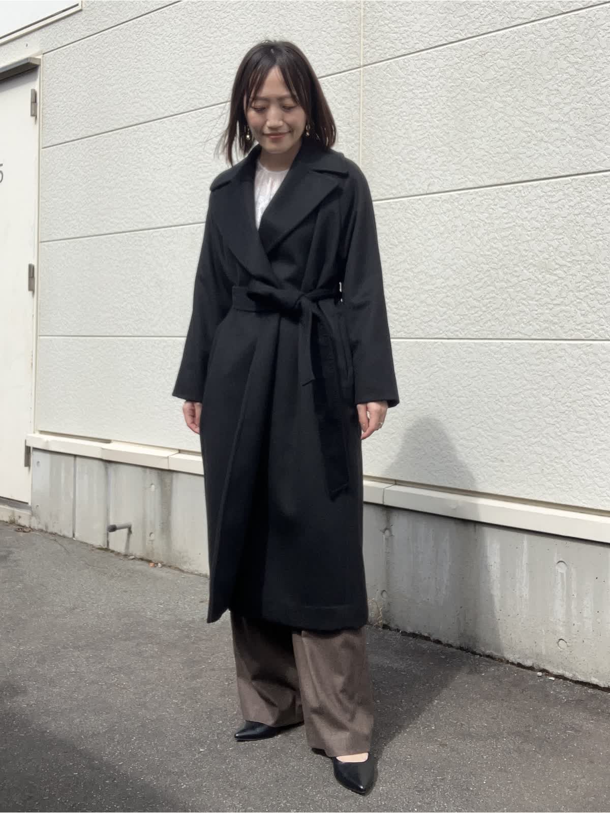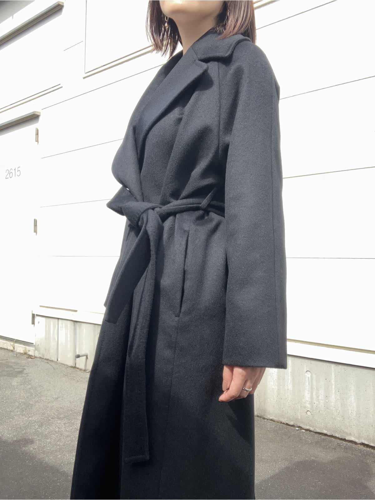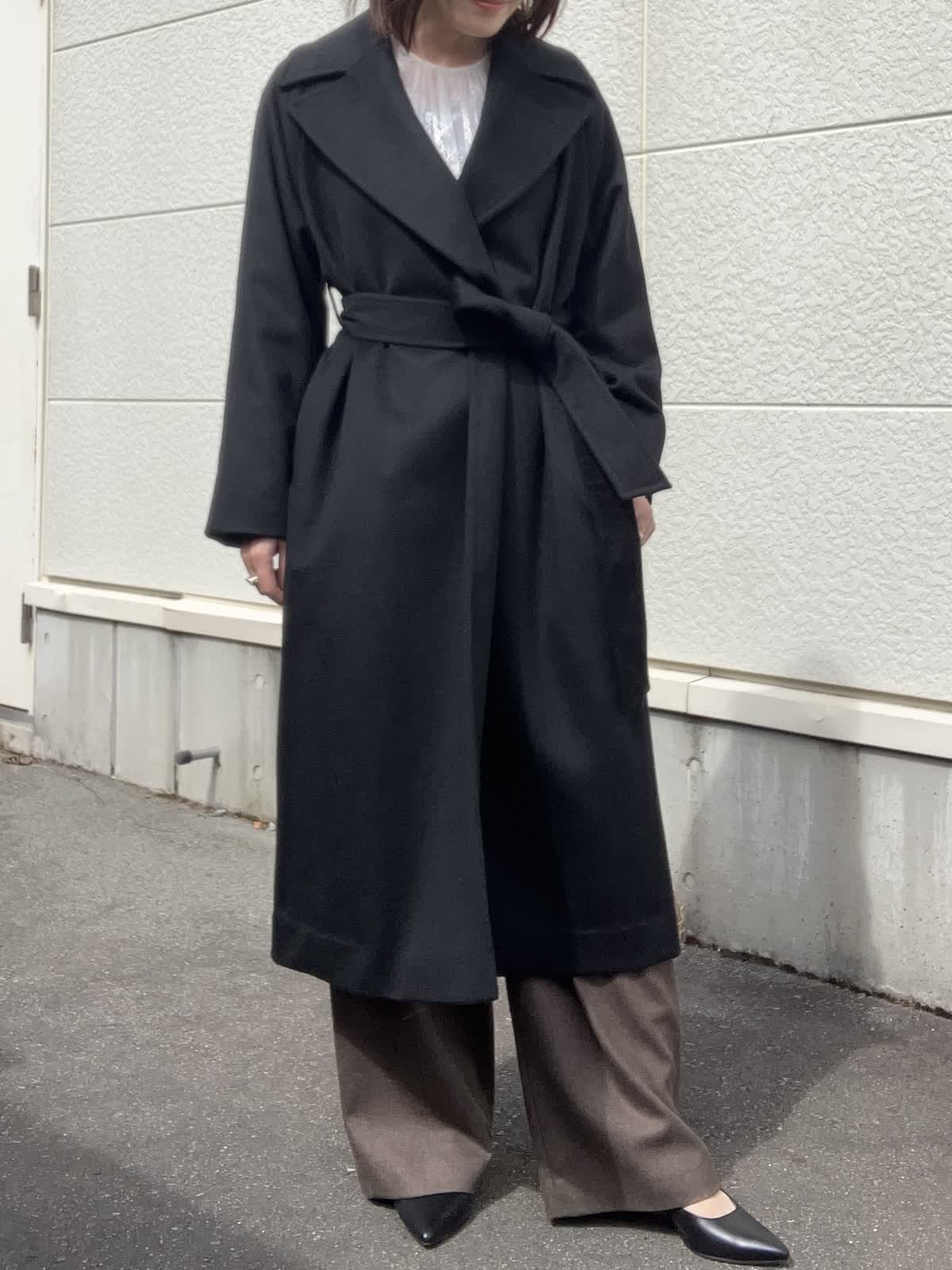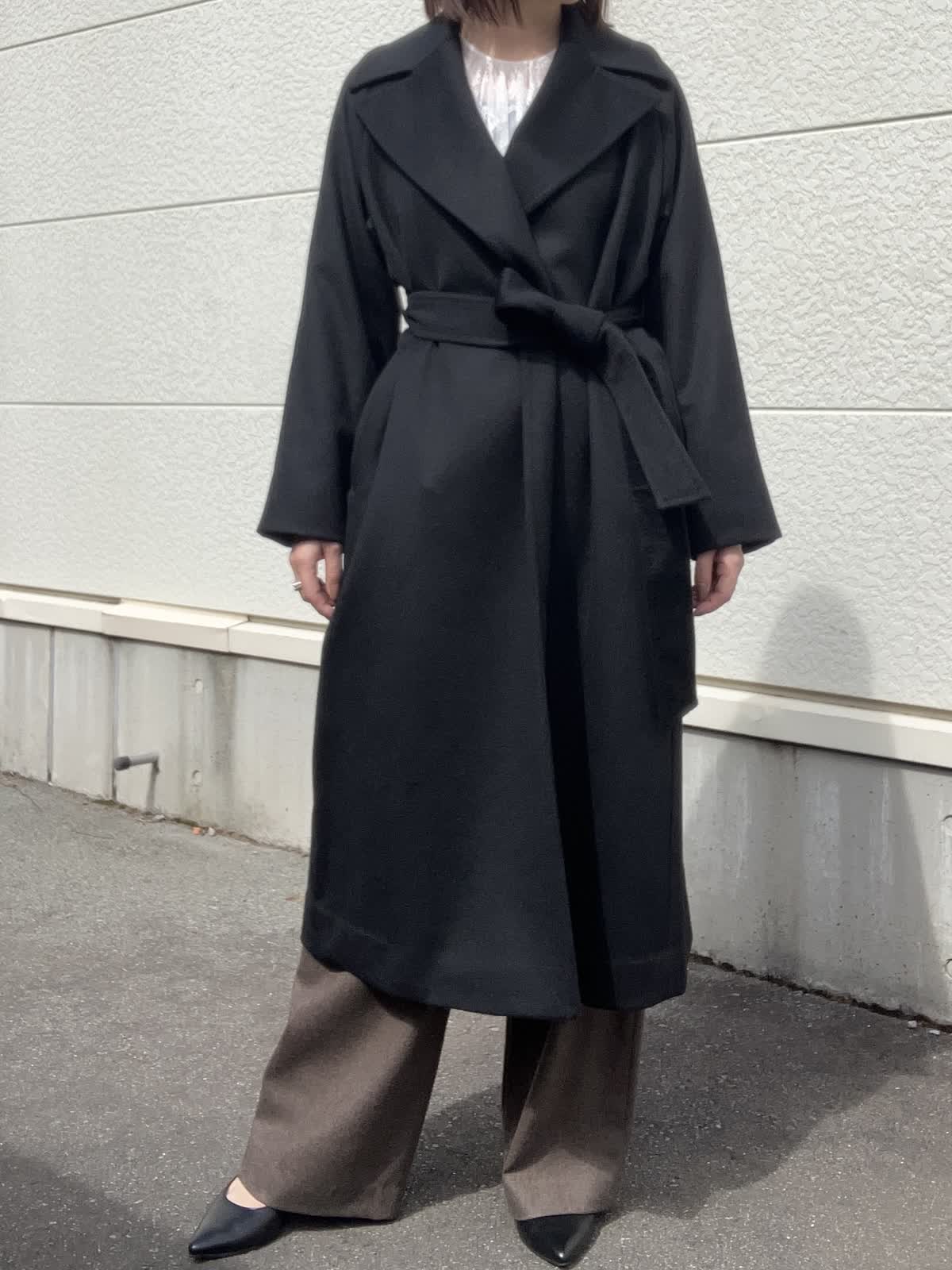 【着用サイズ】全て9号【着用カラー】コート:ブラック ブラウス:オフホワイト パンツ:ダークブラウン 1着は持っていたい黒のカシミヤ100%のコート。通勤や冠婚葬祭などのきちんとしたシーンからお休みの日まで幅広く対応できます。冬の始まりは薄手のインナーにサッと羽織っても素敵に着こなせる、頼れるコート。トレンドに左右されず長くご愛用いただけます。