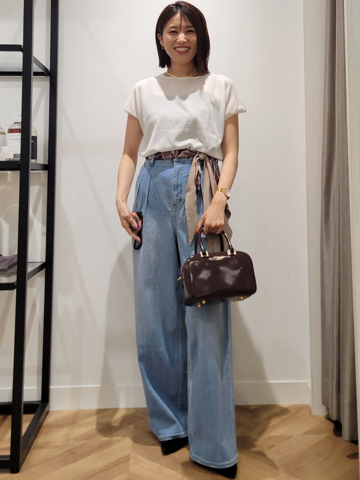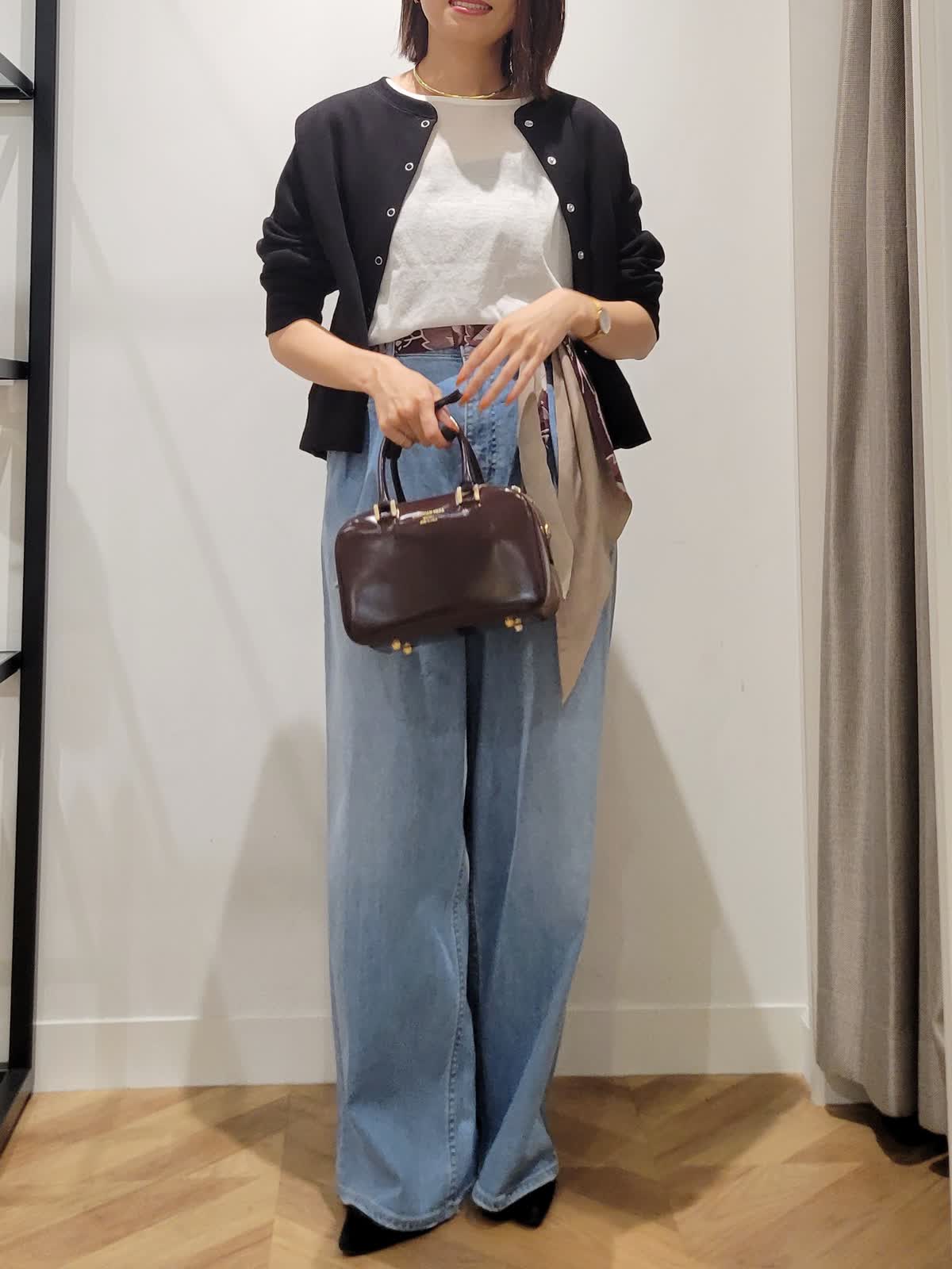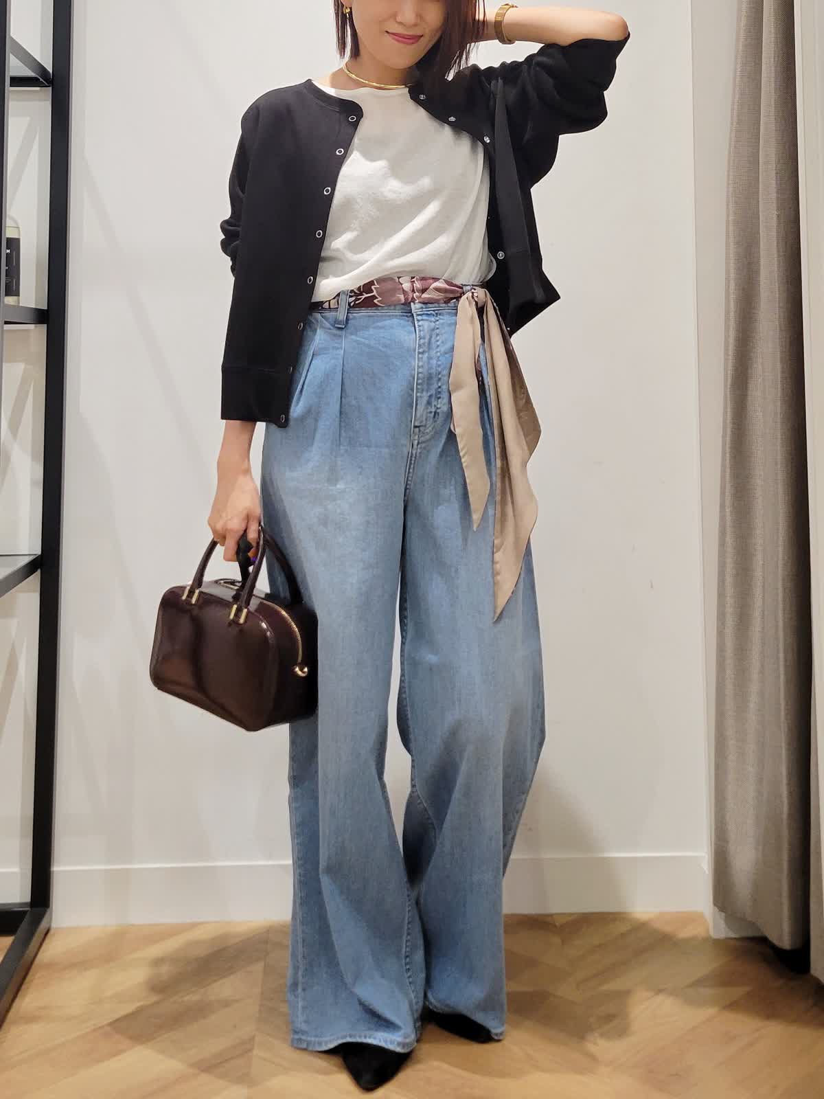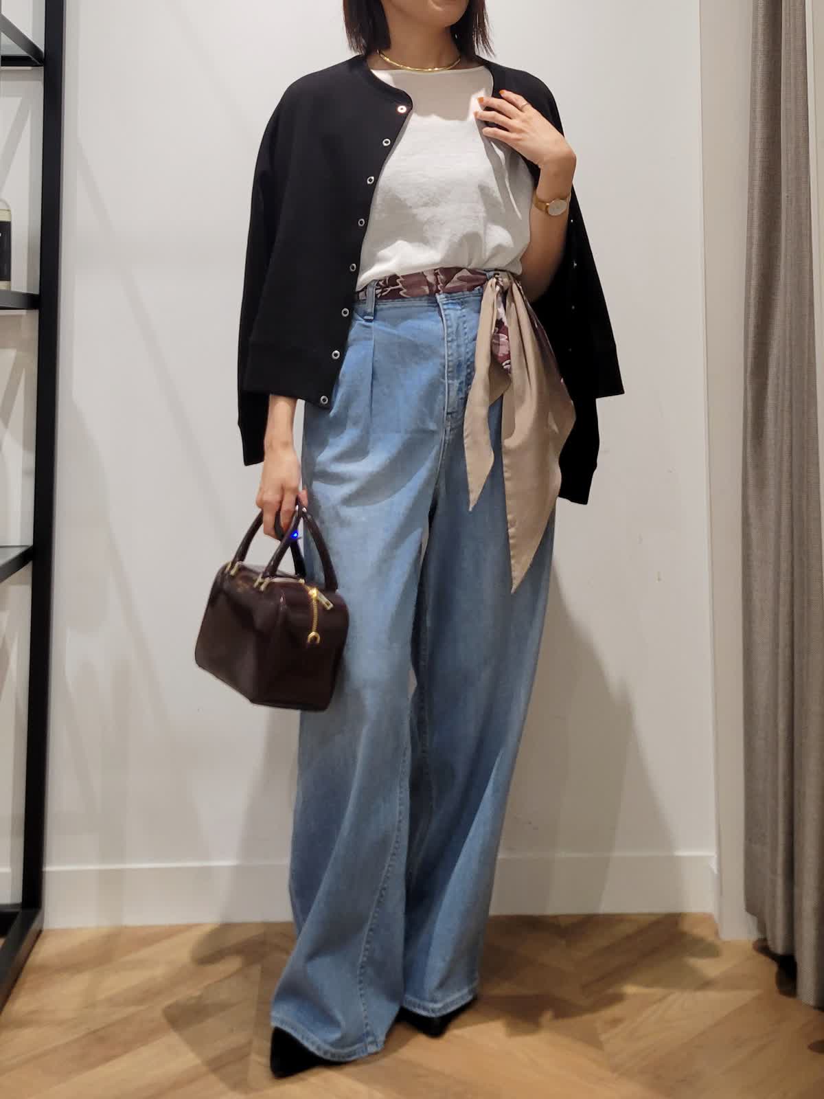 【着用サイズ】ニット:オフホワイト:9号 デニム:サックス:7号 カーディガン:ブラック:9号 定番は素材とシルエット勝負。 Tシャツではラフすぎニットだと重くなるそんな時はシアーニットをチョイス。上品な透け感でエレガントなカジュアルスタイルにぴったりです。ワイドデニムをゆるりとはいてこなれ感を。気温調節も兼ねて羽織りはコンパクトなものをセレクトしてみました。ウエストスカーフとバックの色を合わせて秋らしさをプラス。