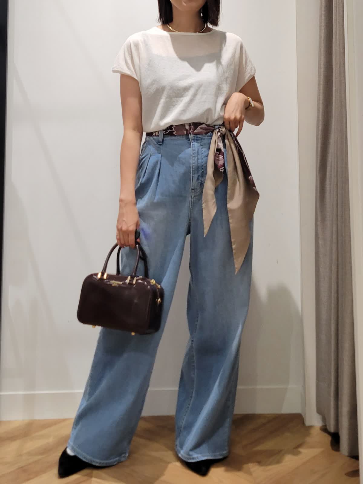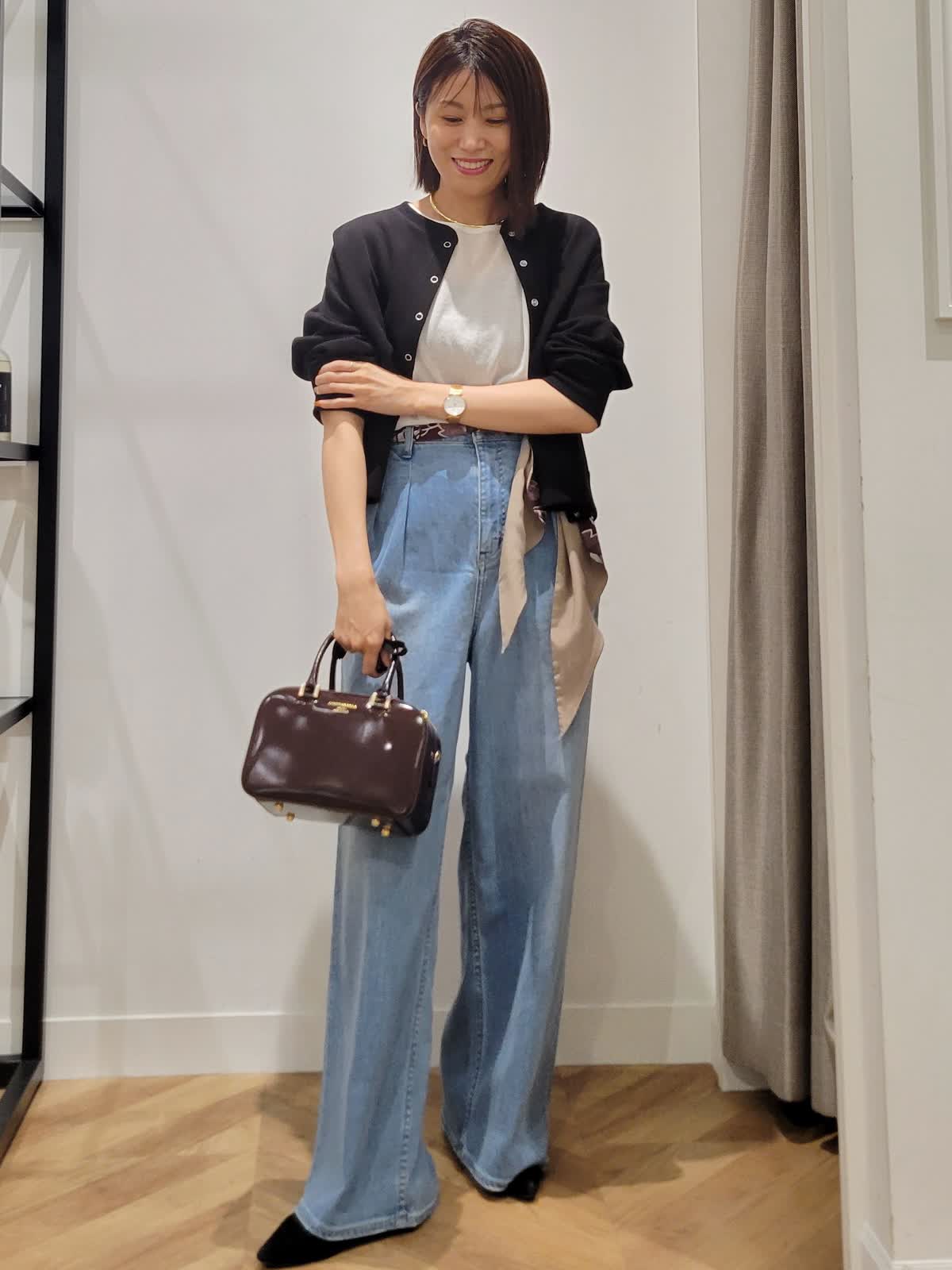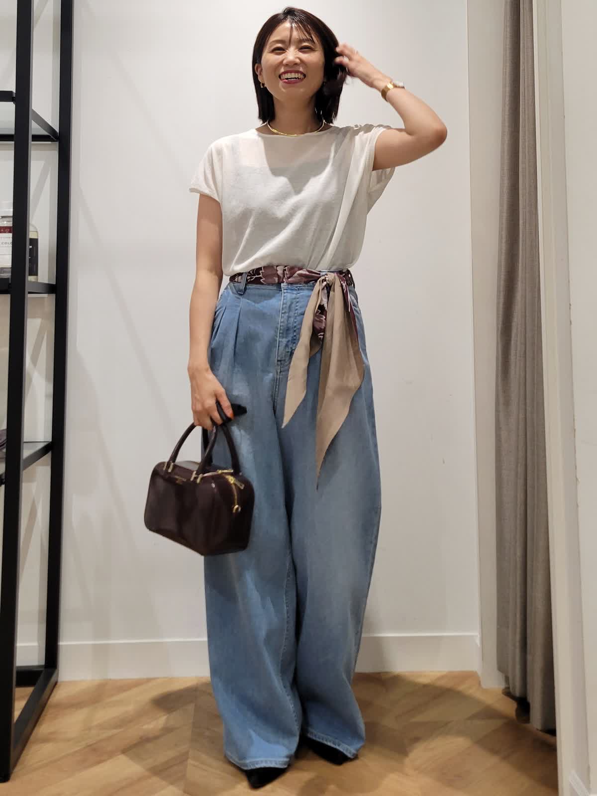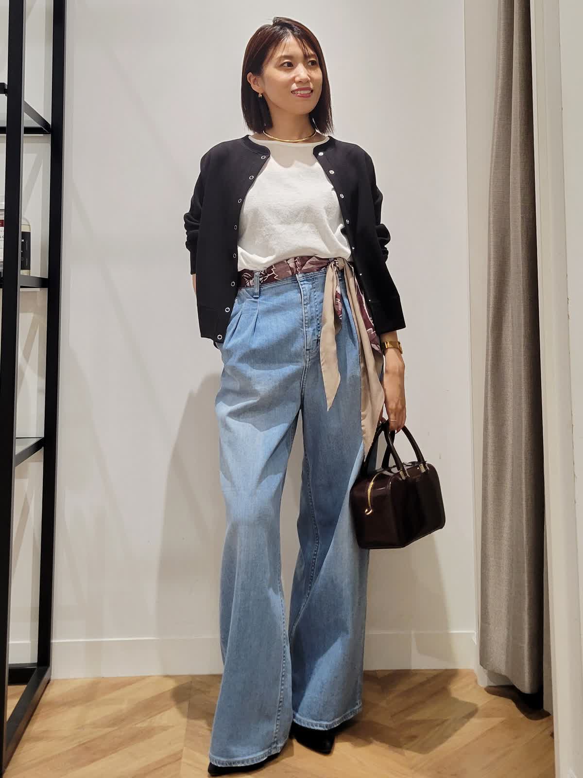 【着用サイズ】ニット:オフホワイト:9号 デニム:サックス:7号 カーディガン:ブラック:9号 定番は素材とシルエット勝負。 Tシャツではラフすぎニットだと重くなるそんな時はシアーニットをチョイス。上品な透け感でエレガントなカジュアルスタイルにぴったりです。ワイドデニムをゆるりとはいてこなれ感を。気温調節も兼ねて羽織りはコンパクトなものをセレクトしてみました。ウエストスカーフとバックの色を合わせて秋らしさをプラス。