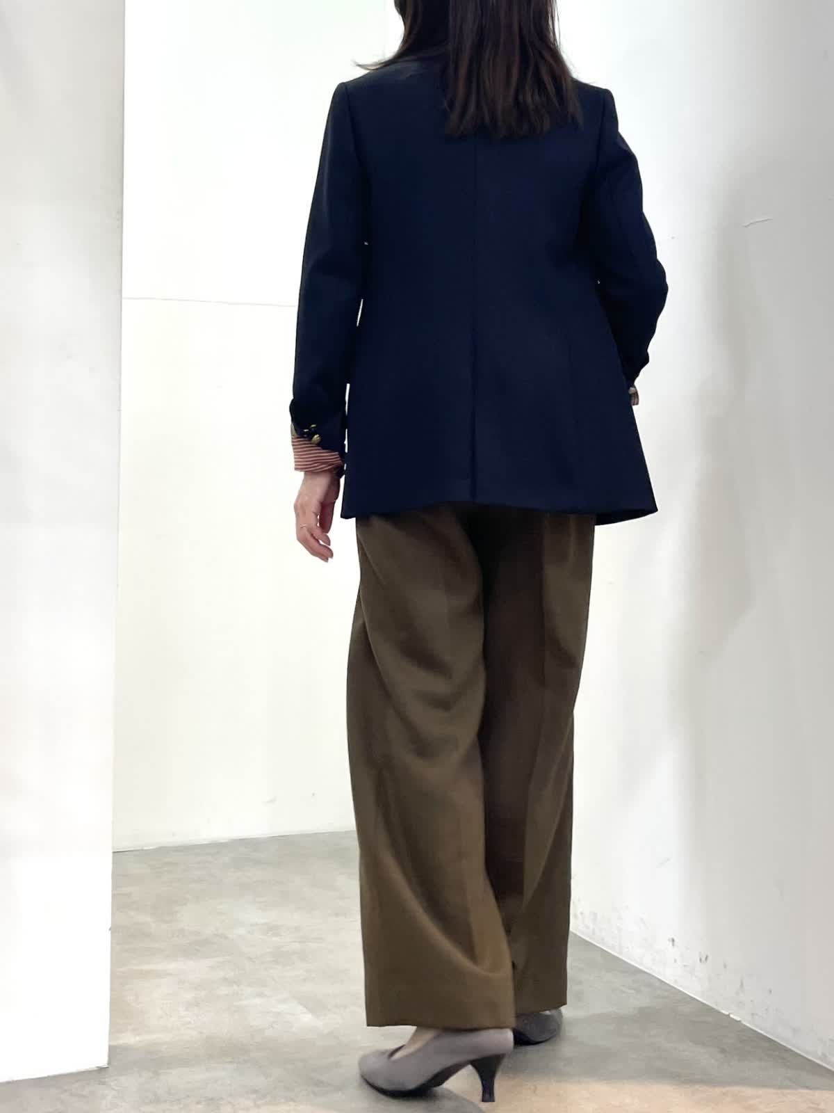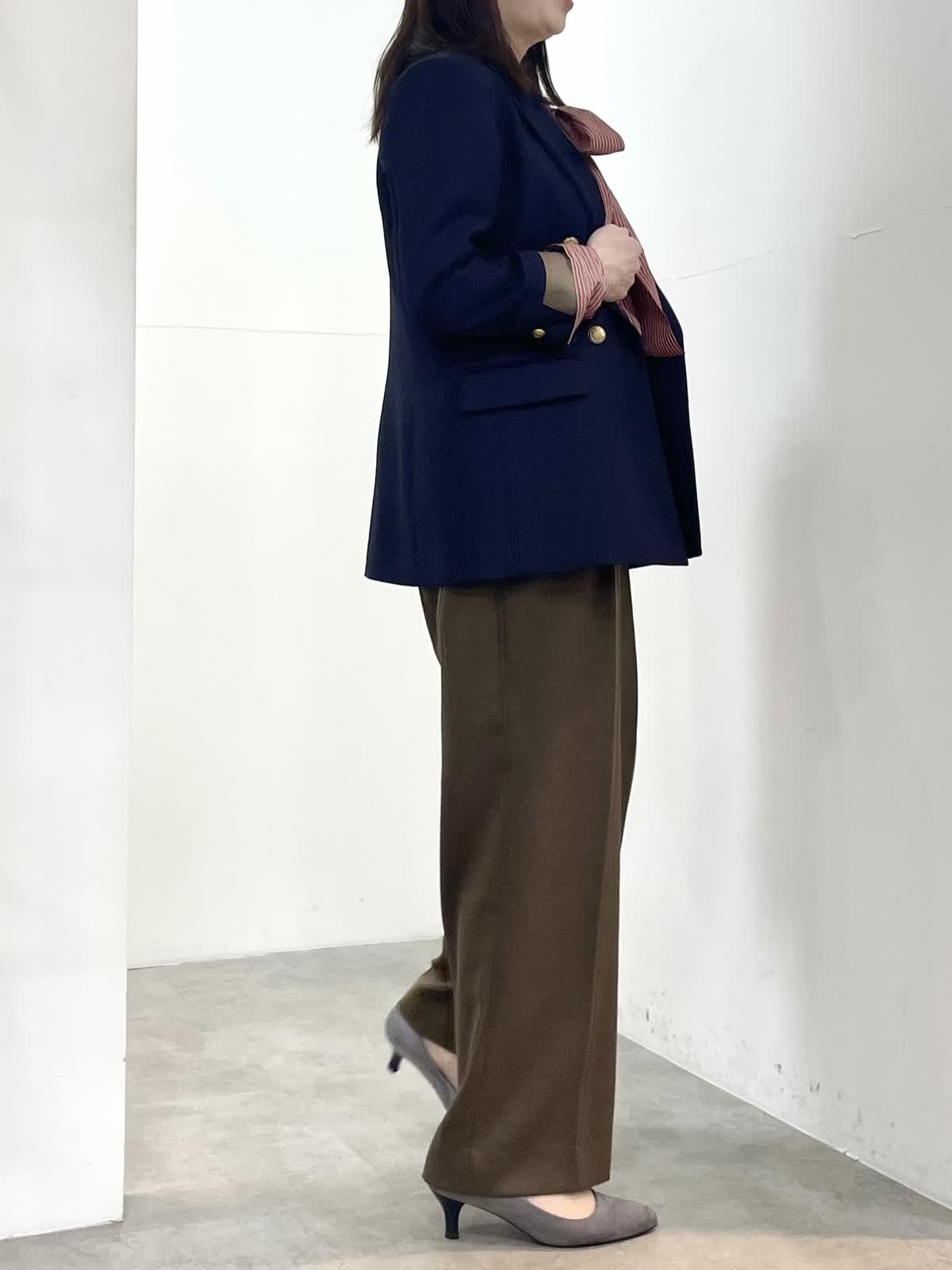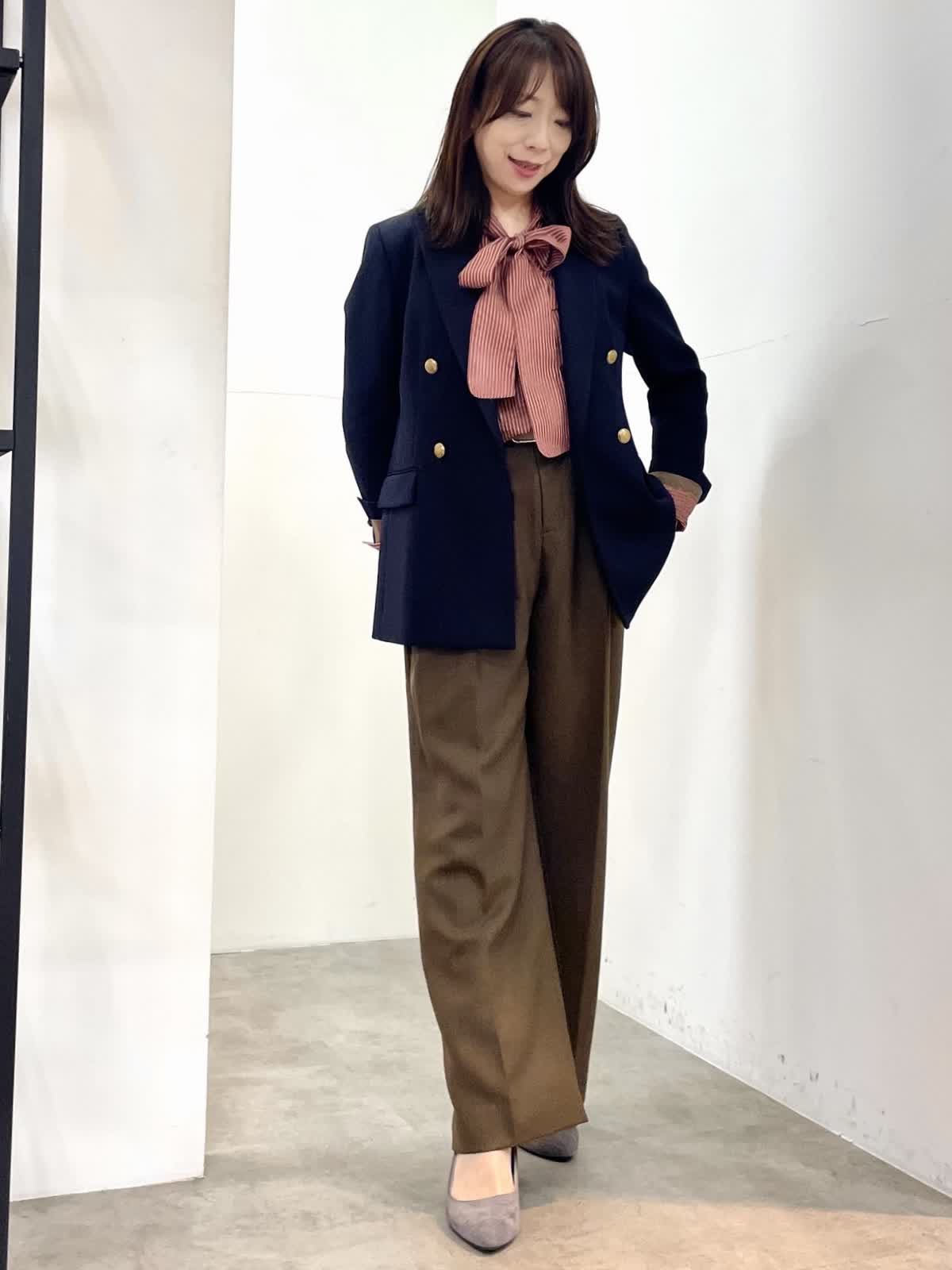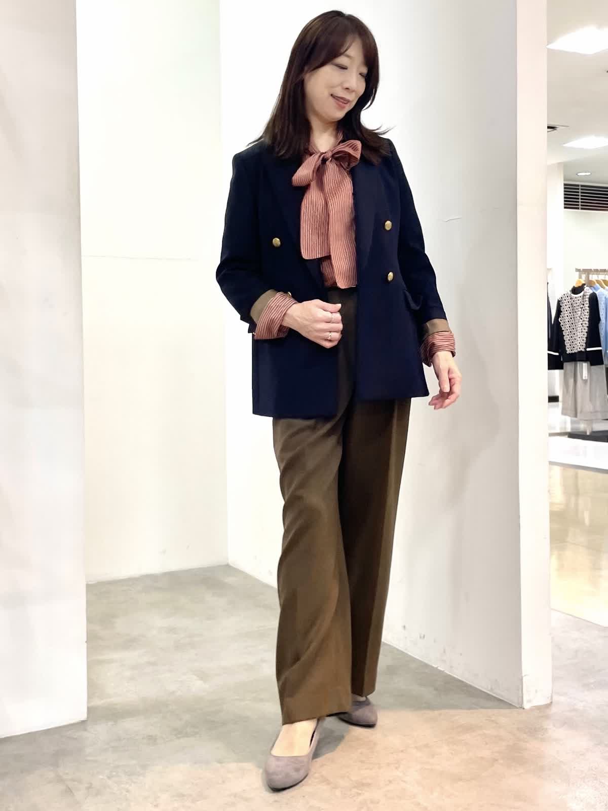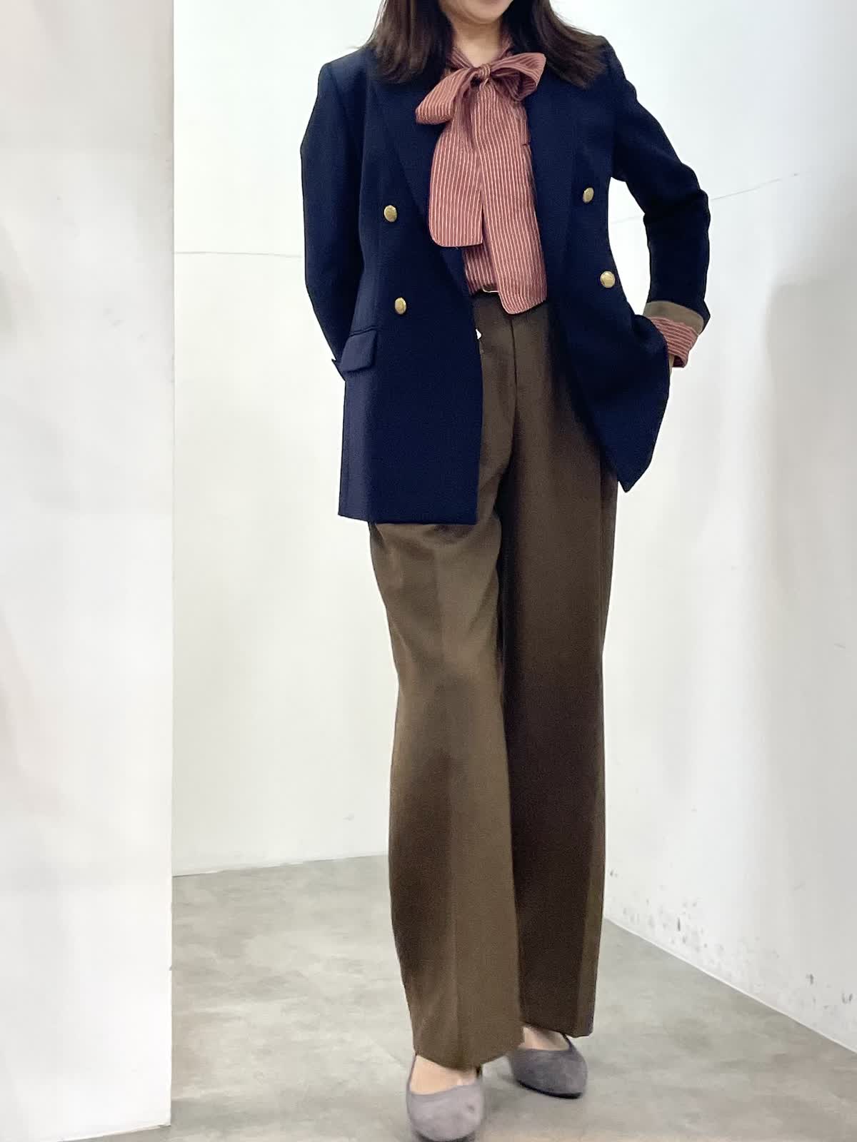 【着用サイズ】全て9号 【着用カラー】ジャケット:ネイビー ブラウス: レンガ パンツ: ブラウン 秋の通勤スタイル。定番ダブルブレストジャケットにボウタイブラウスを合わせて女性らしく。ブラウスは上品な艶感があり、1枚でも様になります。パンツはタックが広がらずヒップ周りをすっきり見せてくれるデザイン。トレンドのブラウンを合わせました。