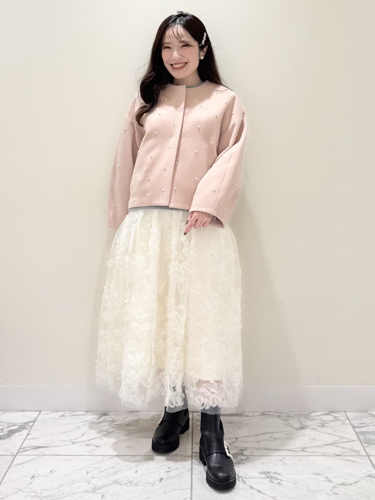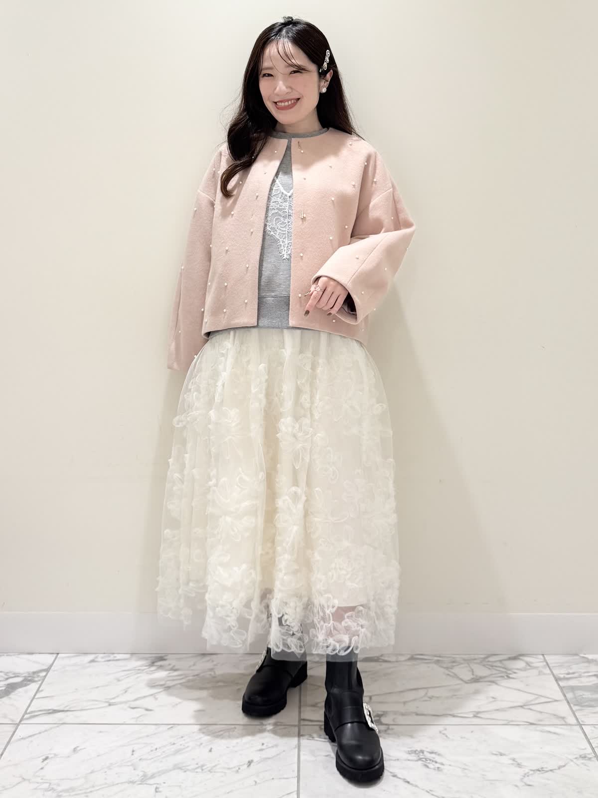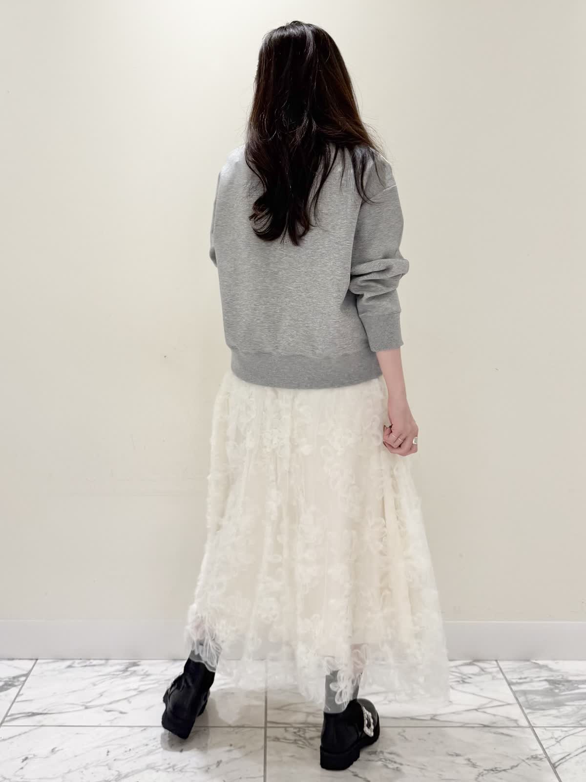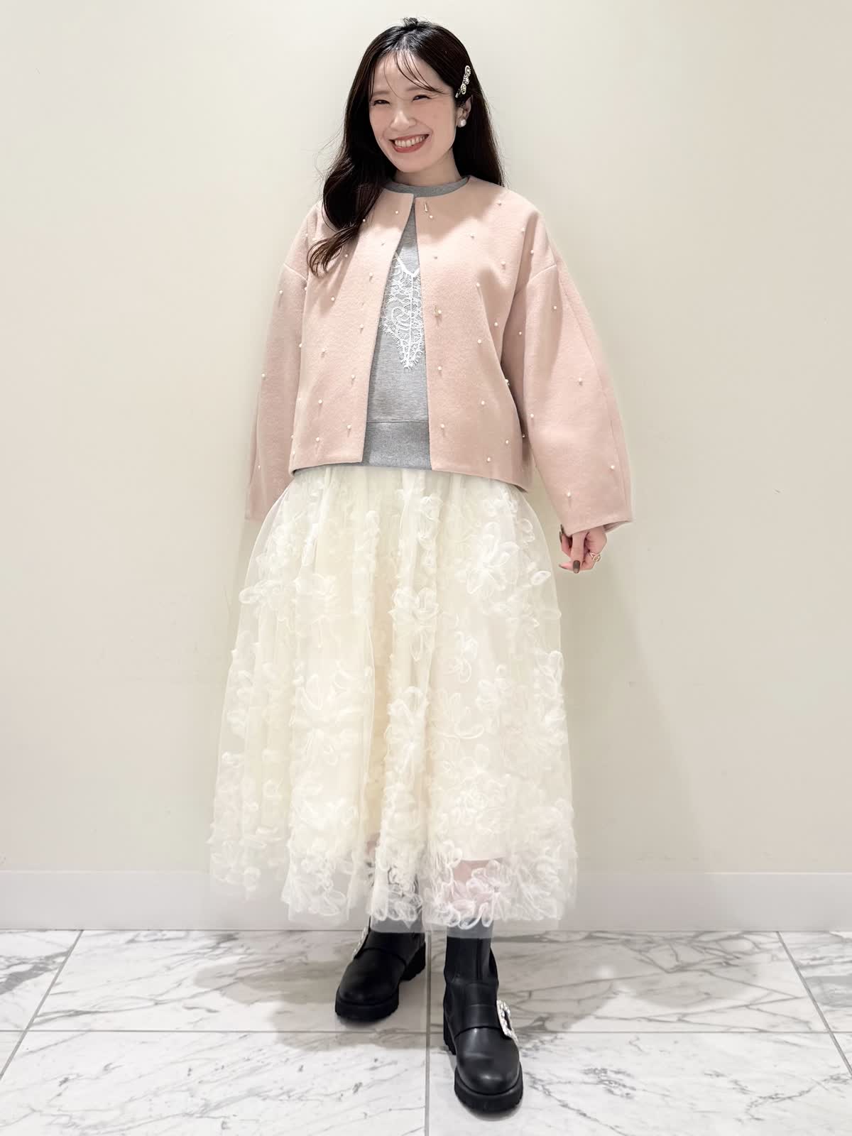 【着用サイズ/カラー】カットソー:9号/グレー スカート:7号/オフホワイト コート:7号/ピンク 可愛すぎる休日のお出かけコーディネート♪トップスはレースが可愛いスウェット生地のカットソー。肩線が落ちたシルエットでアームホールもゆったりなので着心地◎ 合わせはフラワー柄のチュールにその上から刺繍を施した可愛いすぎるチュールスカートです。ふわっと、とても軽く、ウエストは柔らかい総ゴム仕様でストレスフリーで履き心地◎いつものサイズで大丈夫ですが、コンパクトに履きたい方は1サイズ小さめでも◯アウターは贅沢にパールを散りばめたショート丈コート。とても軽い生地で羽織りやすく、アームホール&身幅共にゆったりしているので厚手のニットも着やすいです。いつものサイズで大丈夫ですが、コンパクトに着たい方は1サイズ小さめでも◯