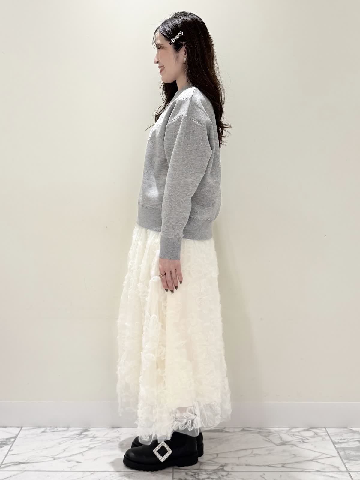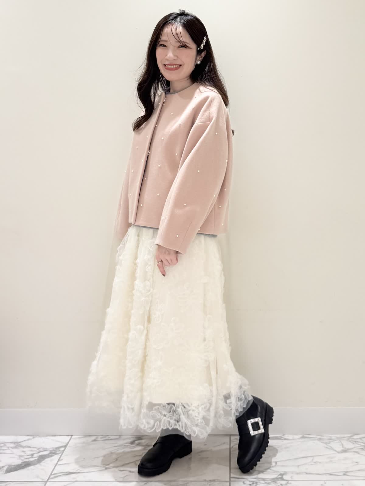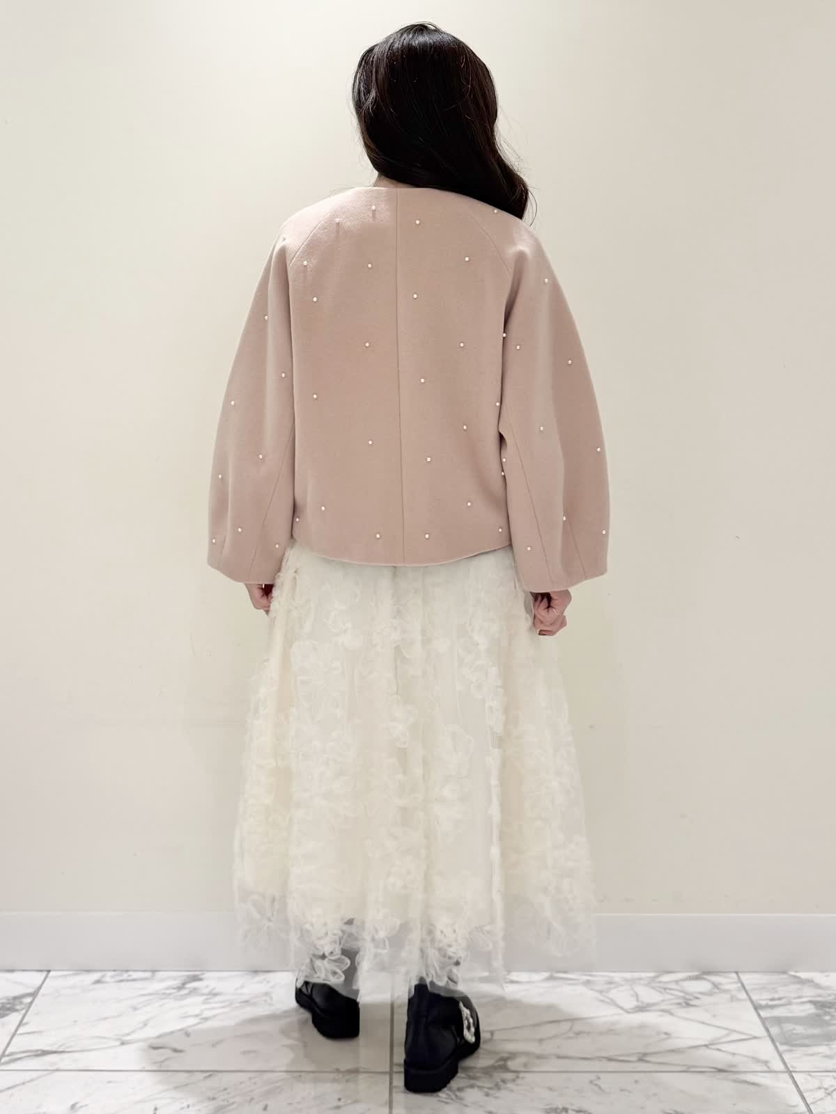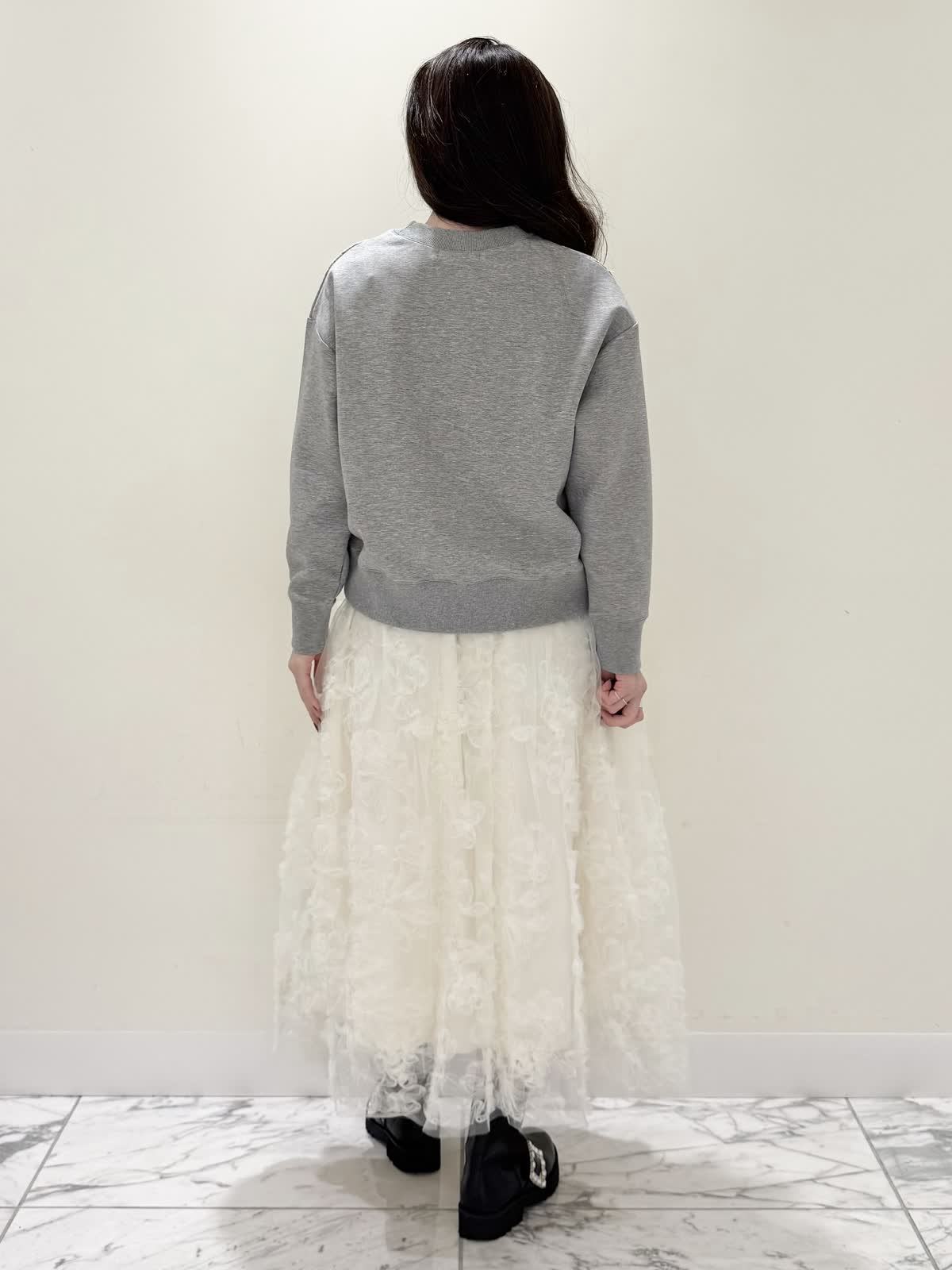【着用サイズ/カラー】カットソー:9号/グレー スカート:7号/オフホワイト コート:7号/ピンク 可愛すぎる休日のお出かけコーディネート♪トップスはレースが可愛いスウェット生地のカットソー。肩線が落ちたシルエットでアームホールもゆったりなので着心地◎ 合わせはフラワー柄のチュールにその上から刺繍を施した可愛いすぎるチュールスカートです。ふわっと、とても軽く、ウエストは柔らかい総ゴム仕様でストレスフリーで履き心地◎いつものサイズで大丈夫ですが、コンパクトに履きたい方は1サイズ小さめでも◯アウターは贅沢にパールを散りばめたショート丈コート。とても軽い生地で羽織りやすく、アームホール&身幅共にゆったりしているので厚手のニットも着やすいです。いつものサイズで大丈夫ですが、コンパクトに着たい方は1サイズ小さめでも◯