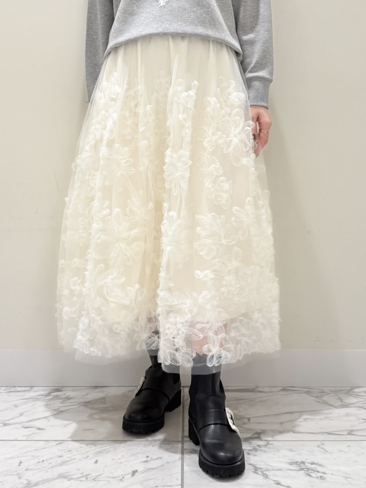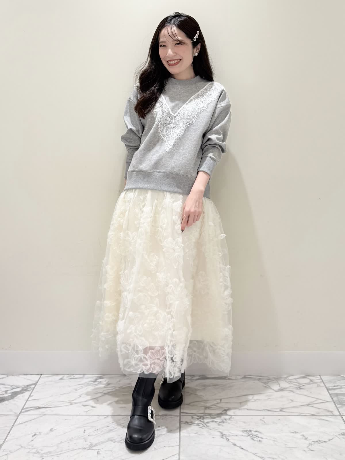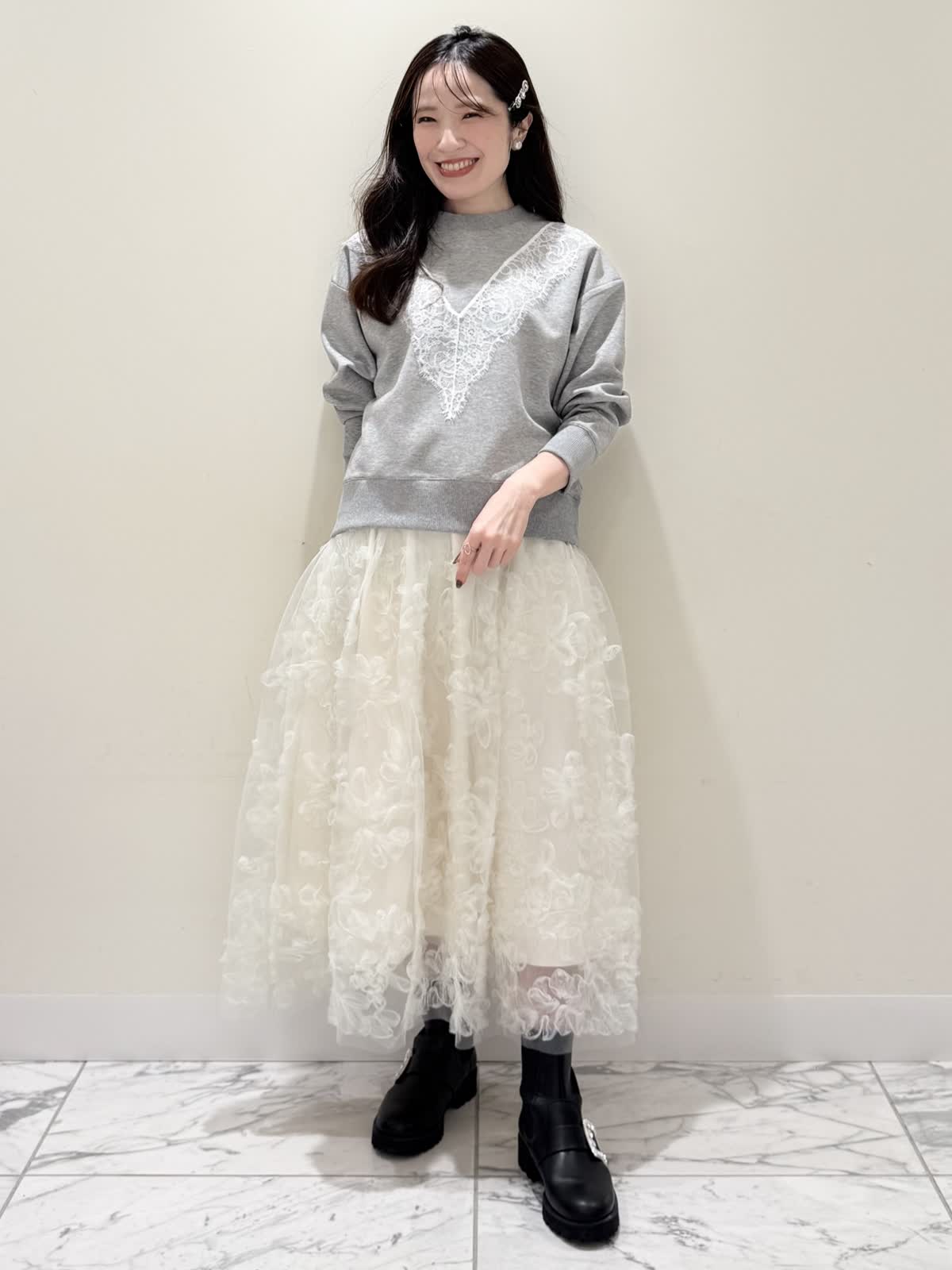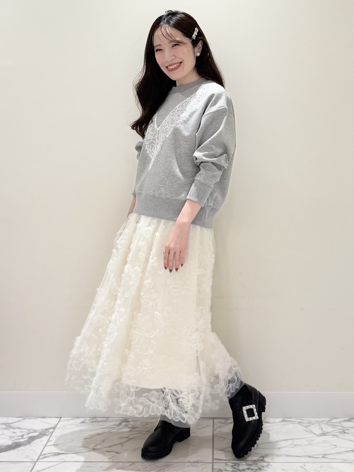 【着用サイズ/カラー】カットソー:9号/グレー スカート:7号/オフホワイト コート:7号/ピンク 可愛すぎる休日のお出かけコーディネート♪トップスはレースが可愛いスウェット生地のカットソー。肩線が落ちたシルエットでアームホールもゆったりなので着心地◎ 合わせはフラワー柄のチュールにその上から刺繍を施した可愛いすぎるチュールスカートです。ふわっと、とても軽く、ウエストは柔らかい総ゴム仕様でストレスフリーで履き心地◎いつものサイズで大丈夫ですが、コンパクトに履きたい方は1サイズ小さめでも◯アウターは贅沢にパールを散りばめたショート丈コート。とても軽い生地で羽織りやすく、アームホール&身幅共にゆったりしているので厚手のニットも着やすいです。いつものサイズで大丈夫ですが、コンパクトに着たい方は1サイズ小さめでも◯