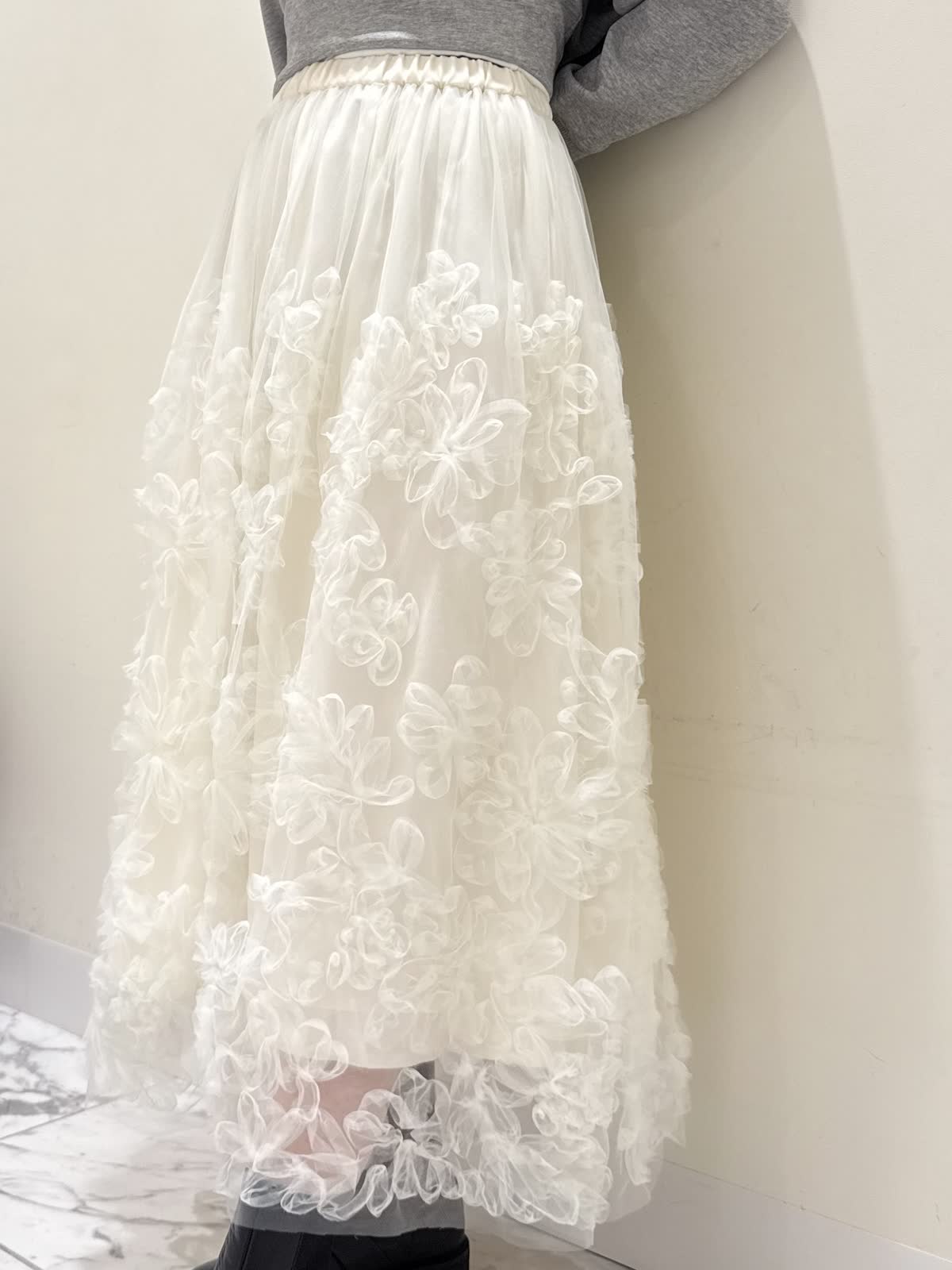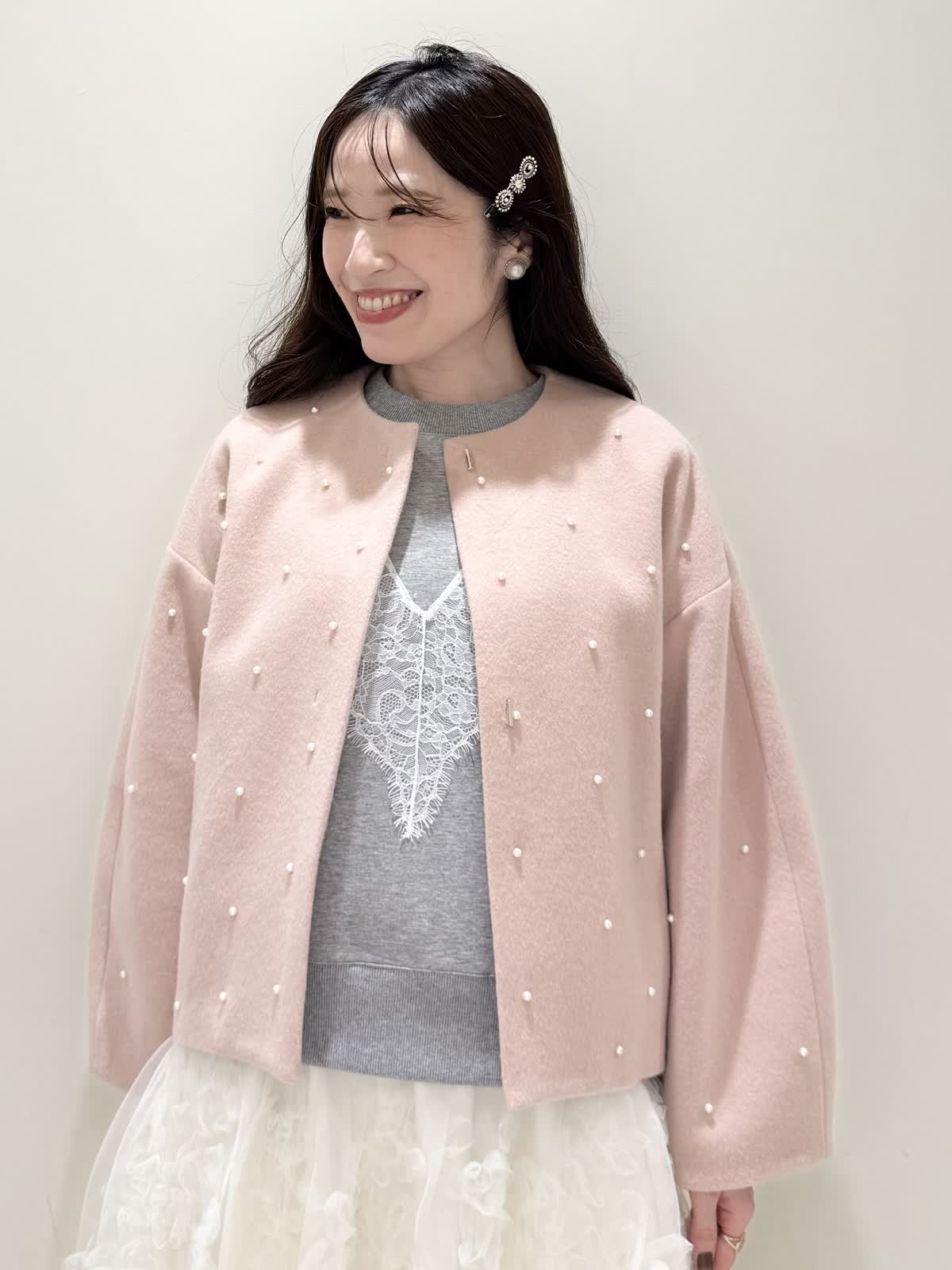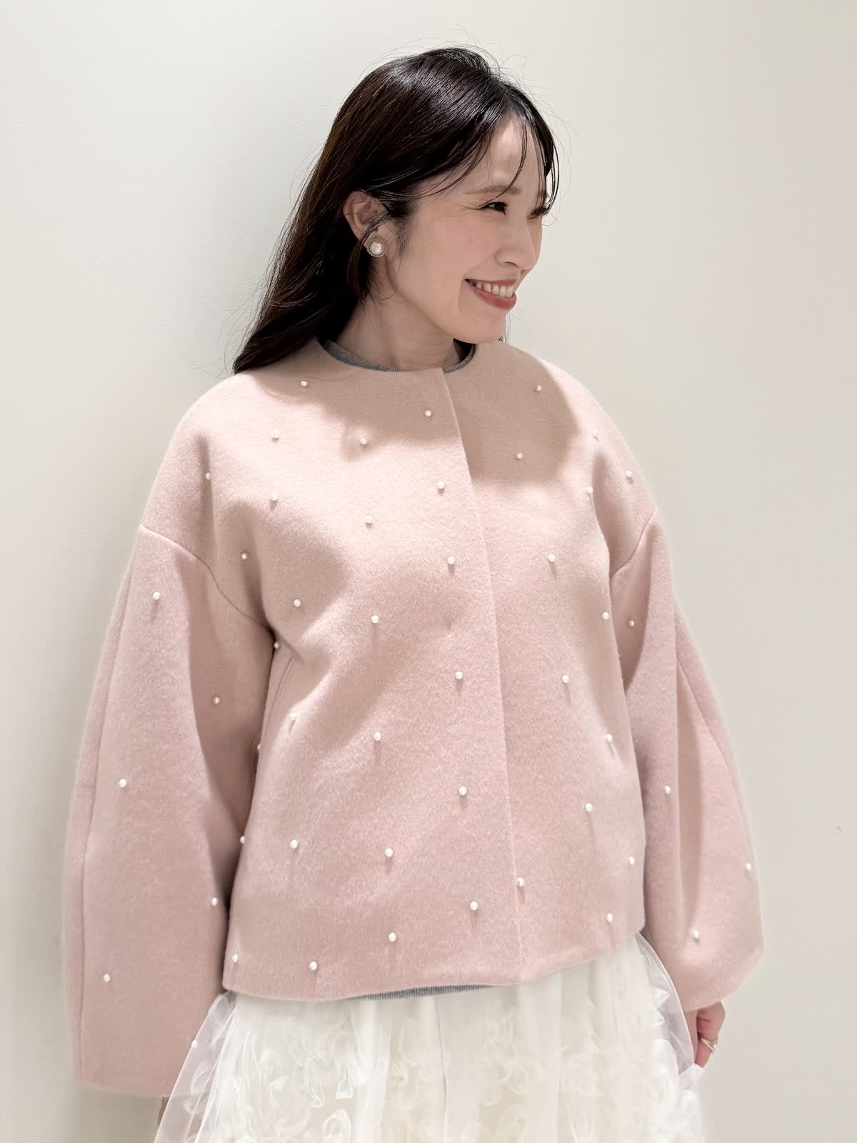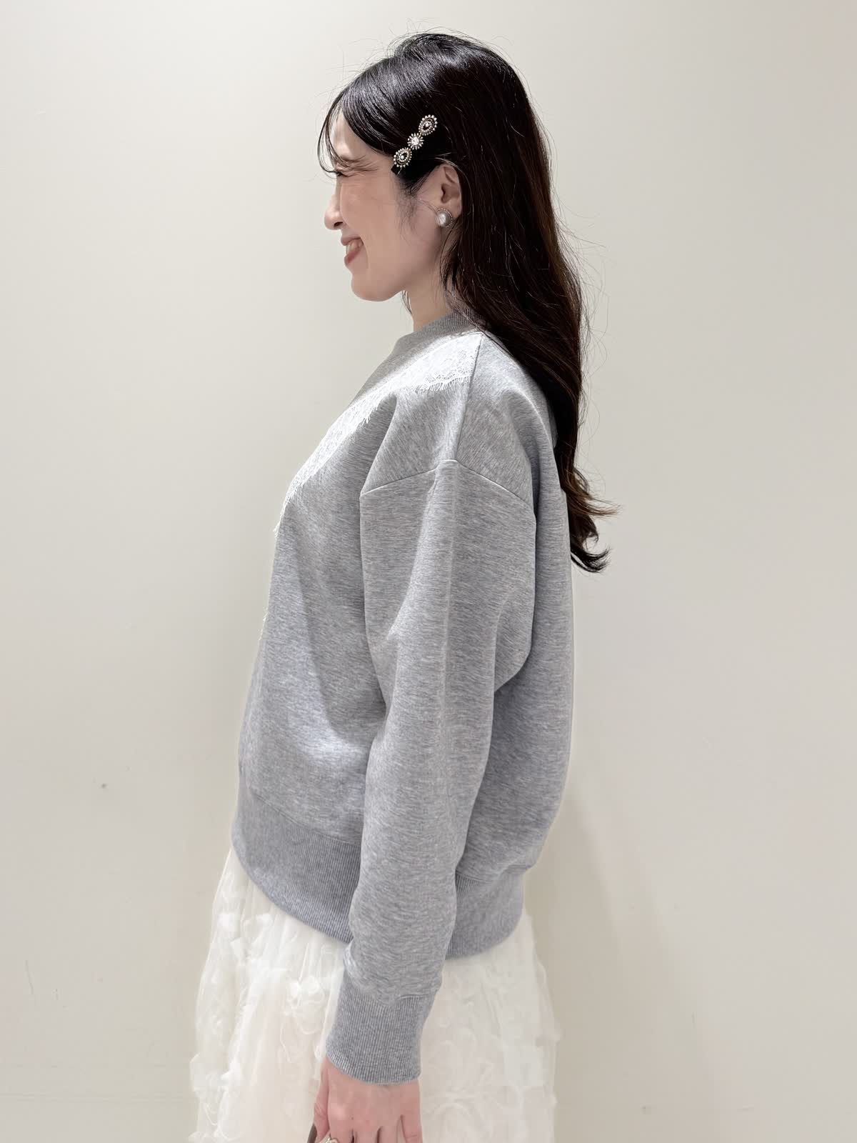 【着用サイズ/カラー】カットソー:9号/グレー スカート:7号/オフホワイト コート:7号/ピンク 可愛すぎる休日のお出かけコーディネート♪トップスはレースが可愛いスウェット生地のカットソー。肩線が落ちたシルエットでアームホールもゆったりなので着心地◎ 合わせはフラワー柄のチュールにその上から刺繍を施した可愛いすぎるチュールスカートです。ふわっと、とても軽く、ウエストは柔らかい総ゴム仕様でストレスフリーで履き心地◎いつものサイズで大丈夫ですが、コンパクトに履きたい方は1サイズ小さめでも◯アウターは贅沢にパールを散りばめたショート丈コート。とても軽い生地で羽織りやすく、アームホール&身幅共にゆったりしているので厚手のニットも着やすいです。いつものサイズで大丈夫ですが、コンパクトに着たい方は1サイズ小さめでも◯