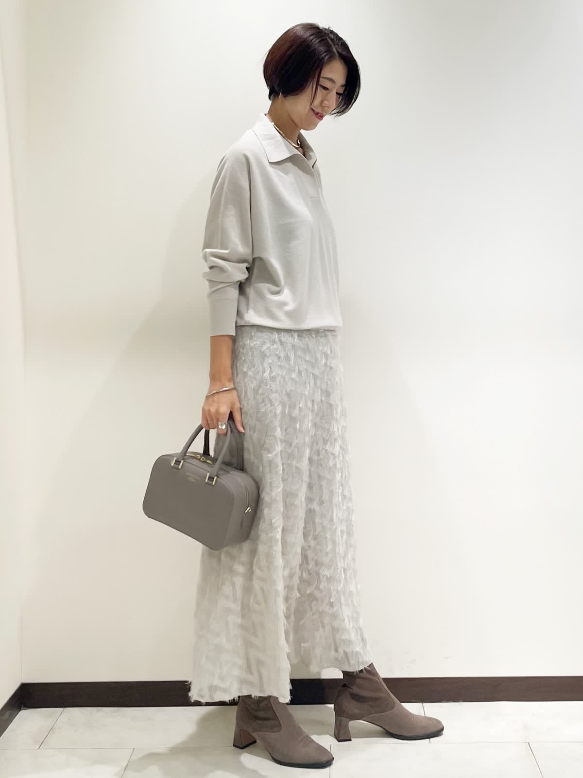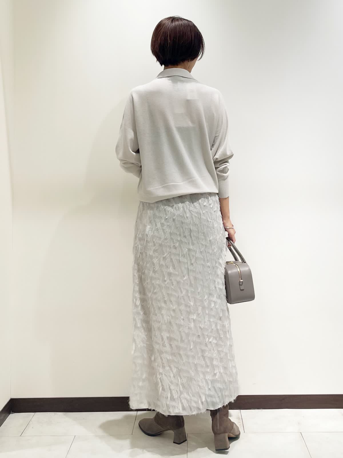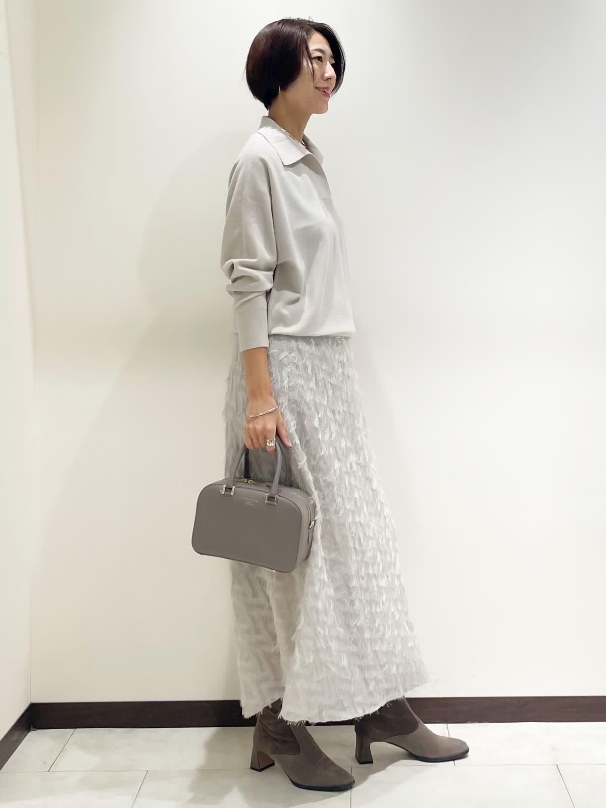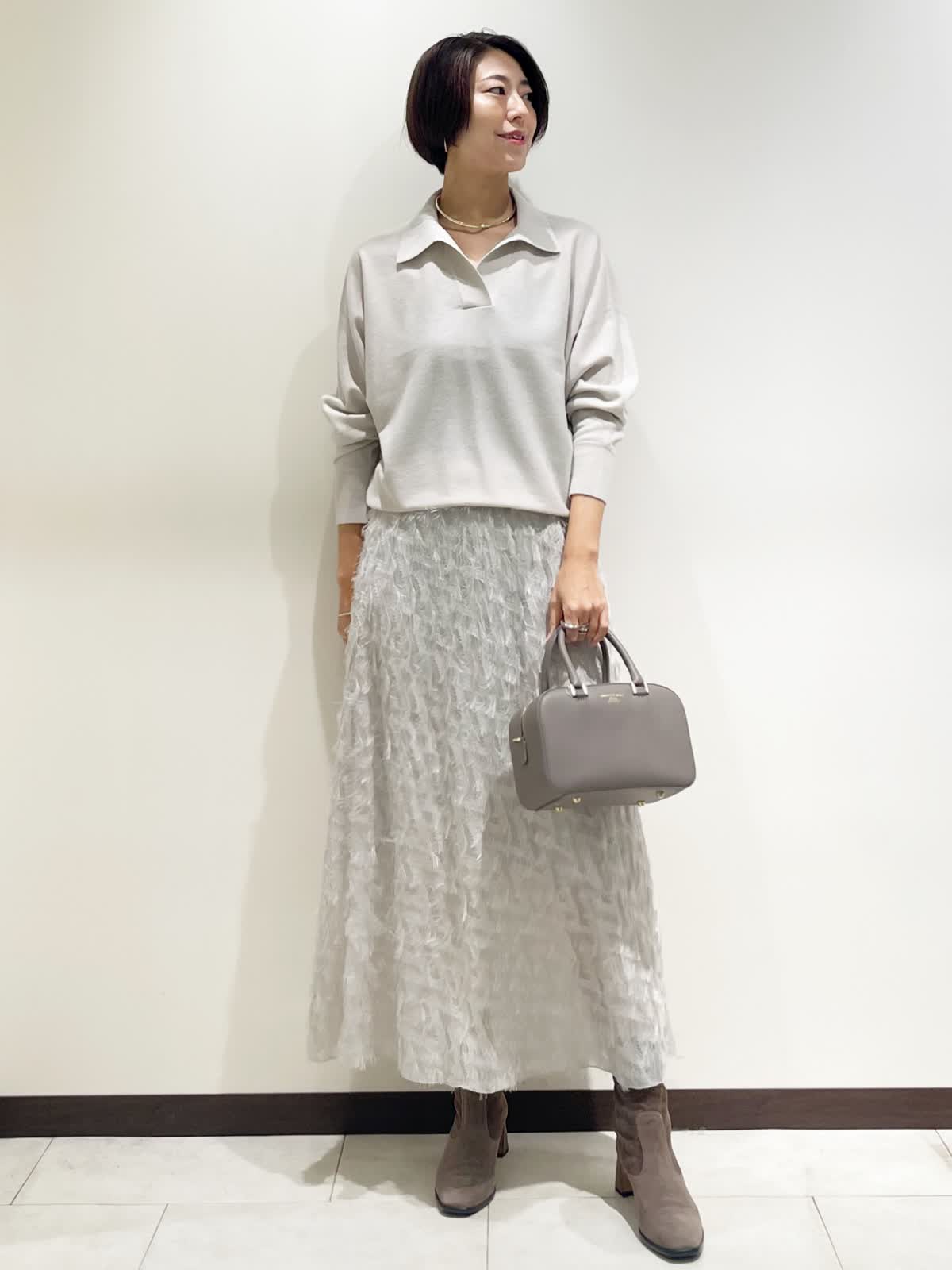 【着用サイズ】全て9号 【カラー】ニット:グレーベージュ スカート:グレー バック:グレーベージュ ネックレス:ゴールド 【コーディネートテーマ】 秋のニュアンスカラーコーデ ワントーンで上品なスタイリングに。 【サイズ感】 ニット:やや緩め チクチク感が無くとても着心地が◎ スカート:標準ウエストオールゴム フリンジとシアー素材が存在感あります。 163p 普段9号サイズ 骨格ウェーブで上半身に比べてヒップがやや大きい