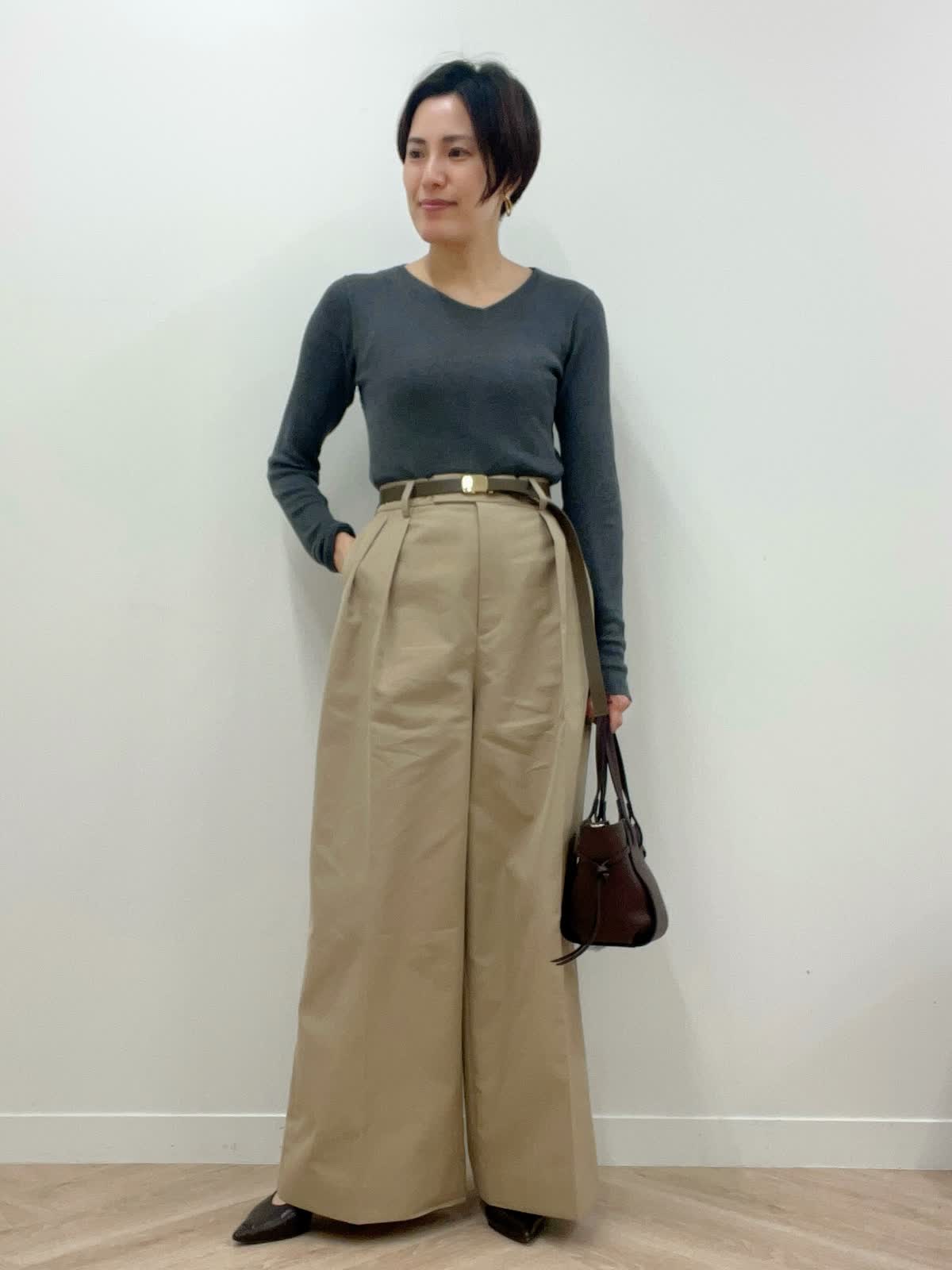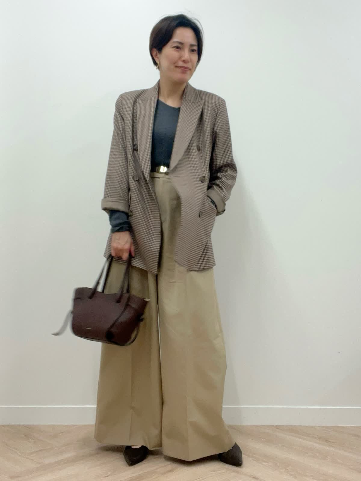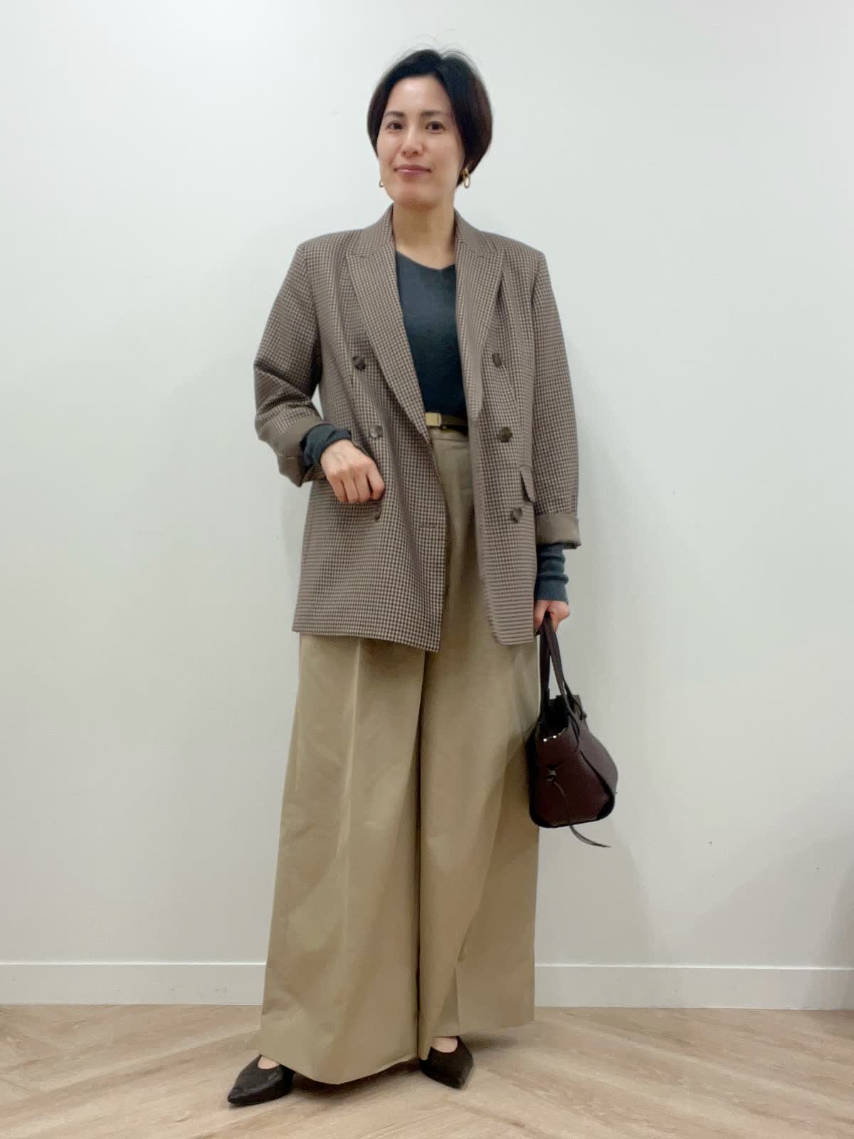 【着用カラー、サイズ】ジャケット:チェック ニット:チャコールグレー パンツ:ベージュ 全て9号 ライトアウター感覚でサラッと羽織れるダブルブレストジャケットスタイル 緩めのシルエットでカッチリとした印象になりすぎずお召しいただけます。太めのワイドパンツは存在感があり、今っぽくサマになりいつものパンツスタイルをアップデートできる優秀アイテム。