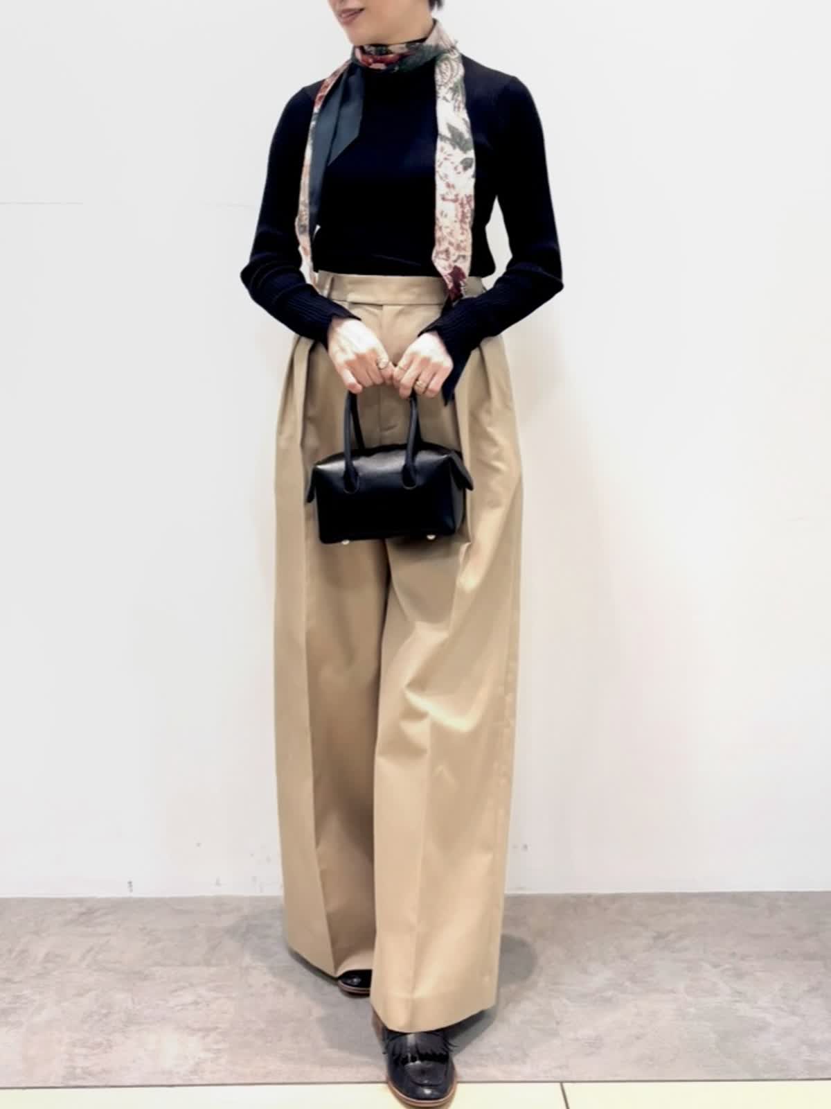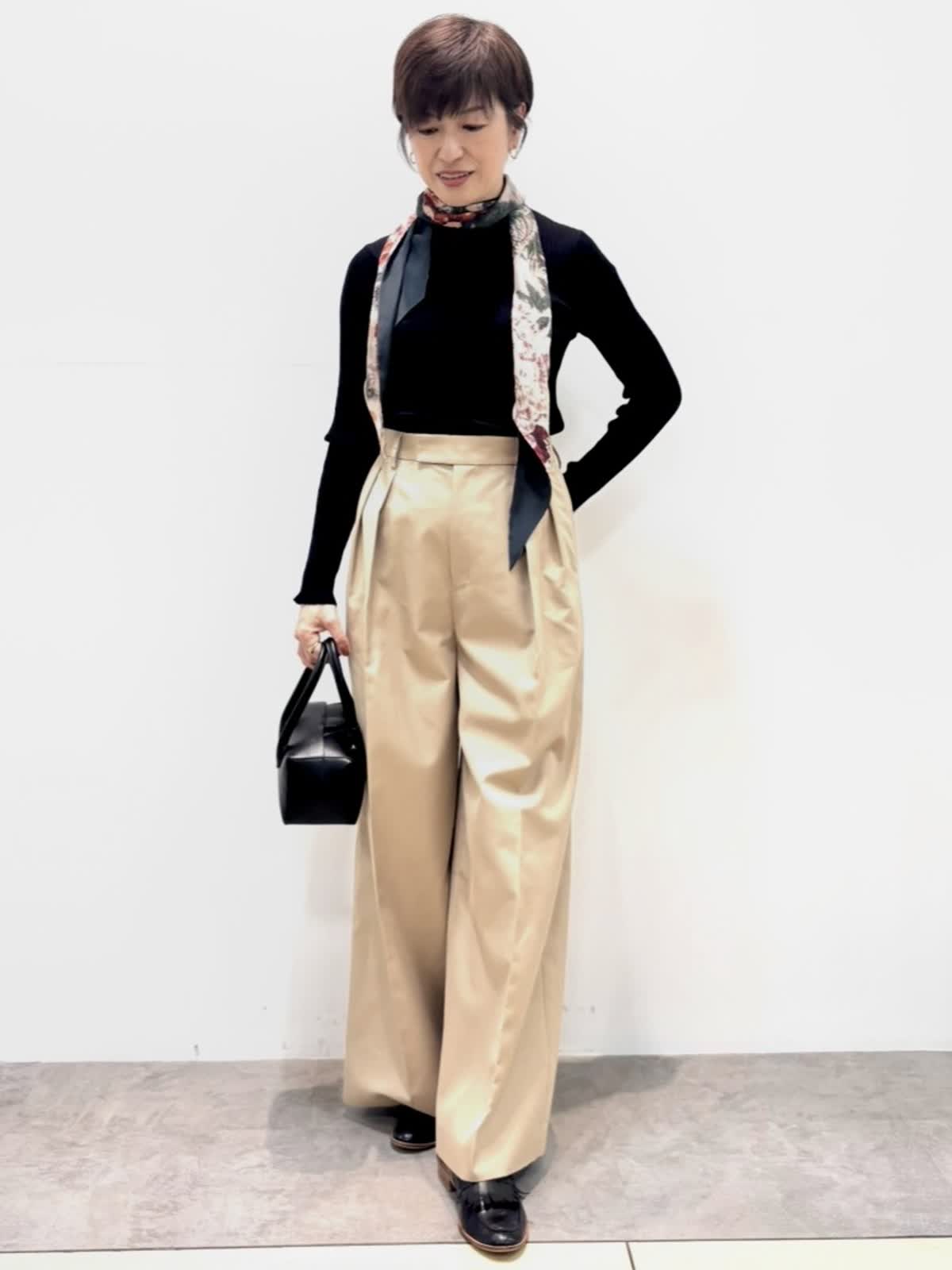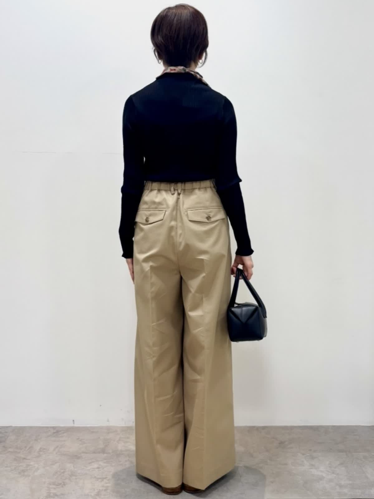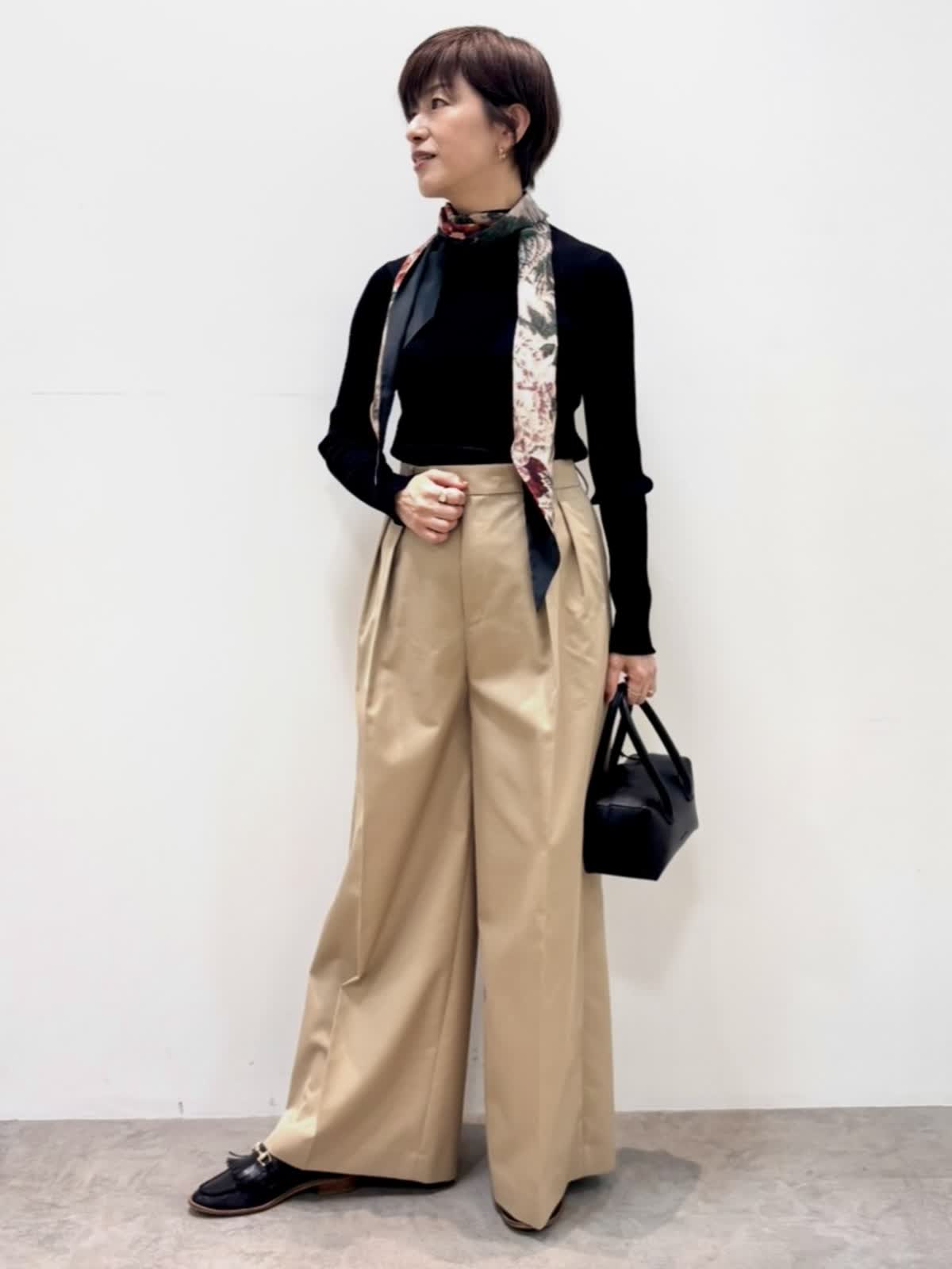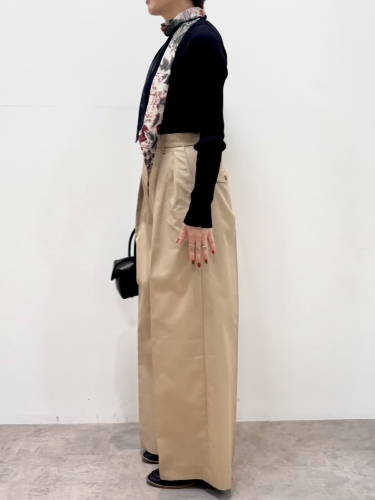[着用サイズ]ニット::9号 パンツ:9号 [着用カラー]ニット:ブラック パンツ:ベージュ シアー感のある薄手のニットは1枚でもインナーとしても活躍します。 三尋木さんとのコラボのチノパンツはワイドレッグがカッコいい印象です。股上も深めで履きやすいです。ハリのある生地感でポリエステル混なのでシワにもなりにくいです。