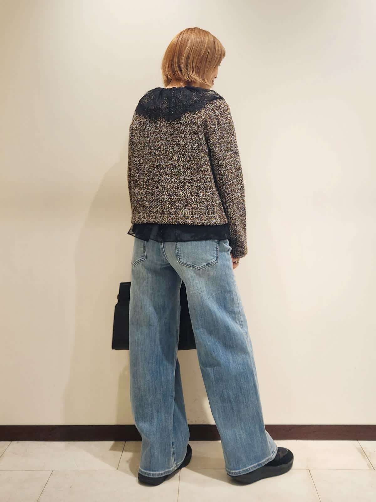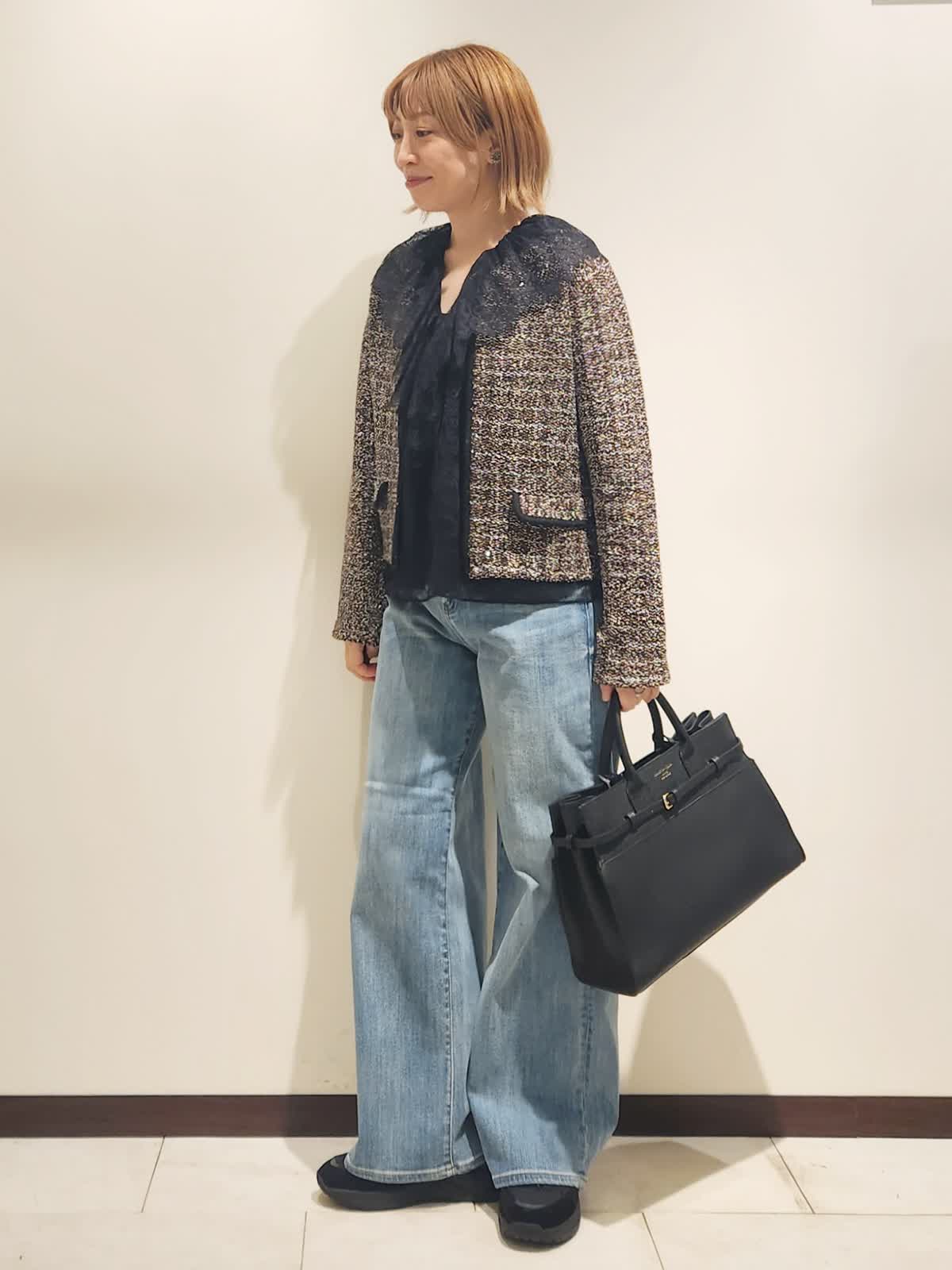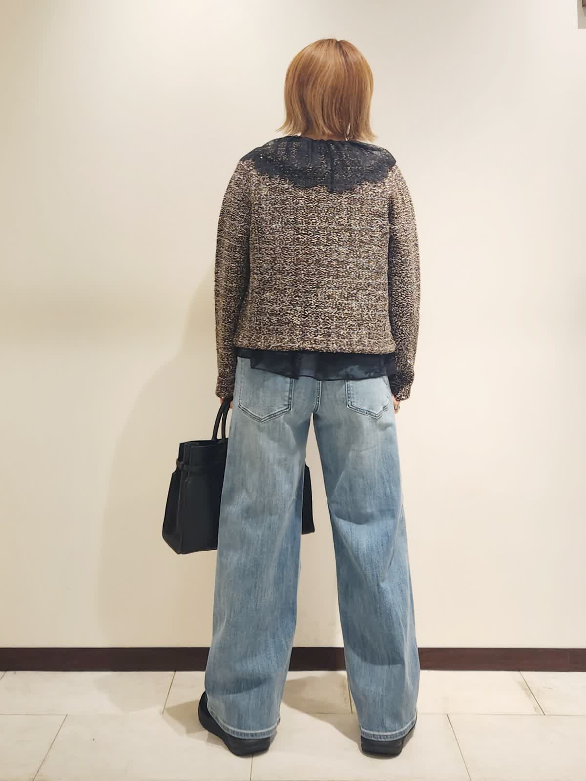 【着用イズ】すべて9号 【着用カラー】レースベスト:ブラック カーディガン:ブラウン デニム:サックス いつものデニムスタイルはツィード×レースで季節を楽しめるコーディネートに仕上げました。異素材の組み合わせを味わえる季節だからこそ欲張りに...ツィードカーディガンはニットならではのデイリー使いに○ レースベストはインナーに合わせ襟元をポイント使いにしました!! バックは大きめで存在感をプラス。