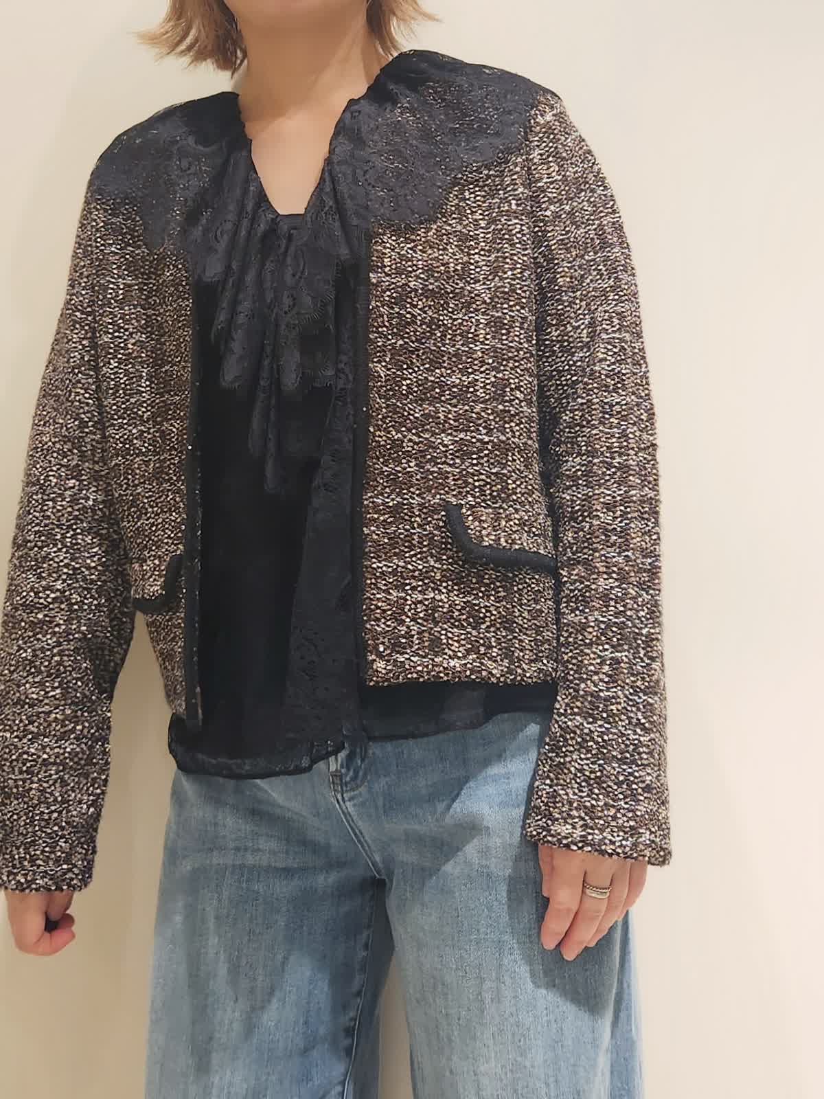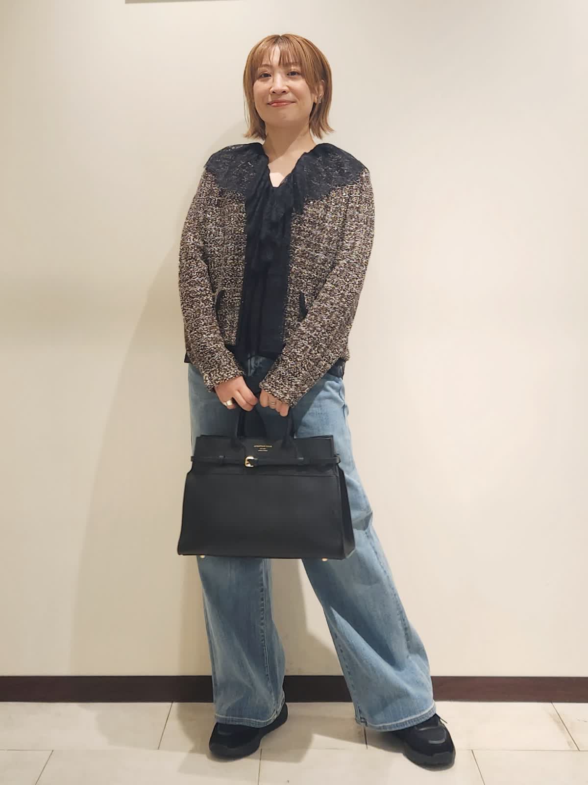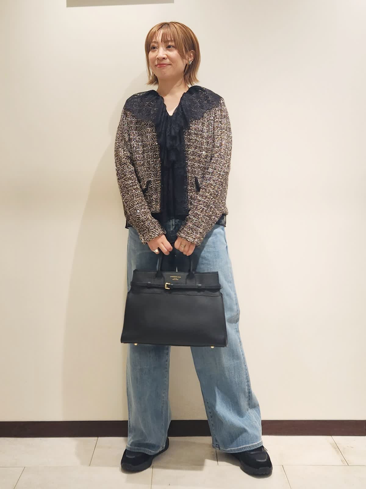 【着用イズ】すべて9号 【着用カラー】レースベスト:ブラック カーディガン:ブラウン デニム:サックス いつものデニムスタイルはツィード×レースで季節を楽しめるコーディネートに仕上げました。異素材の組み合わせを味わえる季節だからこそ欲張りに...ツィードカーディガンはニットならではのデイリー使いに○ レースベストはインナーに合わせ襟元をポイント使いにしました!! バックは大きめで存在感をプラス。