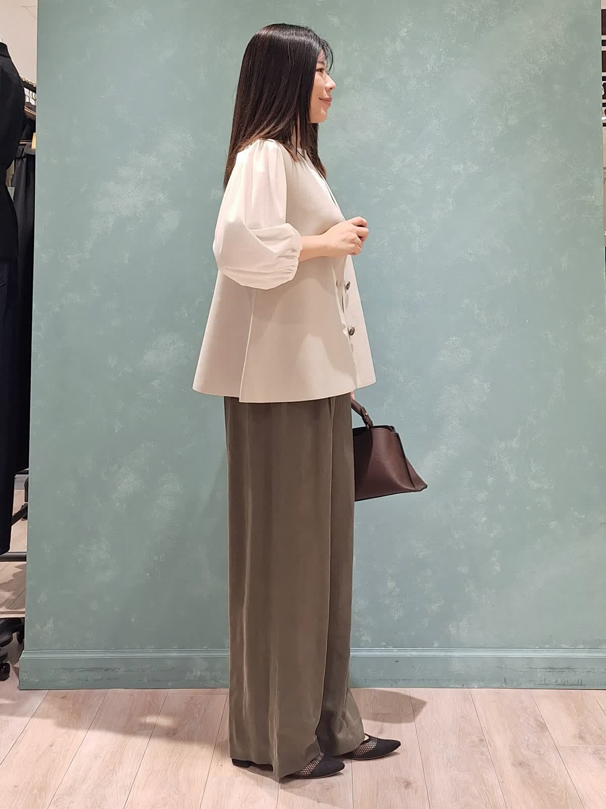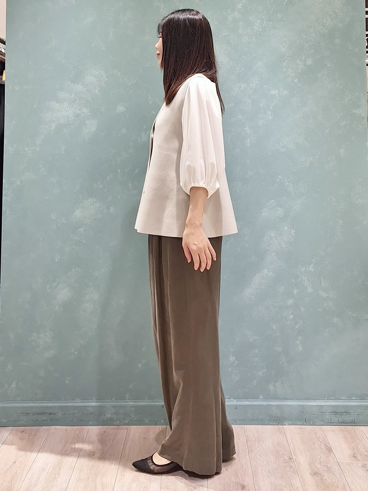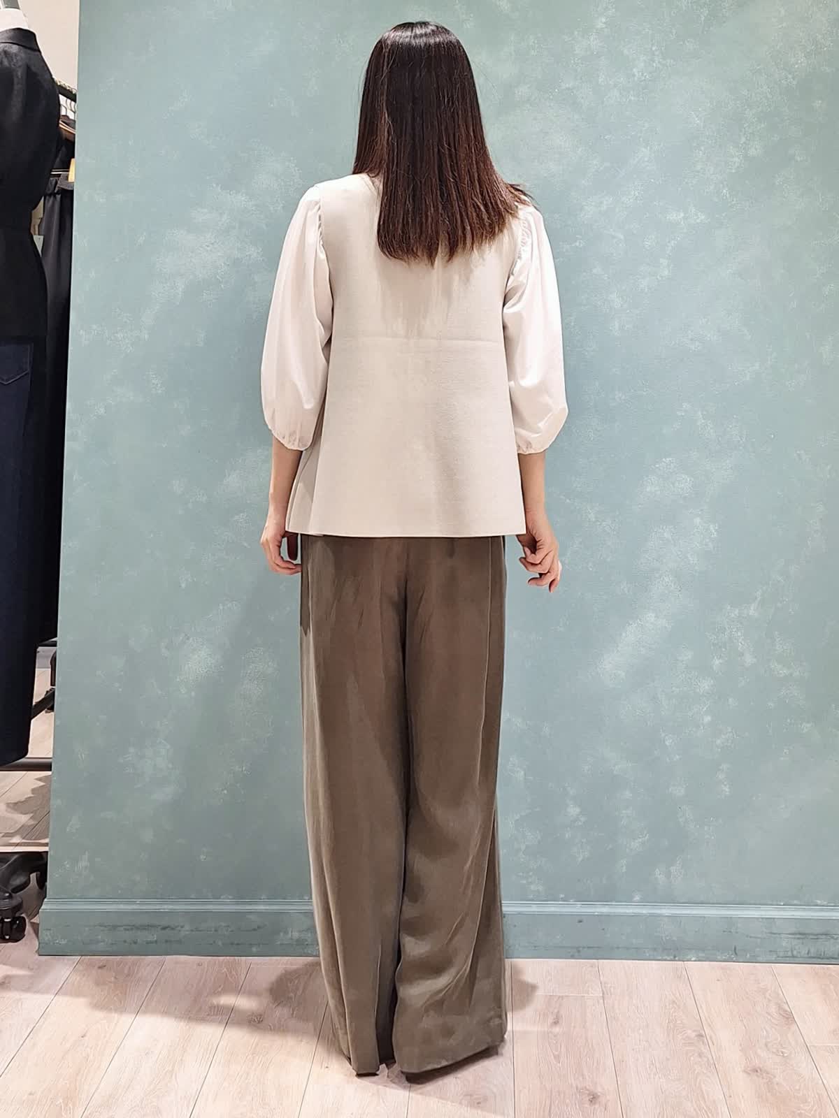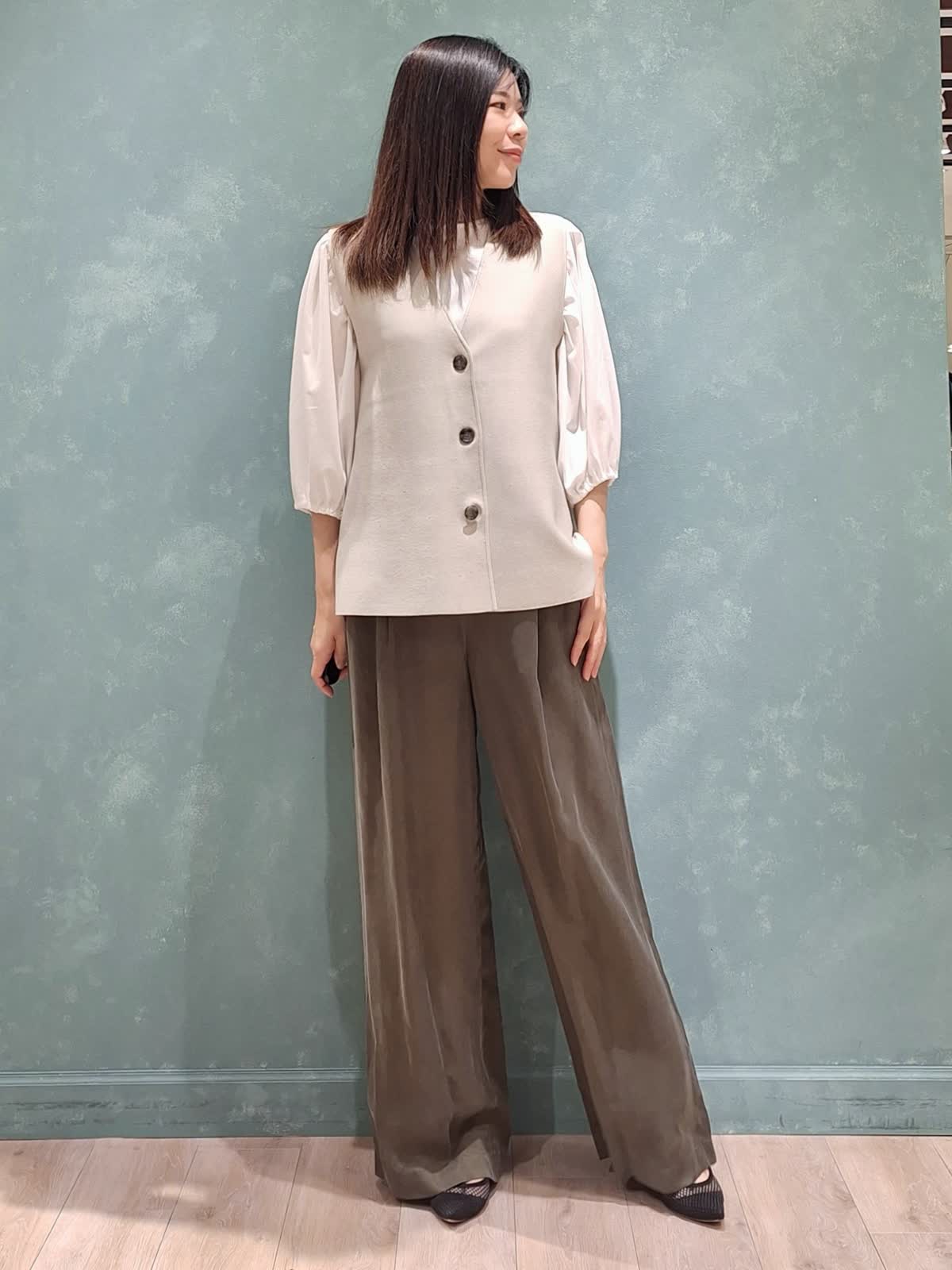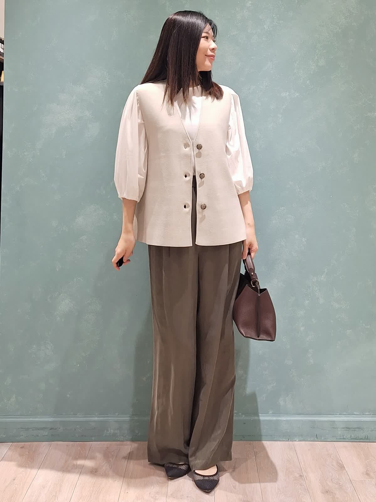 【着用サイズ、カラー】ジレ:9号、グレー カットソー:9号、オフホワイト パンツ:7号、カーキ 休日カジュアルスタイル。ロングシーズン活躍するミラノリブニットジレ。張りのある生地で、Aラインがキープできます!夏はノースリーブで、秋は七分や長袖インナーをレイヤードして着回しを楽しめます♪今回はジャストで着れるコーディネートで、インナーはパフスリーブカットソー、ボトムはキュプラ素材のリラックスストレートパンツを合わせました。日中に丁度良くお召しいただけると思います。