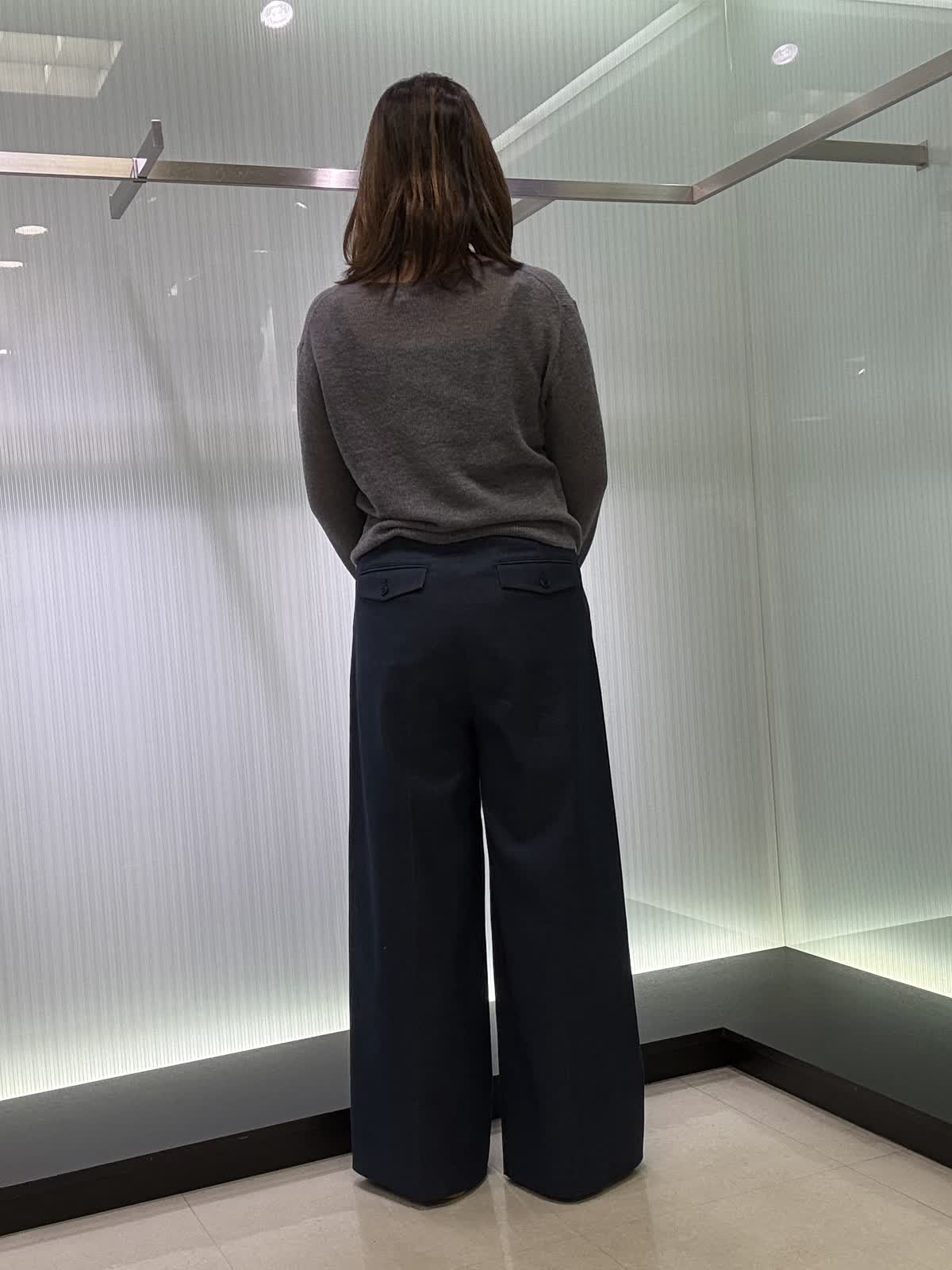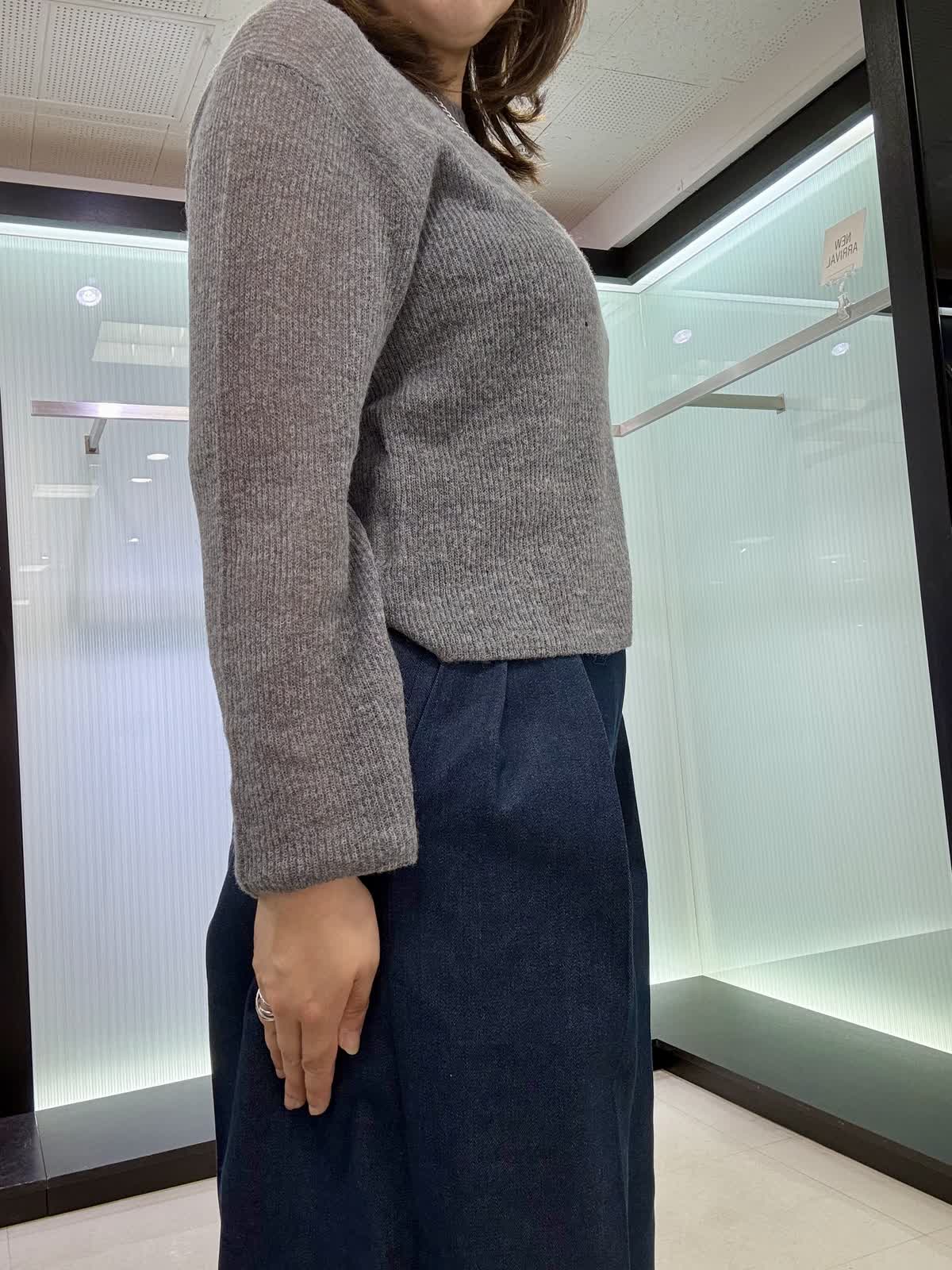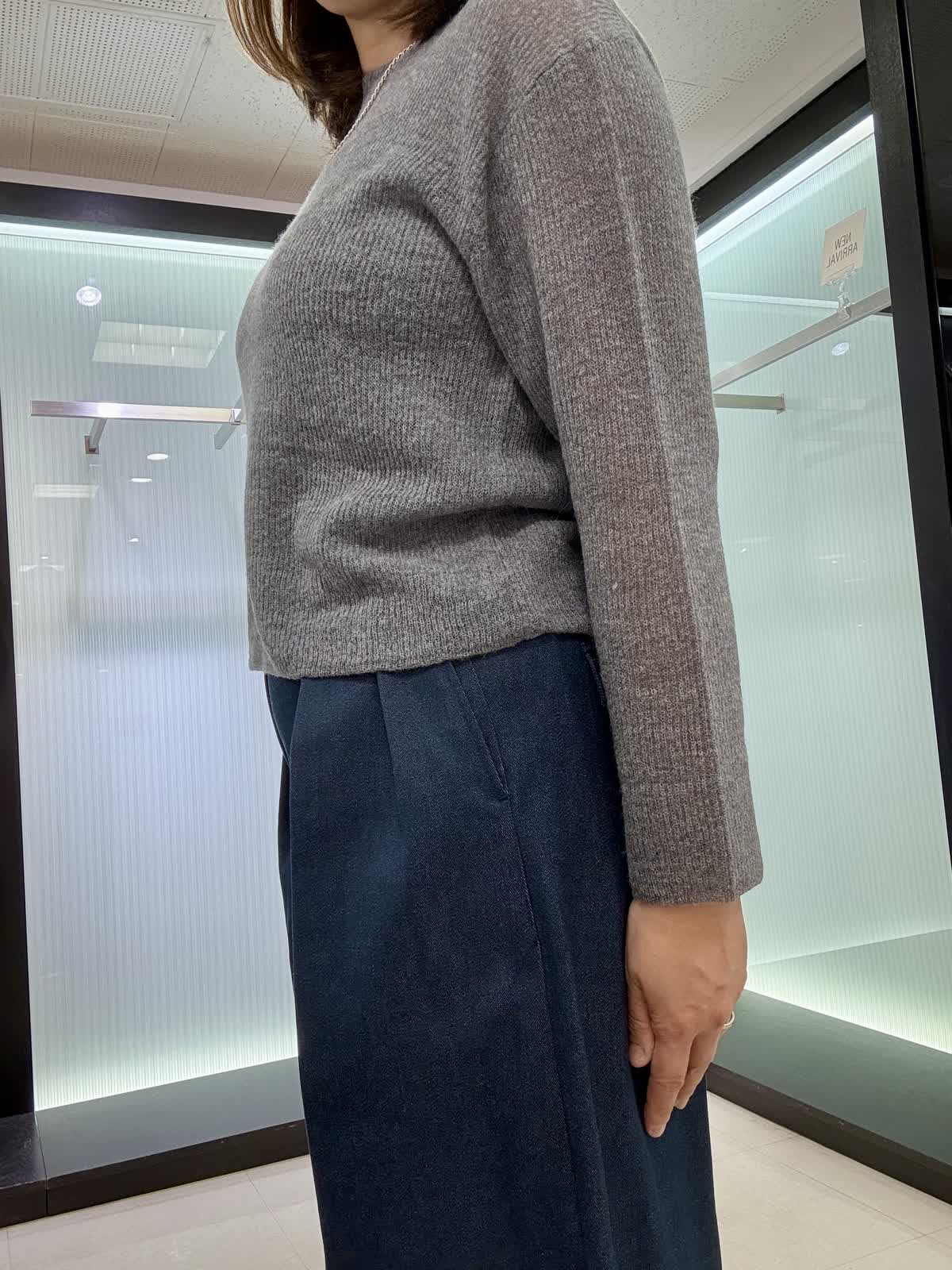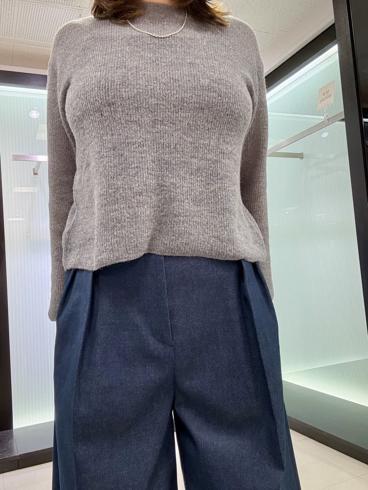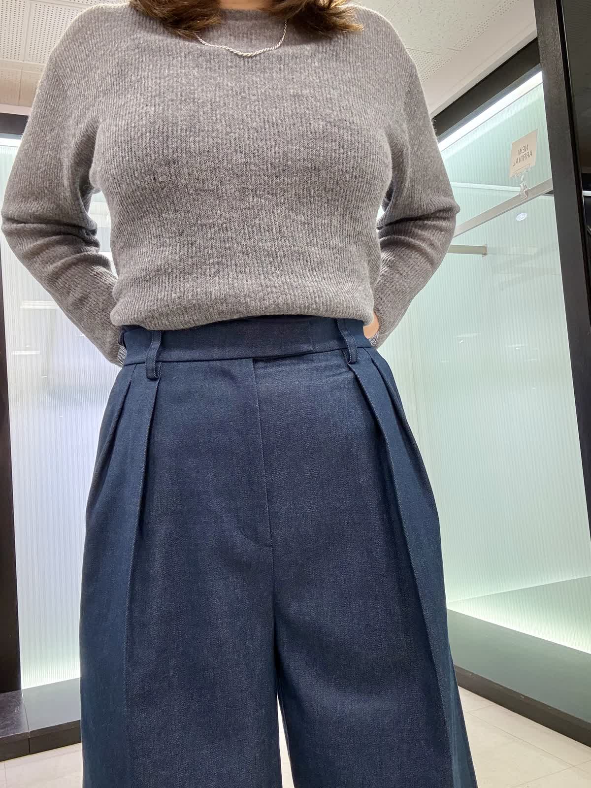 ニット着用サイズ9号 シアー感がトレンドのボートネックのニットになります。ウール素材なので伸縮性もあり、薄手ながらも暖かいです。パンツ9号 三尋木さんコラボ商品で、ワイドパンツです。ウエストがキュッと細くなっていてヒップとの差があり脚長効果もバッチリです! 生地感はしっかりしてますが、重さは無く軽いです。いつも11号ですがこちらは9号で大丈夫でした。