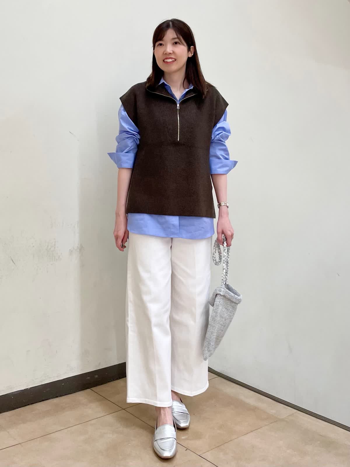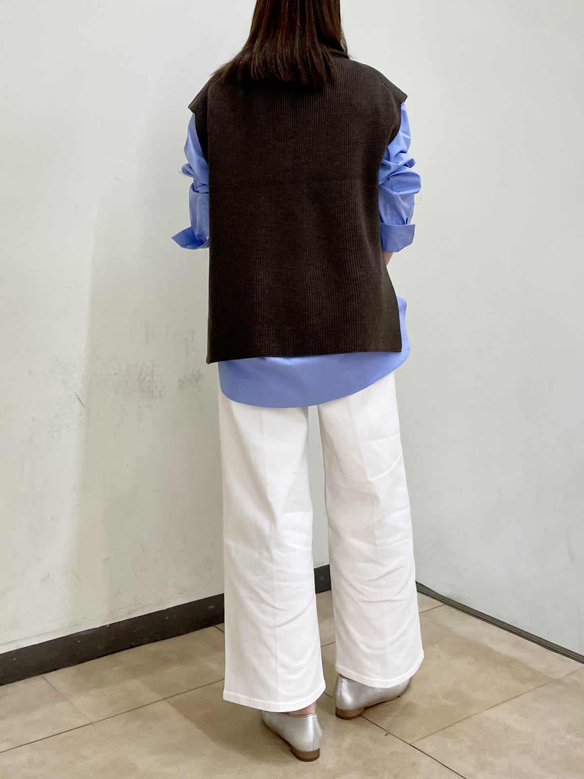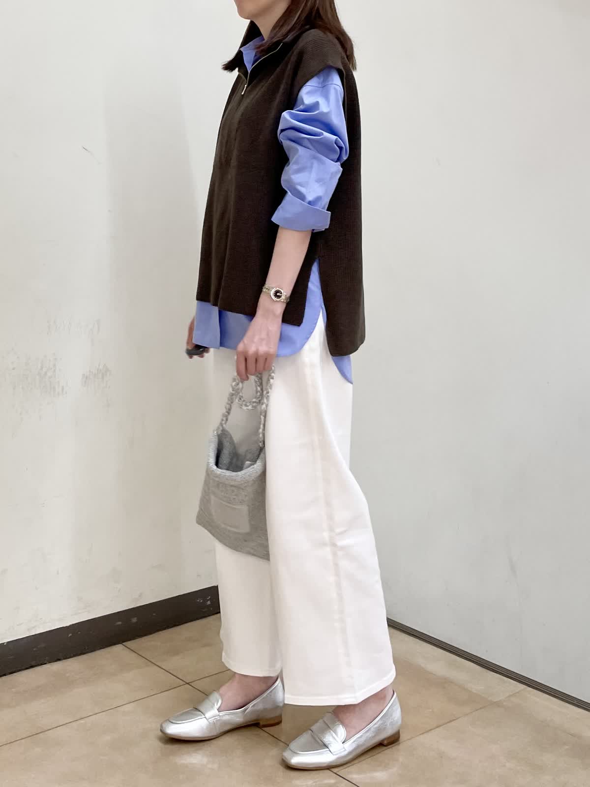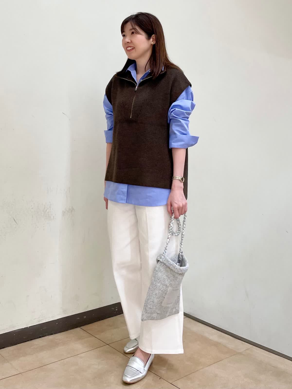 【着用サイズ】ニット:フリー ブラウス:フリー パンツ:9号 ふっくらとした畦目でリッチ感のあるハーフジップのニットジレ。シャツを重ねたレイヤードスタイルです。シンプルなコーディネートもジレをプラスするだけでオシャレに見えます。