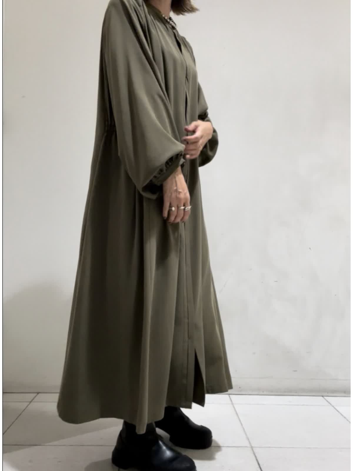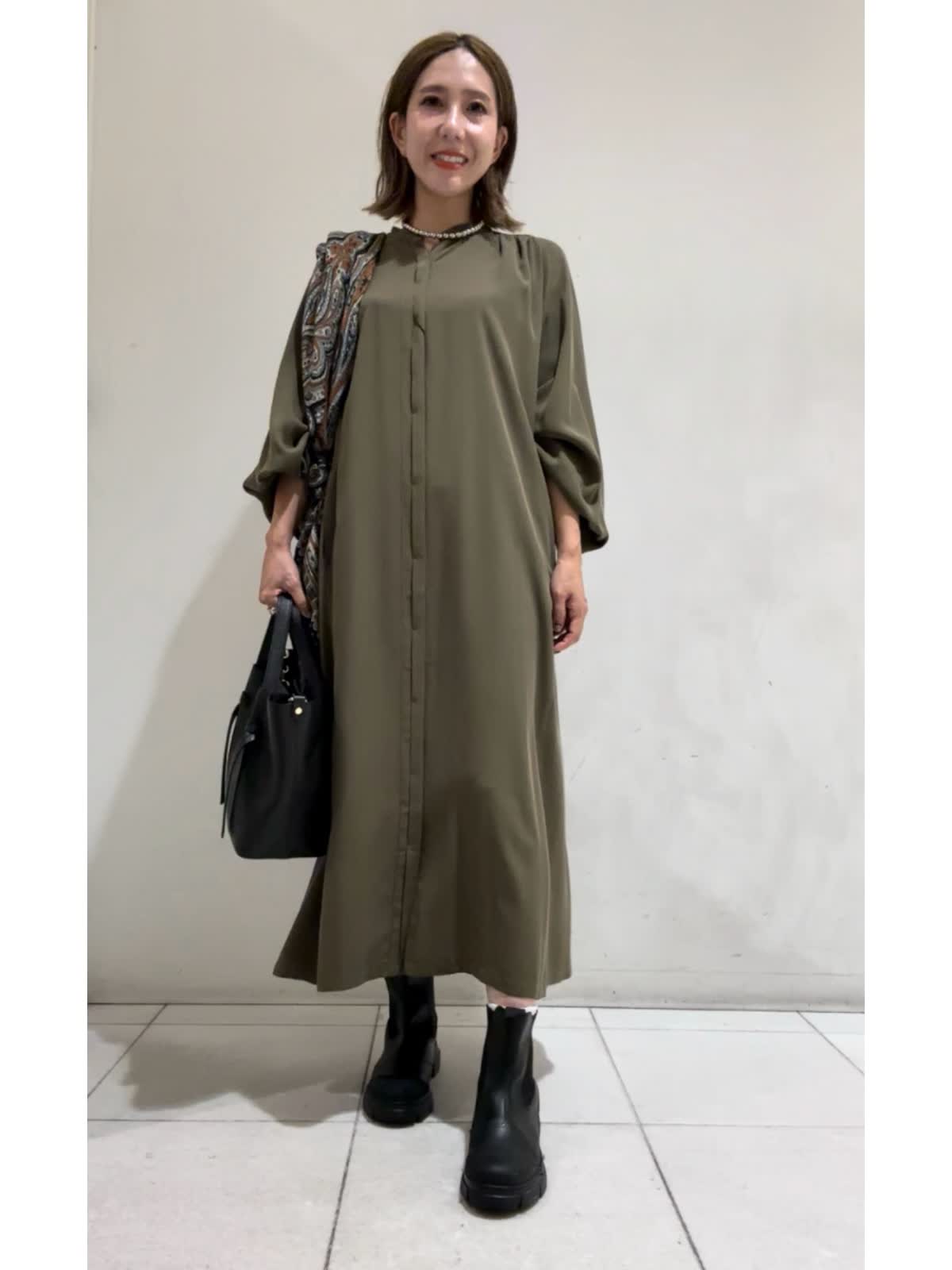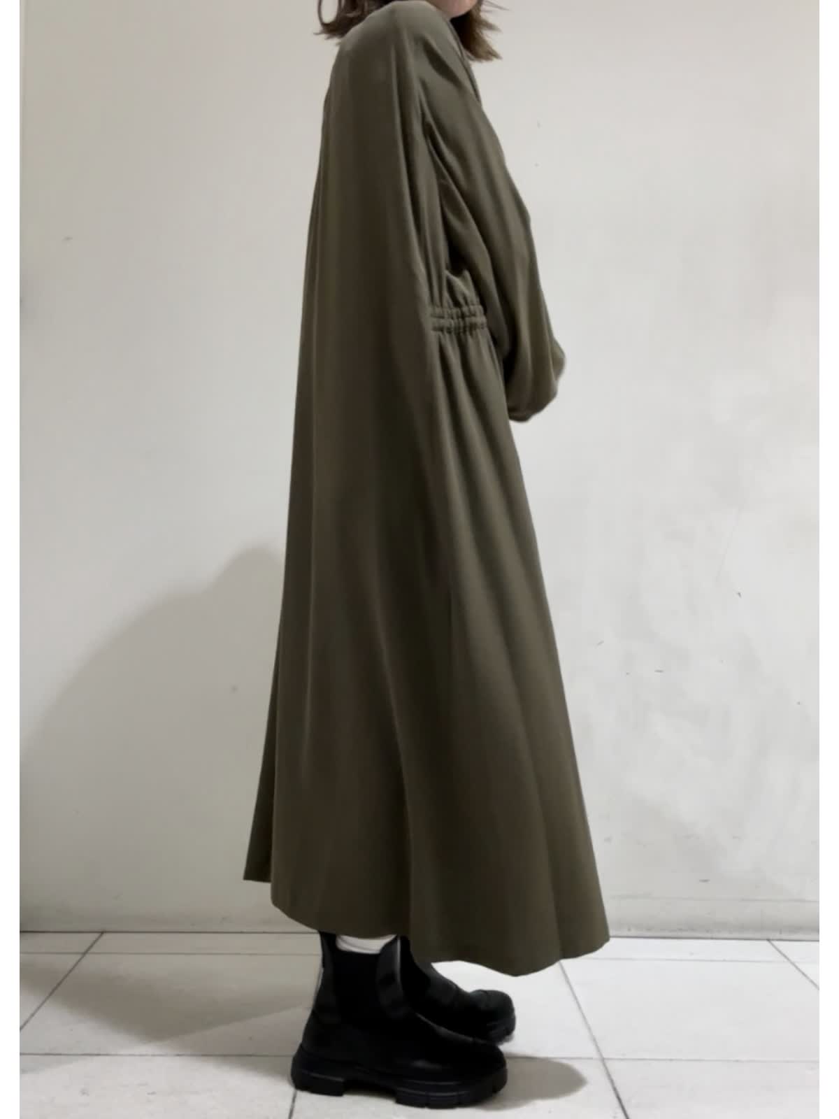 【着用カラー】ワンピース:カーキ【サイズ】フリー らくちんお出掛けワンピース。袖のたぷっとしたデザインが印象的で1枚で様になるワンピース。羽織りとしても着用いただけます。