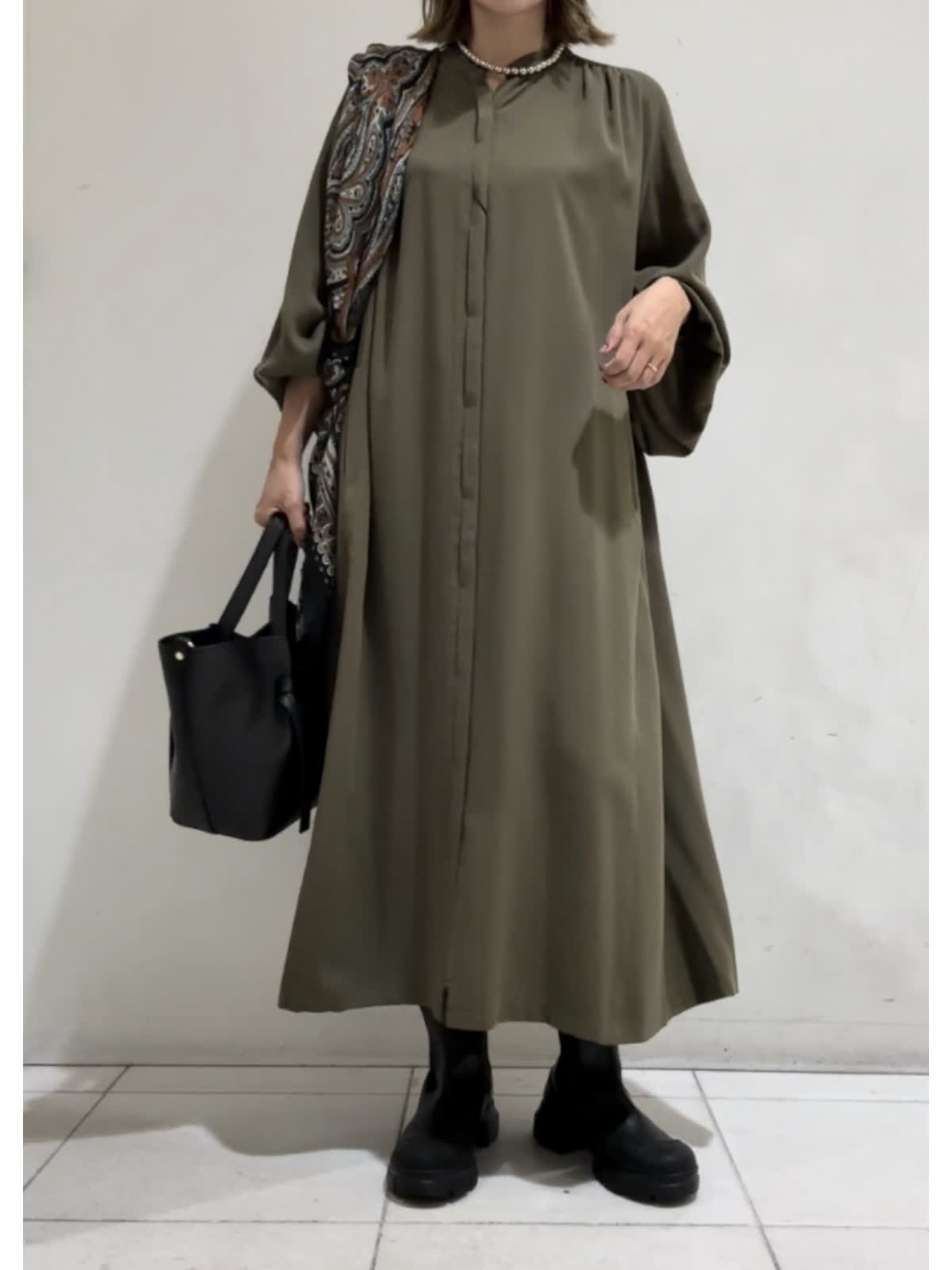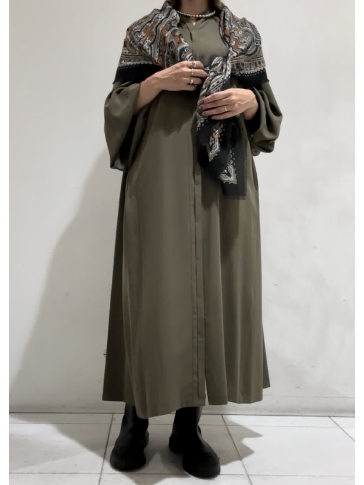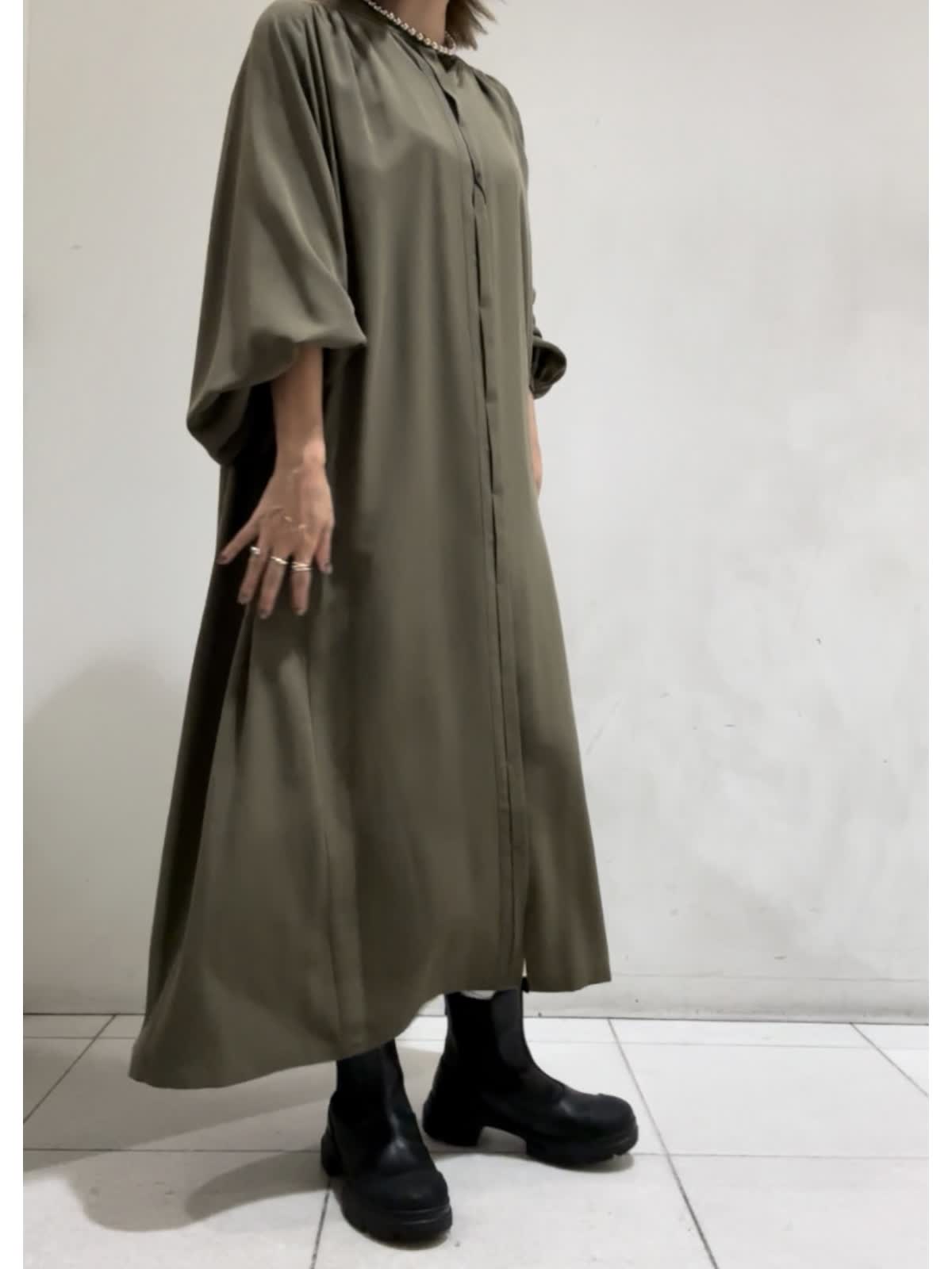【着用カラー】ワンピース:カーキ【サイズ】フリー らくちんお出掛けワンピース。袖のたぷっとしたデザインが印象的で1枚で様になるワンピース。羽織りとしても着用いただけます。