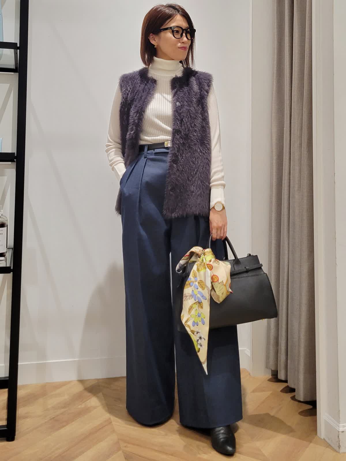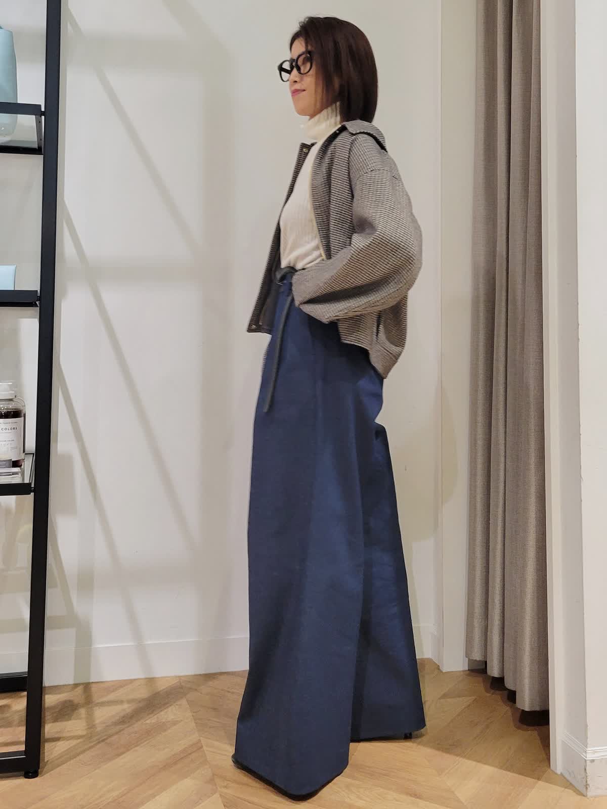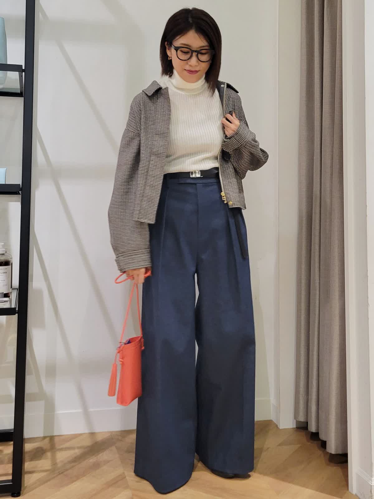 【着用サイズ】ニット:グレーベージュ:9号 パンツ:ダークネイビー:7号 ファージレ:チャコールグレー:9号 ブルゾン:柄小:9号 厚みの出にくい今年のファージレは今までゴツく見えそうで苦手だった方も取り入れやすいデザインに。大人気シリーズのタートルネックは配色タイプがとにかく人気。無くなる前に是非ゲットしていただきたいアイテムです。はだ触りがよく程よい厚み。静電気がおきにくいのもポイントです。合わせたのは三尋木さんコラボパンツ。このワイド感が唯一無二なフォルム。これをはくだけで一気にお洒落感up。シンプルにニットだけ合わせも◎アウターをプラスしても使えるので長い期間使えるコーデにしてみました。