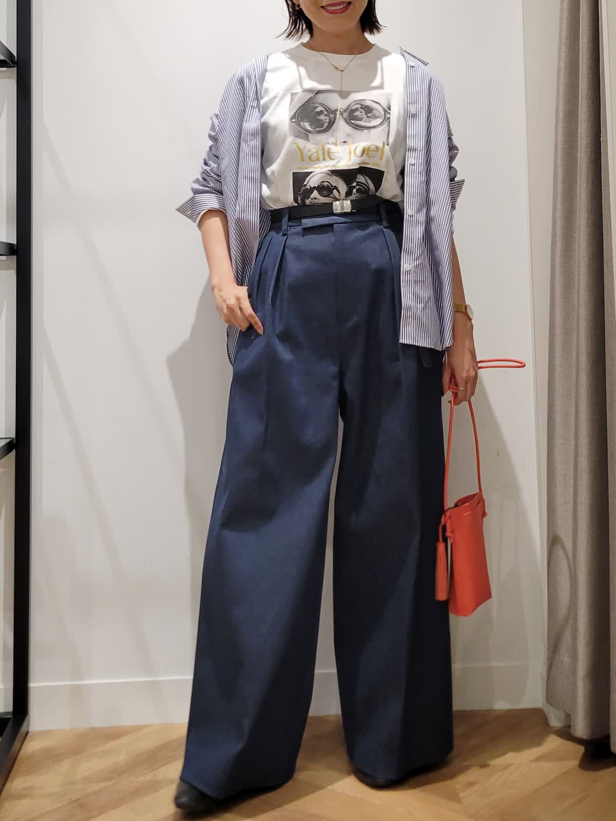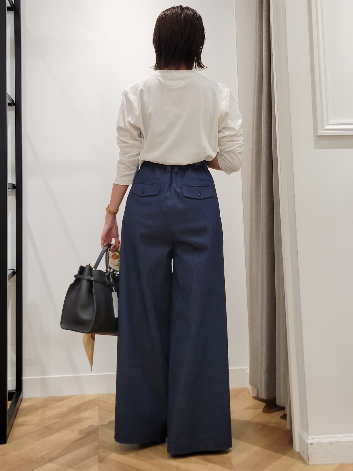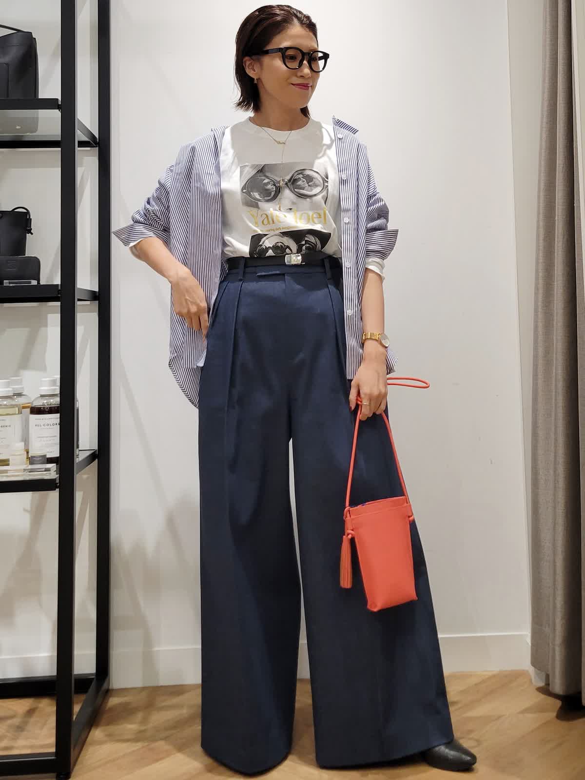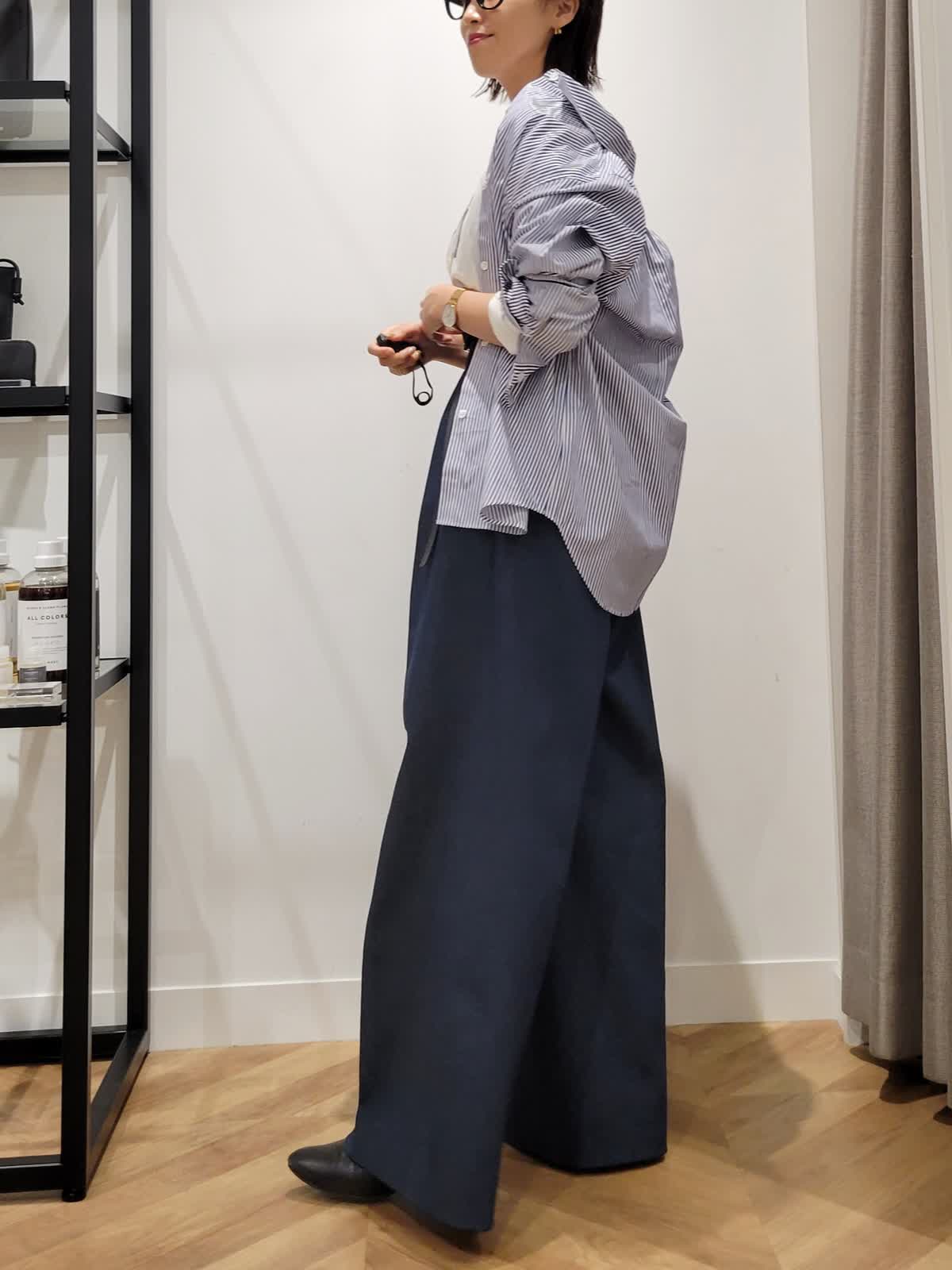 【着用サイズ】カットソー:オフホワイト:9号 パンツ:ダークネイビー:7号 ブラウス:ストライプ:9号 三尋木さんコラボパンツ。ハイウエストのワイドシルエットがかっこいい。ウエストのタックでお腹をカバーしつつ細見えがかなう。デニムですがきれい目コーデにも使える一着。いつもより丈は長めでした。ストライプシャツとフォトロンTで気温差対応コーデに。シャツはゆるりと羽織ってこなれ感プラス。是非挑戦してみてください。