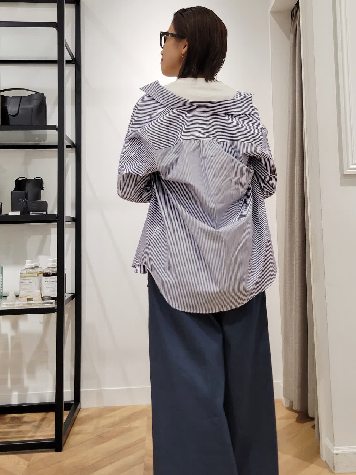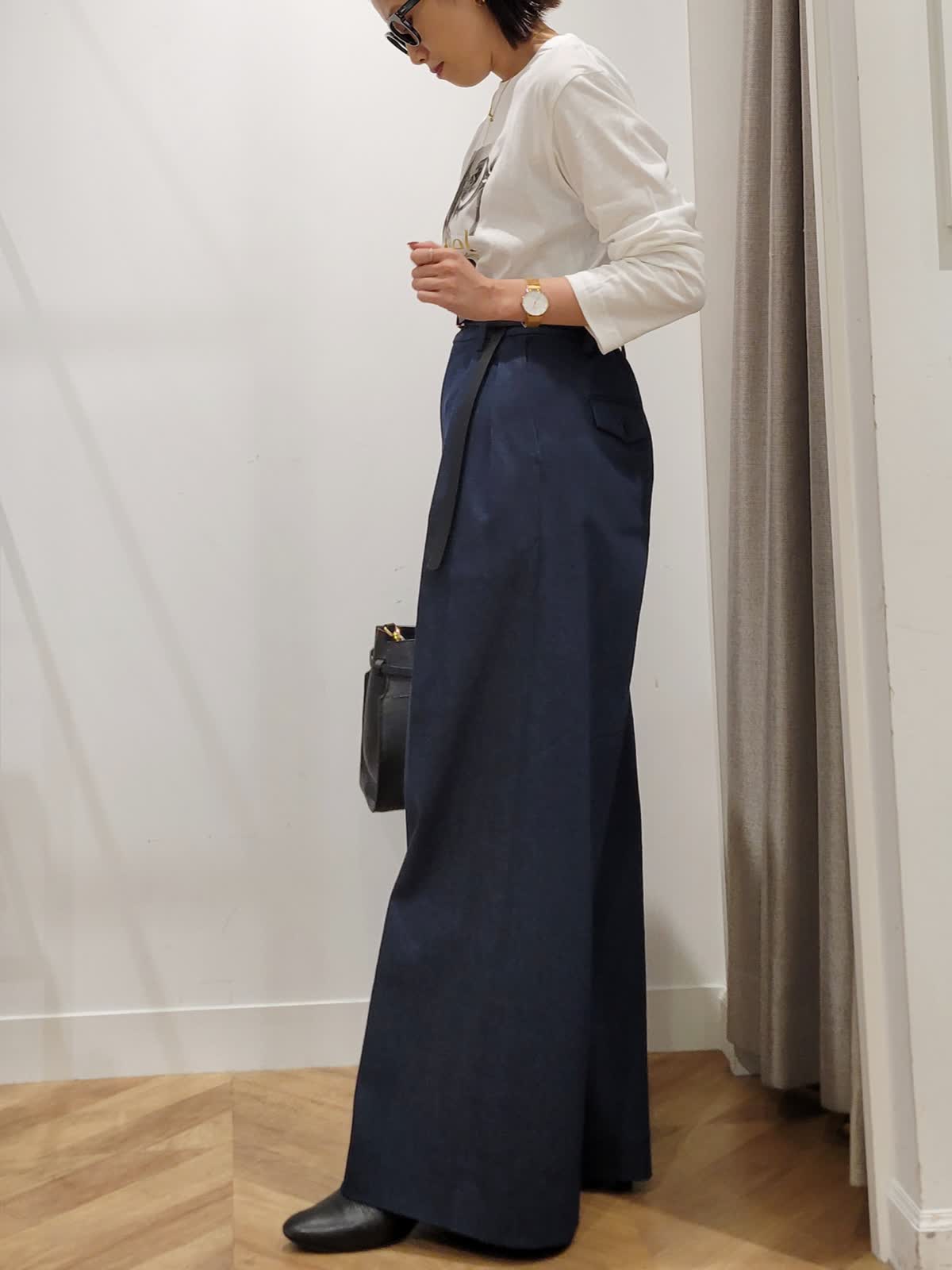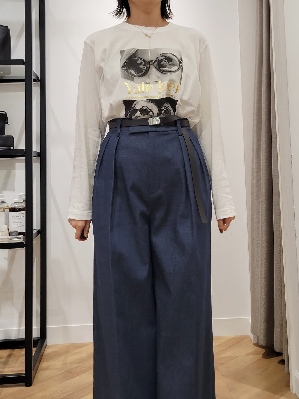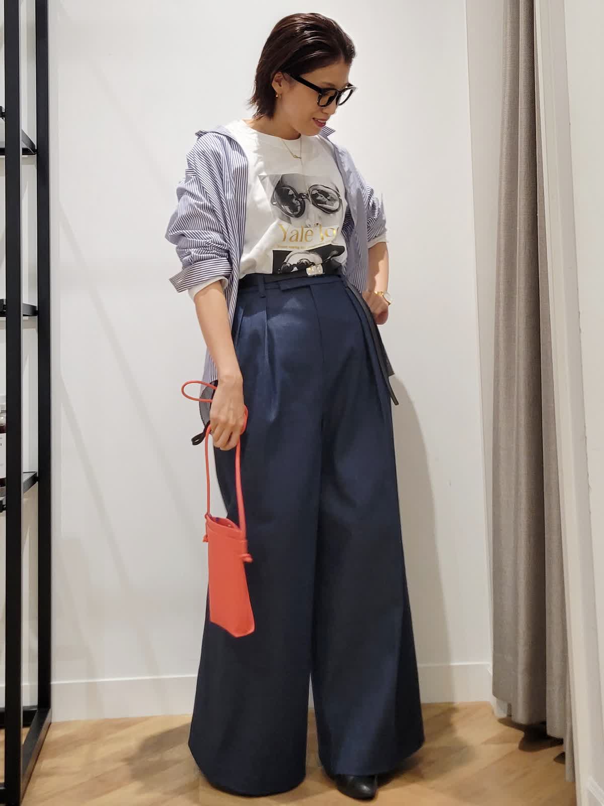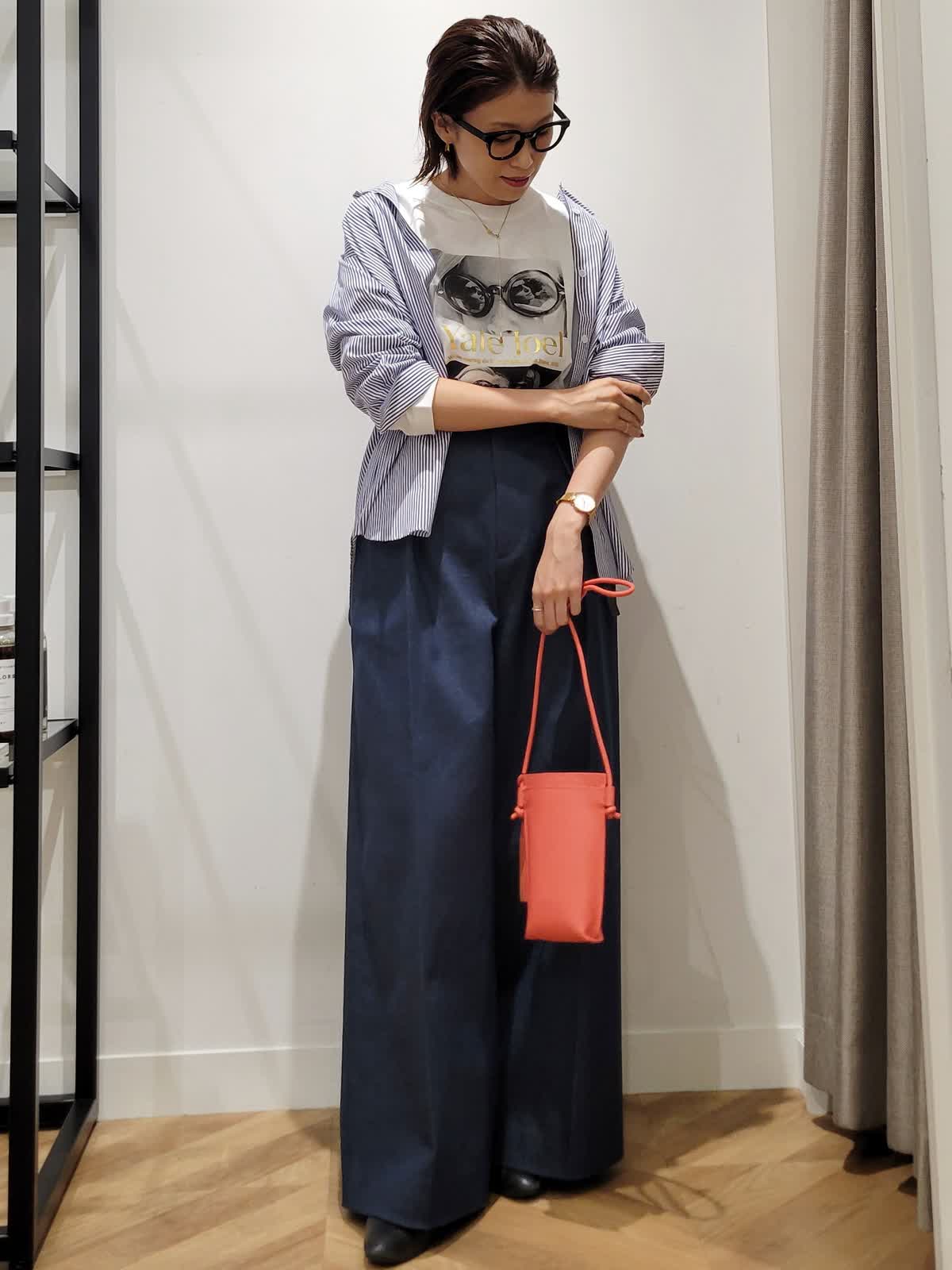 【着用サイズ】カットソー:オフホワイト:9号 パンツ:ダークネイビー:7号 ブラウス:ストライプ:9号 三尋木さんコラボパンツ。ハイウエストのワイドシルエットがかっこいい。ウエストのタックでお腹をカバーしつつ細見えがかなう。デニムですがきれい目コーデにも使える一着。いつもより丈は長めでした。ストライプシャツとフォトロンTで気温差対応コーデに。シャツはゆるりと羽織ってこなれ感プラス。是非挑戦してみてください。
