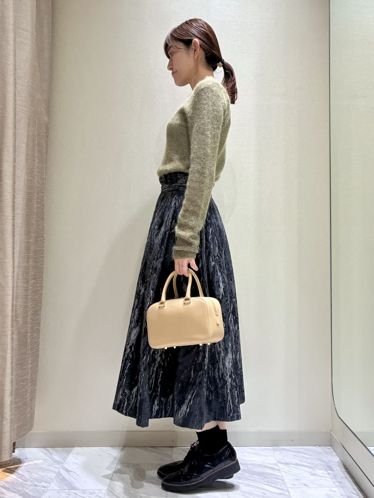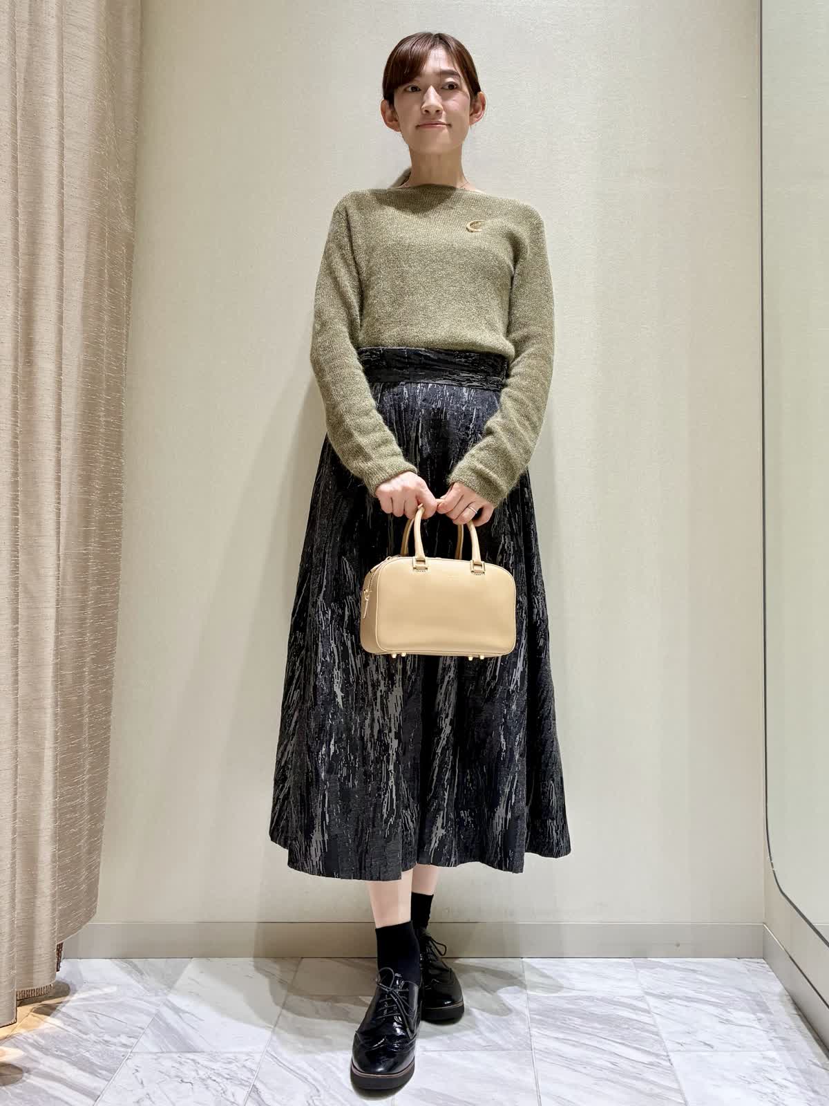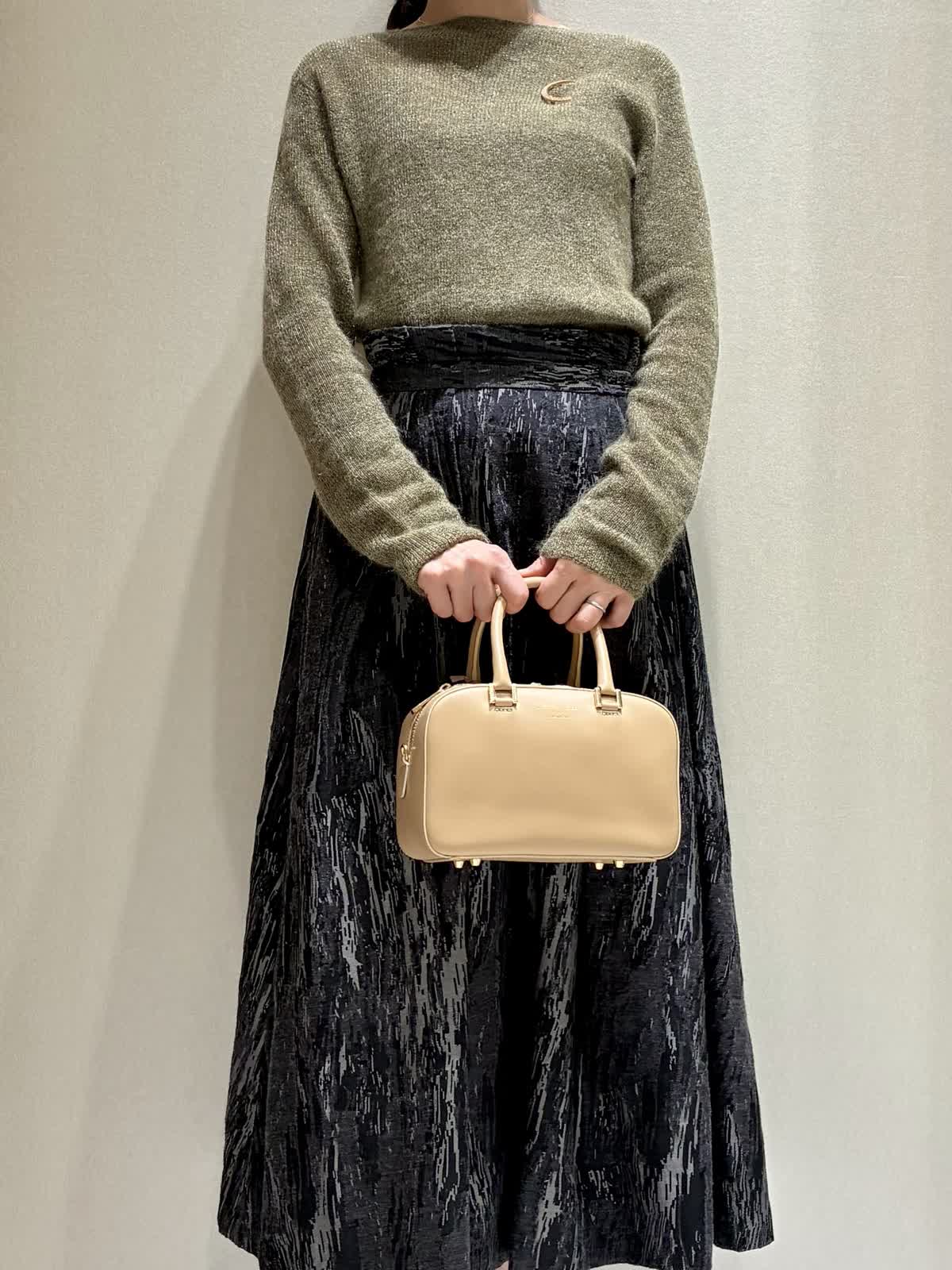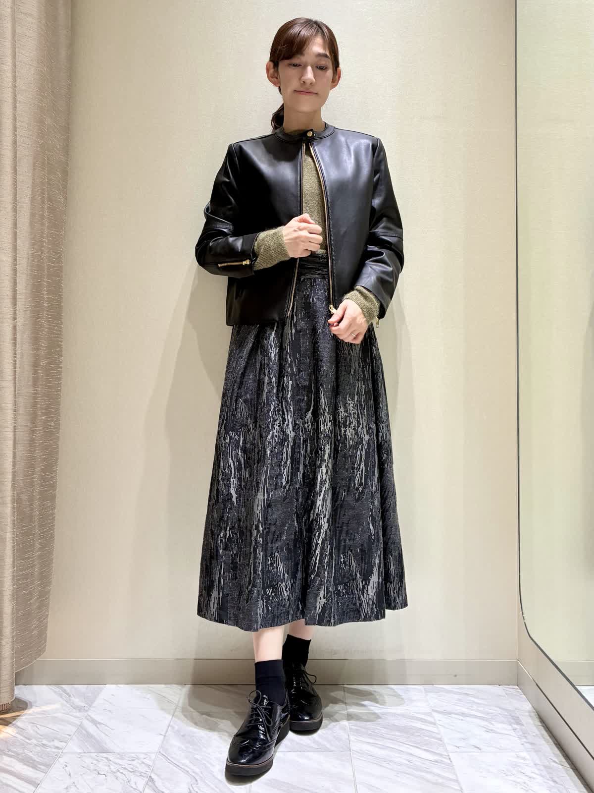 【着用サイズ】全て:9号 【着用カラー】ニット:ダークブラウンスカート:ブラック レザーブルゾン:ブラック バッグ:ベージュ 秋のお出かけスタイルです。 トップスのニットは、ラメモヘアのキラキラがアクセントです。袖の長さが少し長めで、クシュっと感がかわいいデザインです。 ボトムには、クラシックなジャガードのスカートを合わせて、エレガントさをプラスしました。 レザーブルゾンはノーカラーなので、スカートスタイルにもおすすめです。