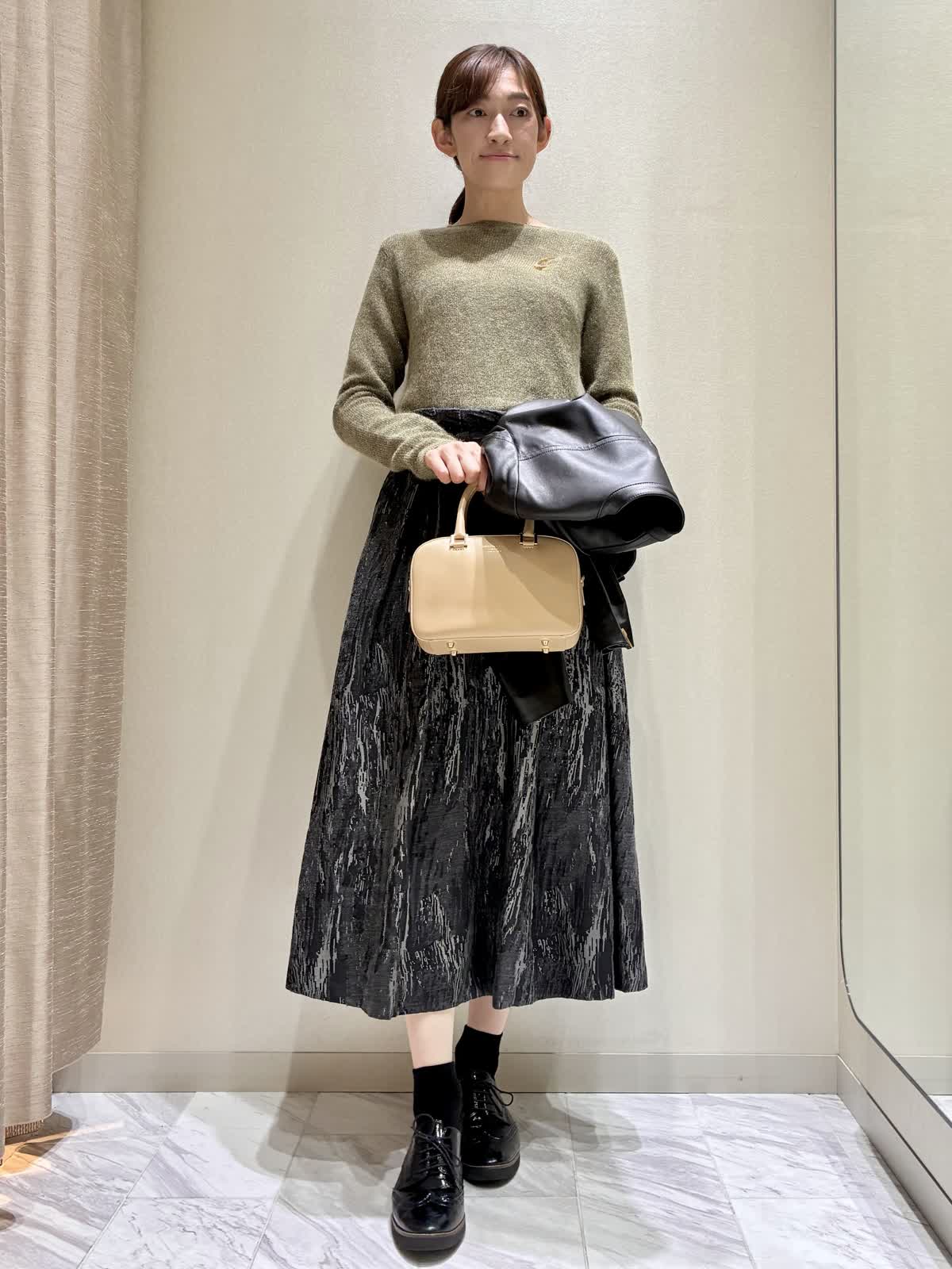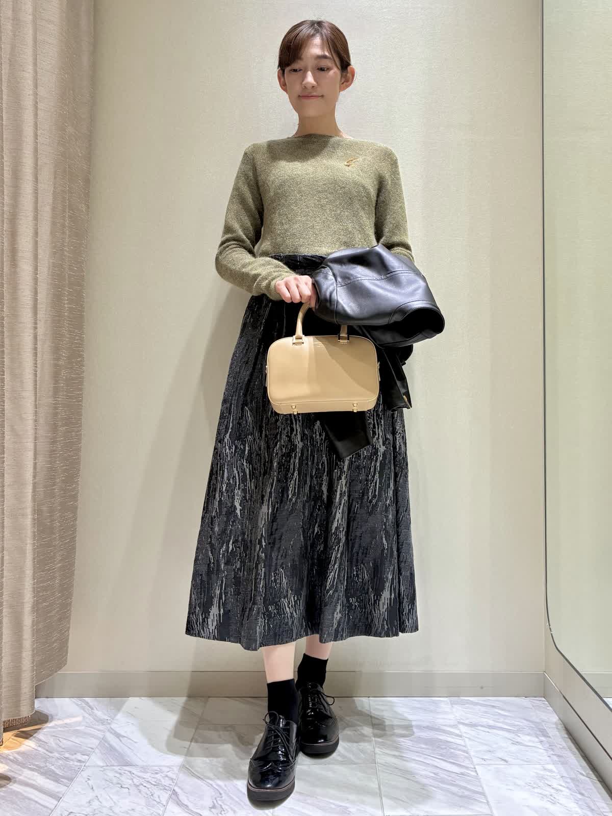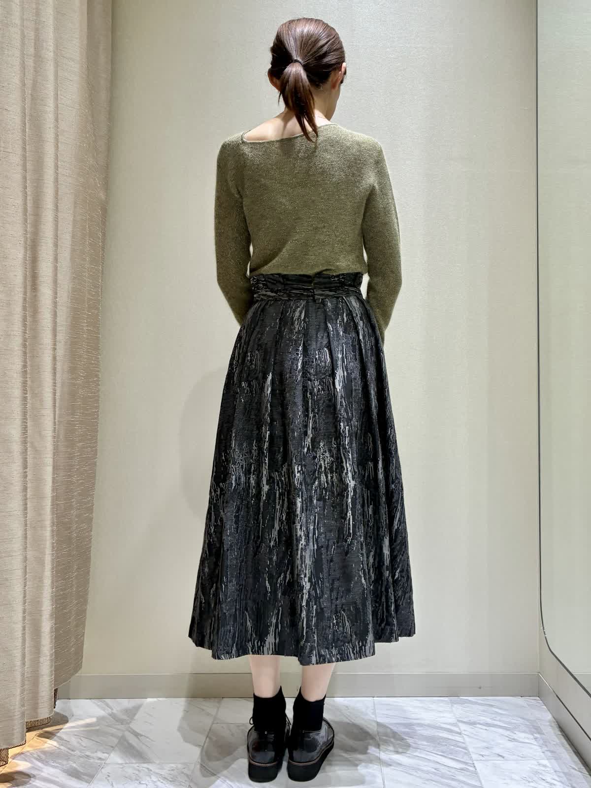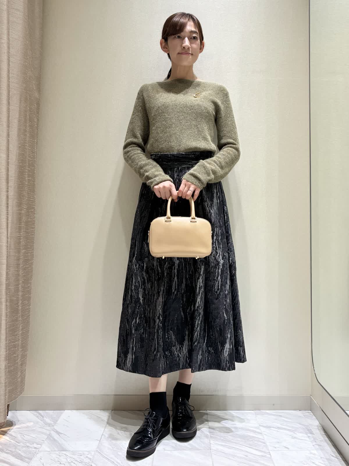 【着用サイズ】全て:9号 【着用カラー】ニット:ダークブラウンスカート:ブラック レザーブルゾン:ブラック バッグ:ベージュ 秋のお出かけスタイルです。 トップスのニットは、ラメモヘアのキラキラがアクセントです。袖の長さが少し長めで、クシュっと感がかわいいデザインです。 ボトムには、クラシックなジャガードのスカートを合わせて、エレガントさをプラスしました。 レザーブルゾンはノーカラーなので、スカートスタイルにもおすすめです。