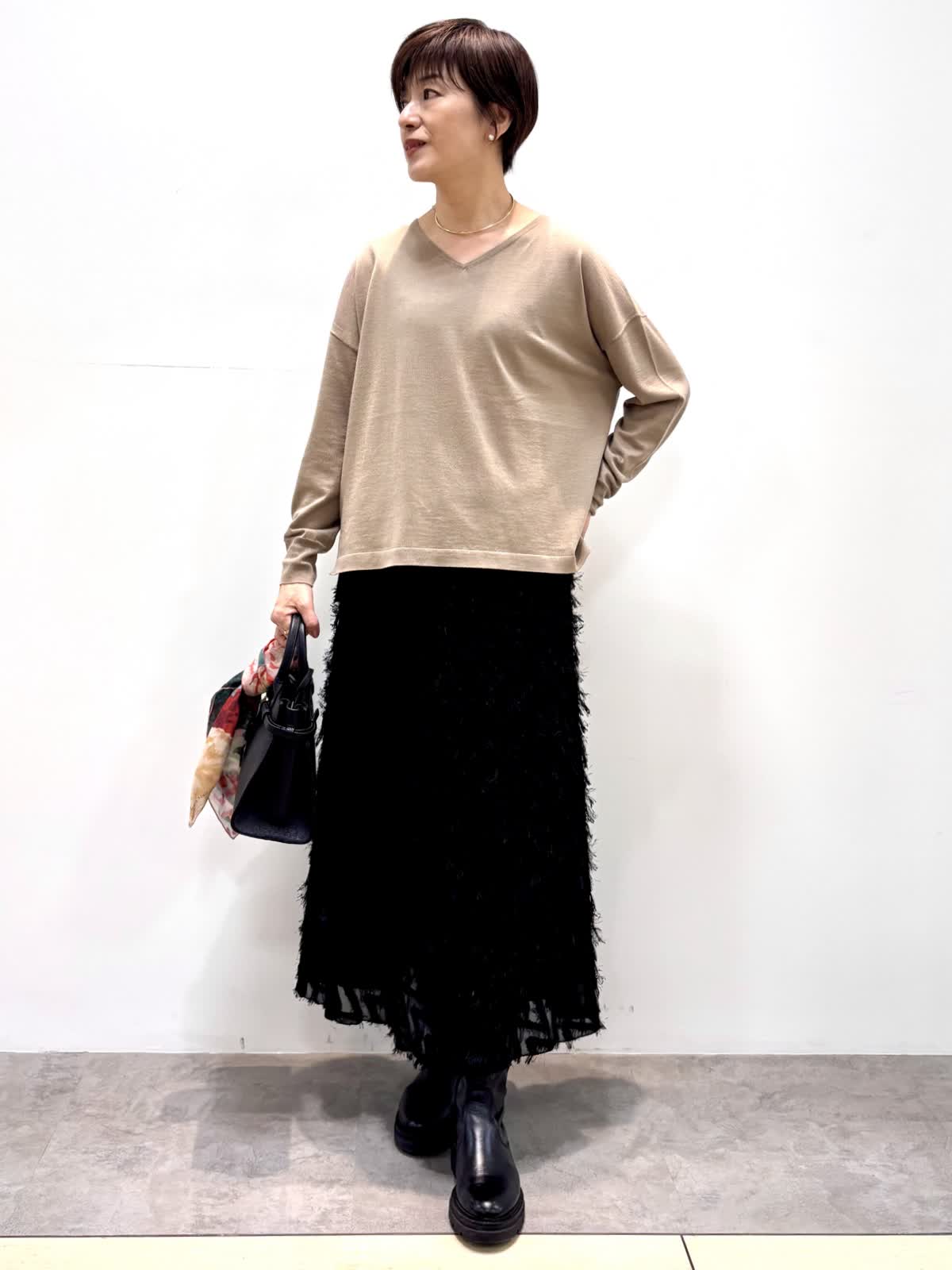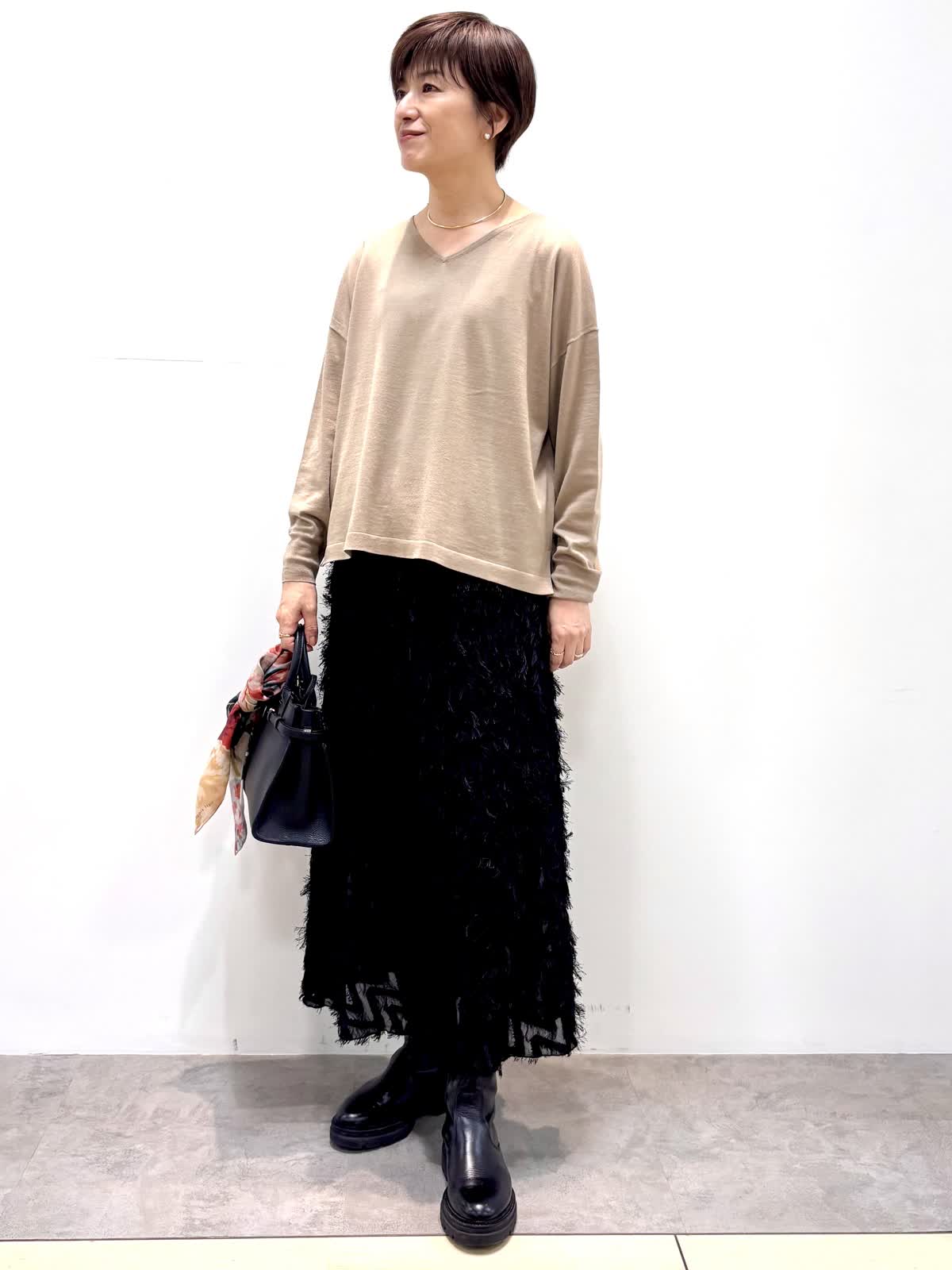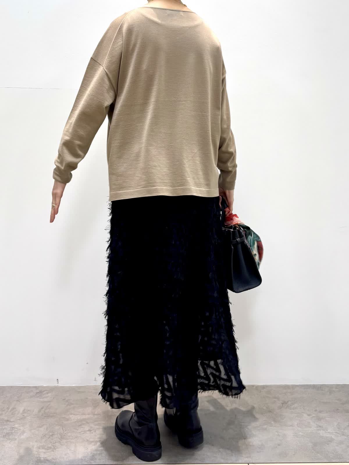 [着用サイズ]ニット:9号 スカート:7号 [着用カラー]ニット:キャメル スカート:ブラック シルク混のニットは光沢感が綺麗で、程よいゆるさがこなれ感も演出します。肌触りも滑らかで1枚でも羽織りの中にも着やすいです。ジャガードのスカートはウエストゴム使用で履きやすく、着映えする華やかなスカートです。色々なシーンで着ていただけます。