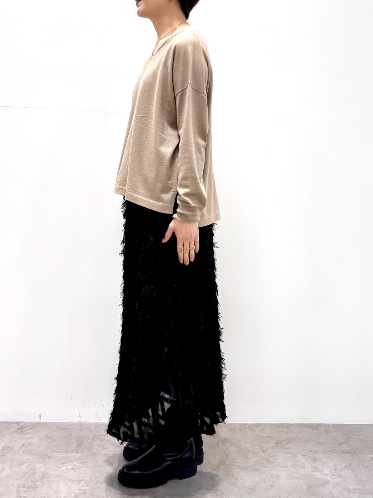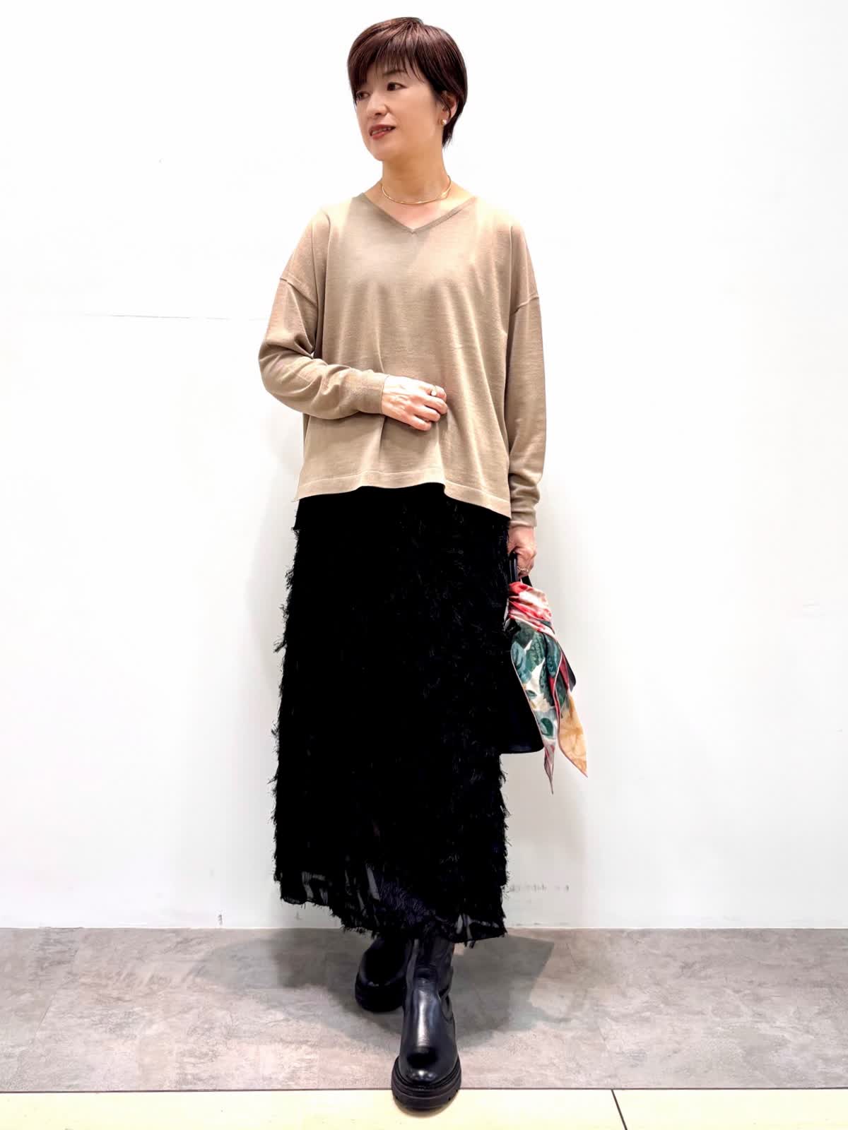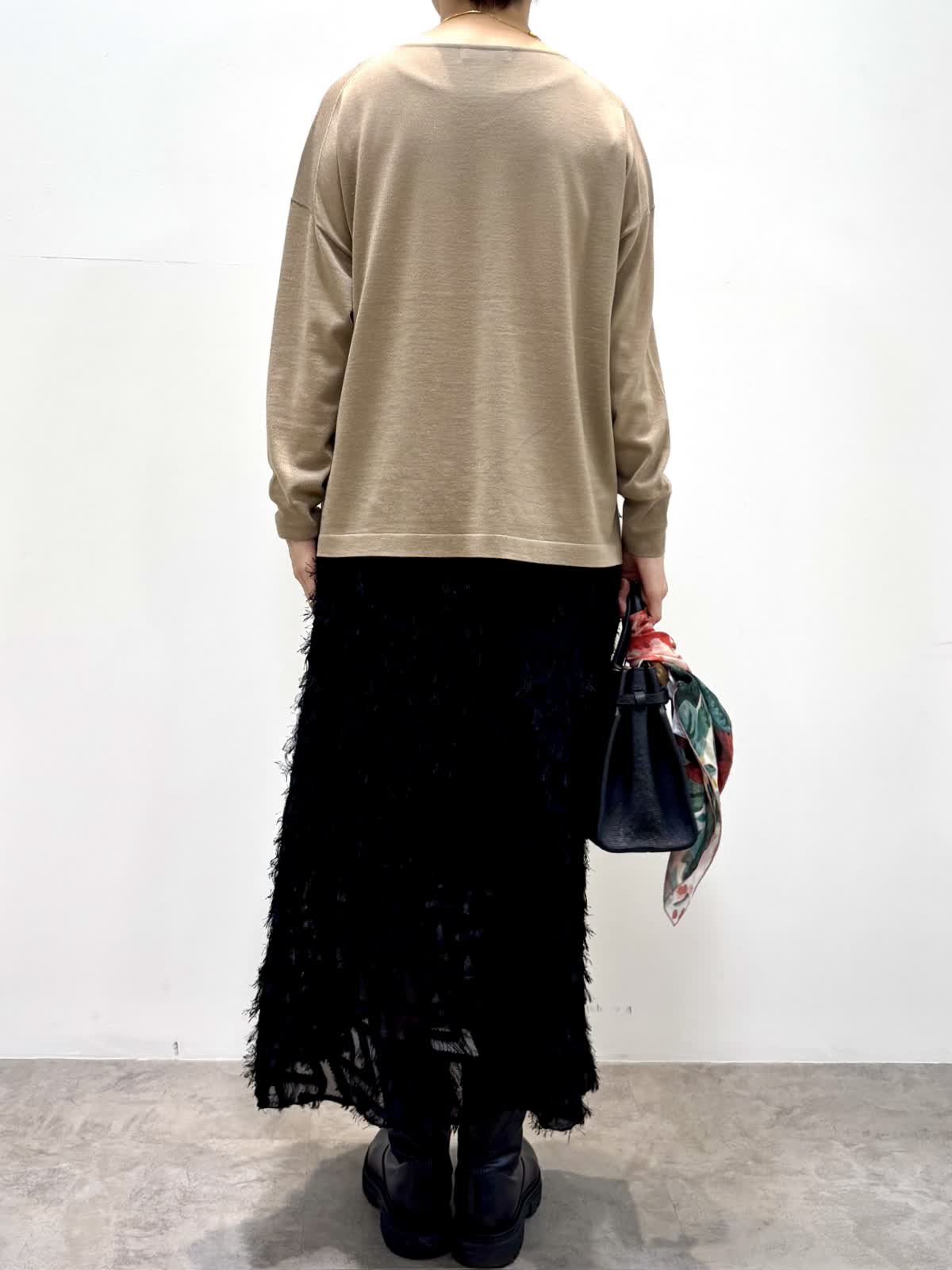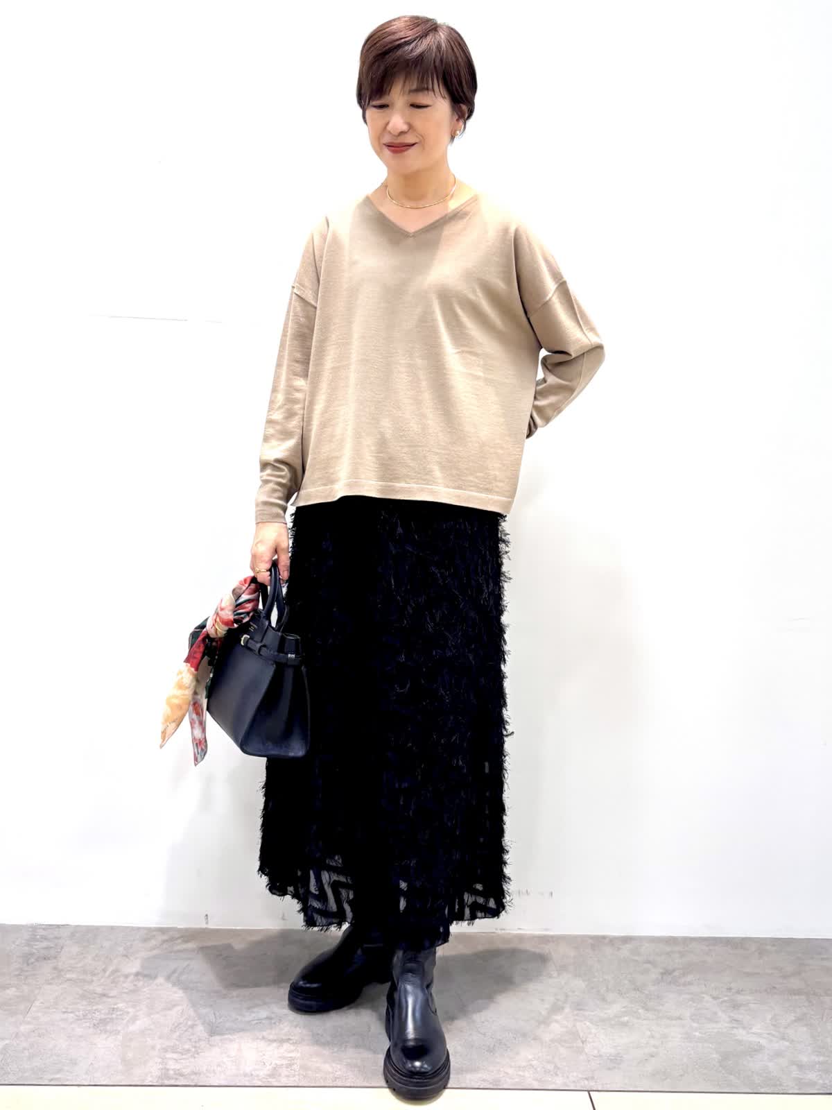 [着用サイズ]ニット:9号 スカート:7号 [着用カラー]ニット:キャメル スカート:ブラック シルク混のニットは光沢感が綺麗で、程よいゆるさがこなれ感も演出します。肌触りも滑らかで1枚でも羽織りの中にも着やすいです。ジャガードのスカートはウエストゴム使用で履きやすく、着映えする華やかなスカートです。色々なシーンで着ていただけます。