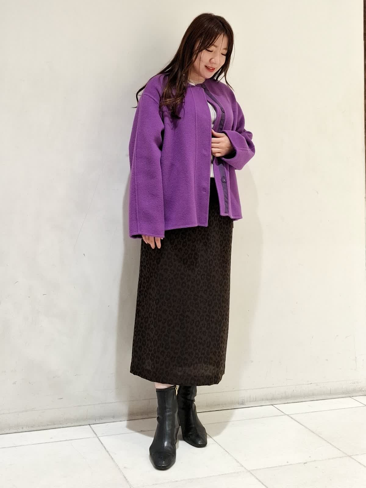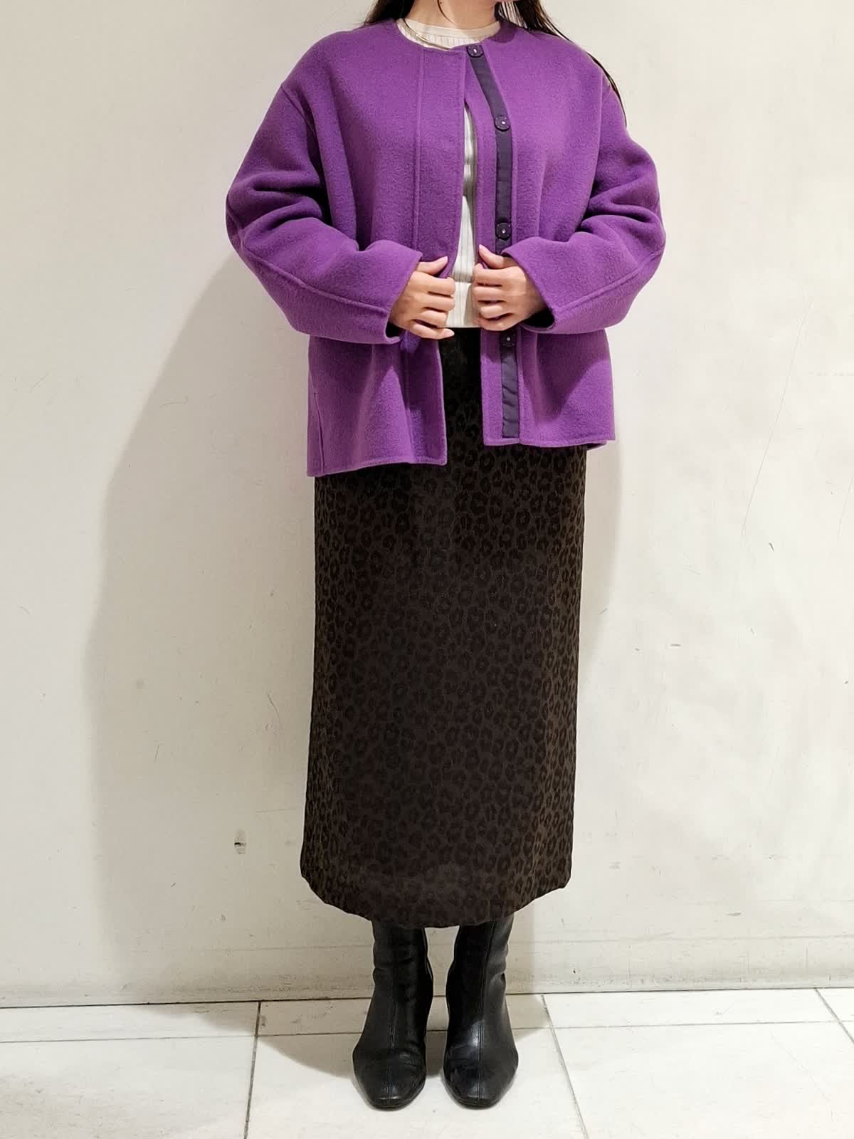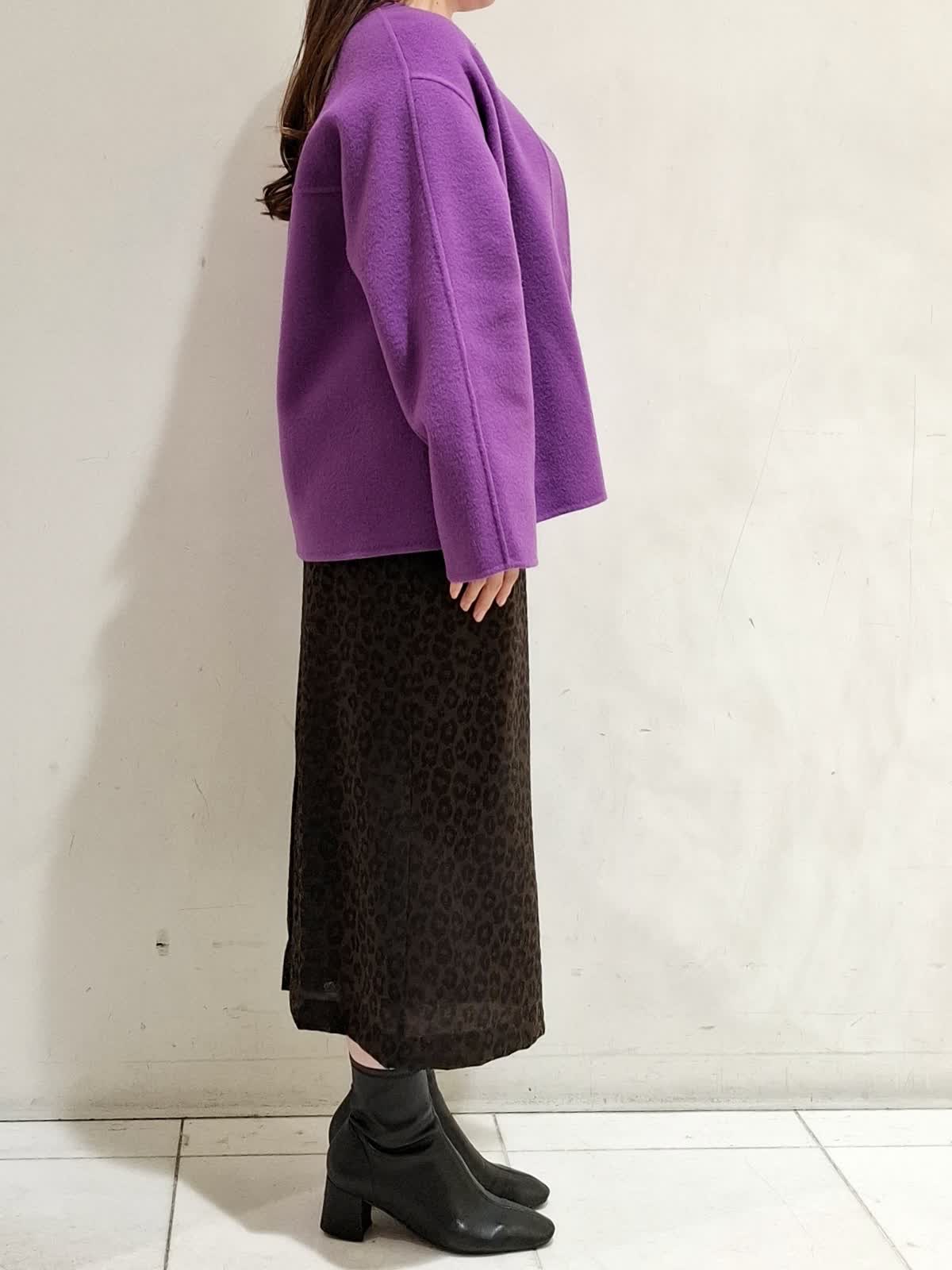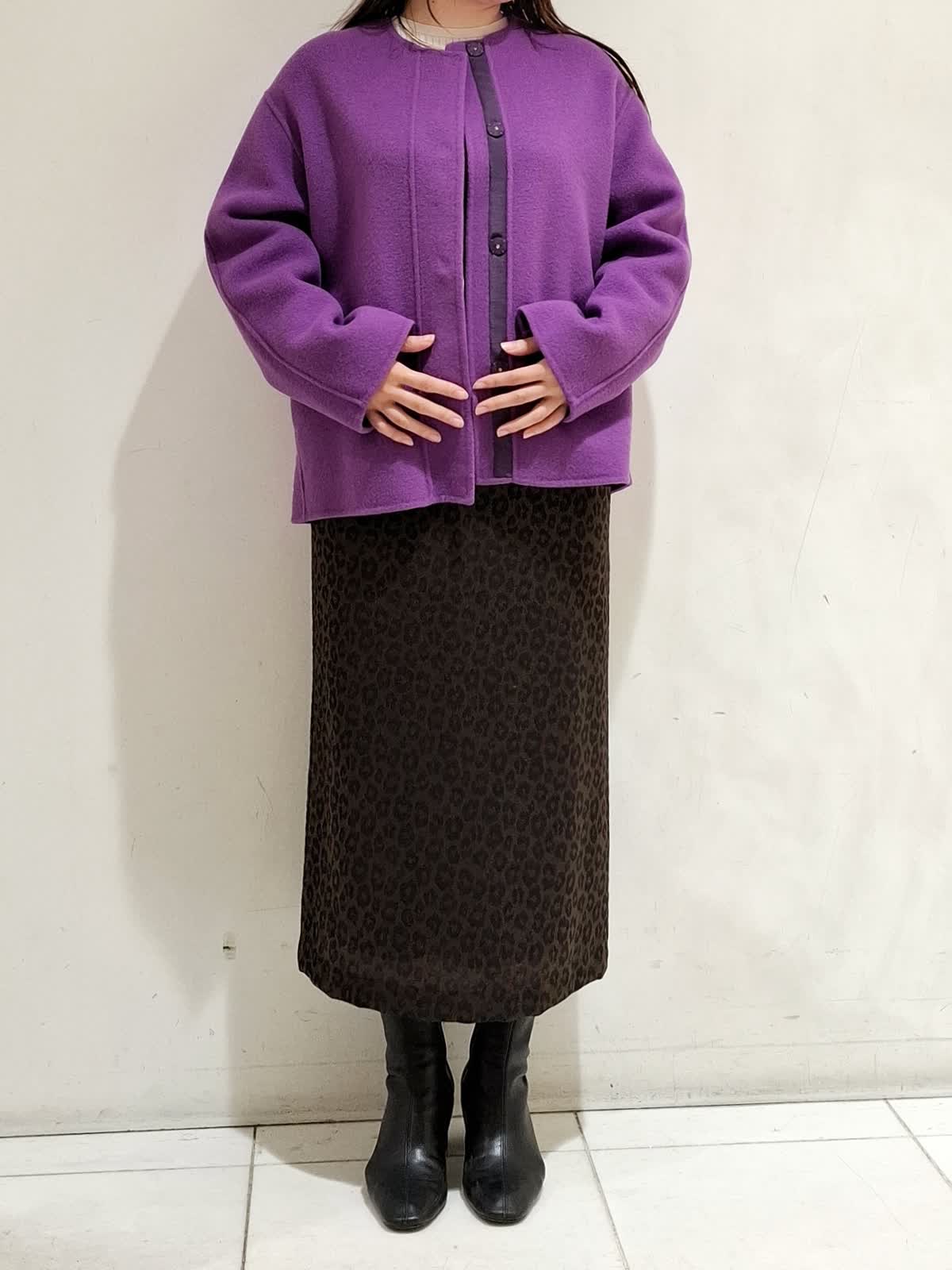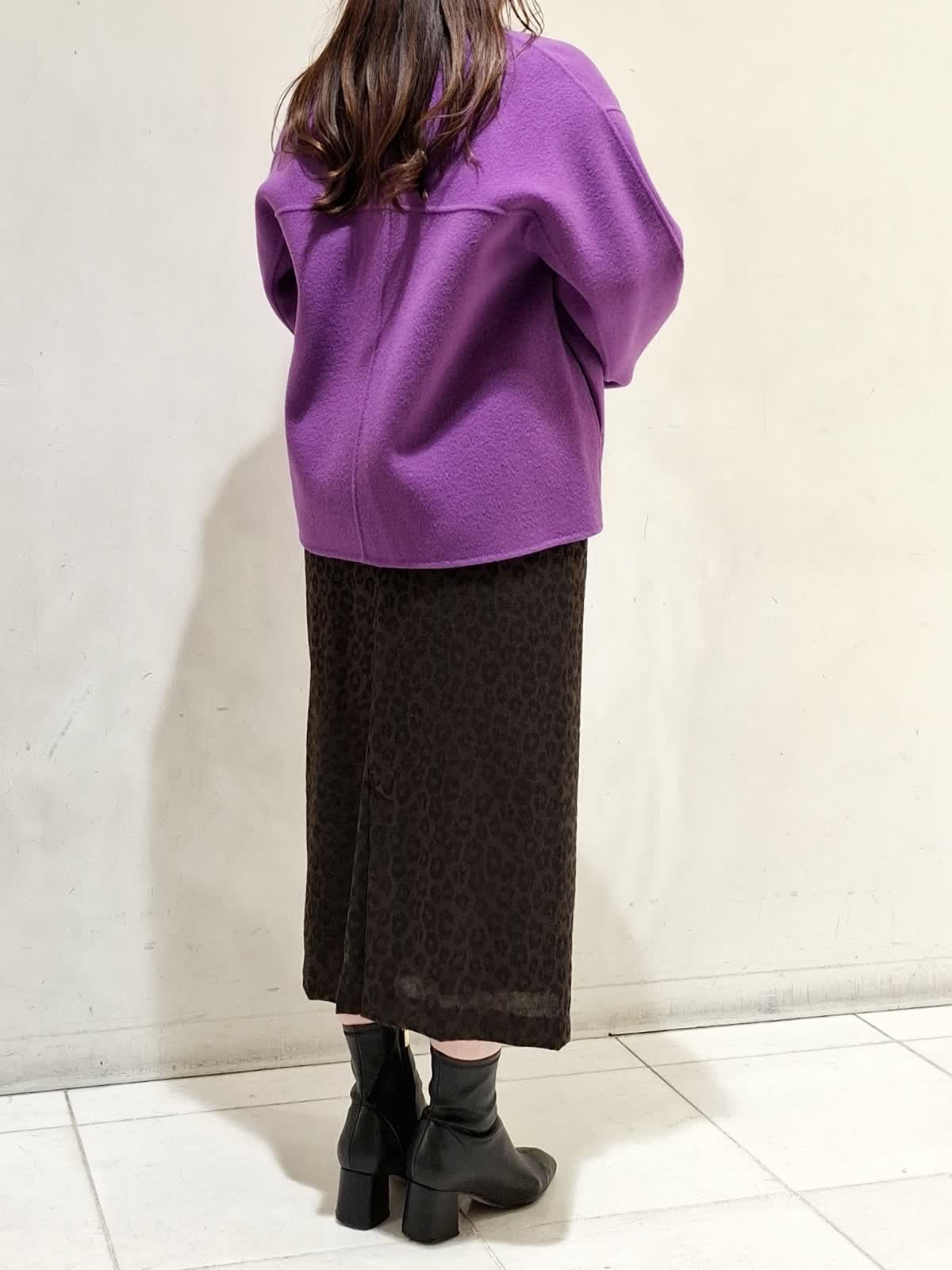 【着用サイズ】コート:9号サイズ パープル ニット:9号サイズ グレーベージュ スカート:9号サイズ 柄中 コートは、ヒップが隠れる着丈で合わせやすく、シルエットがゆったりしているためインナーを選びません。ニットは、柔らかく肌触りのよい素材でシーズンレスで着ていただけます。スカートは、柄が目立ちすぎないため、はきやすいです。
