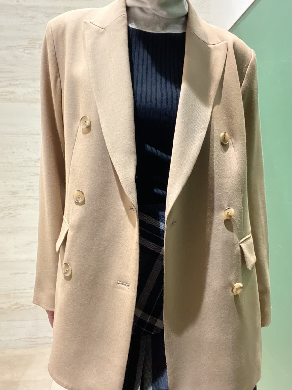 【カラー/サイズ】ジャケット:キャメル/9号 ニット:ソノタ/9号 スカート:グレー/9号 大人の女性にピッタリの余裕あるダブルブレストジャケット。メンズライクなスタイリングはもちろんロングスカートでマニッシュからエレガントと印象を変えられます。
