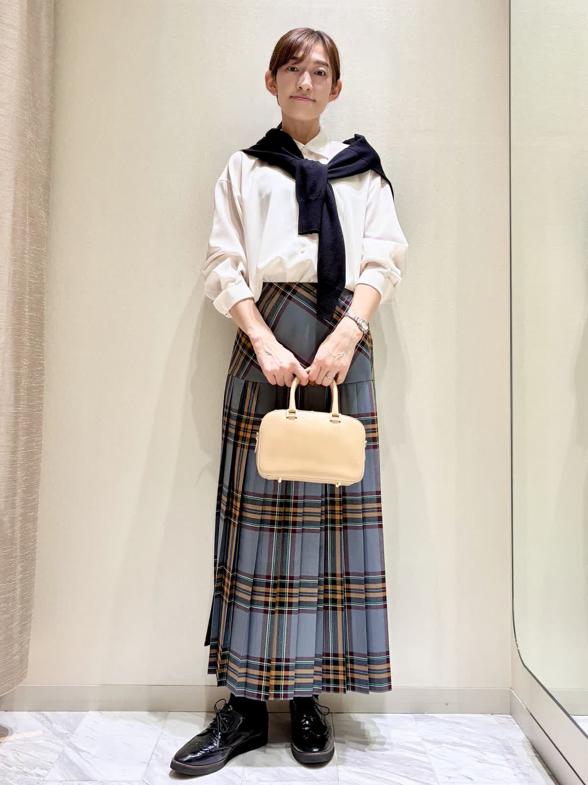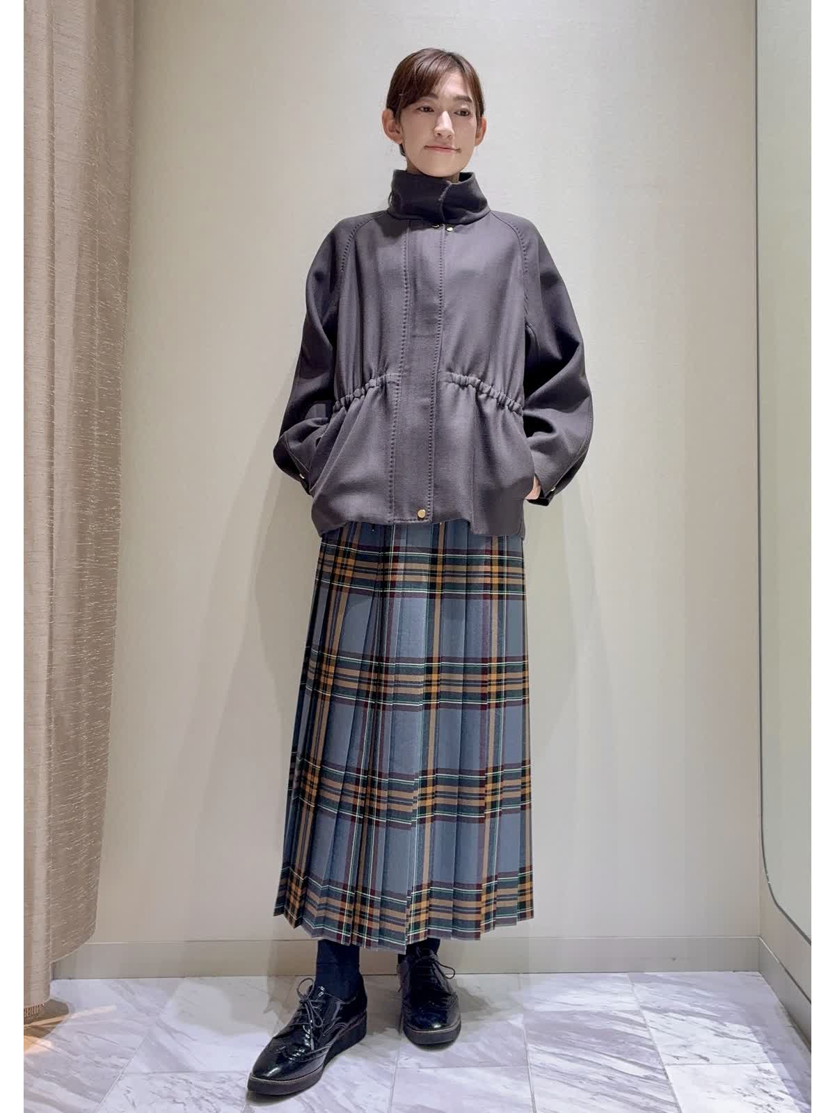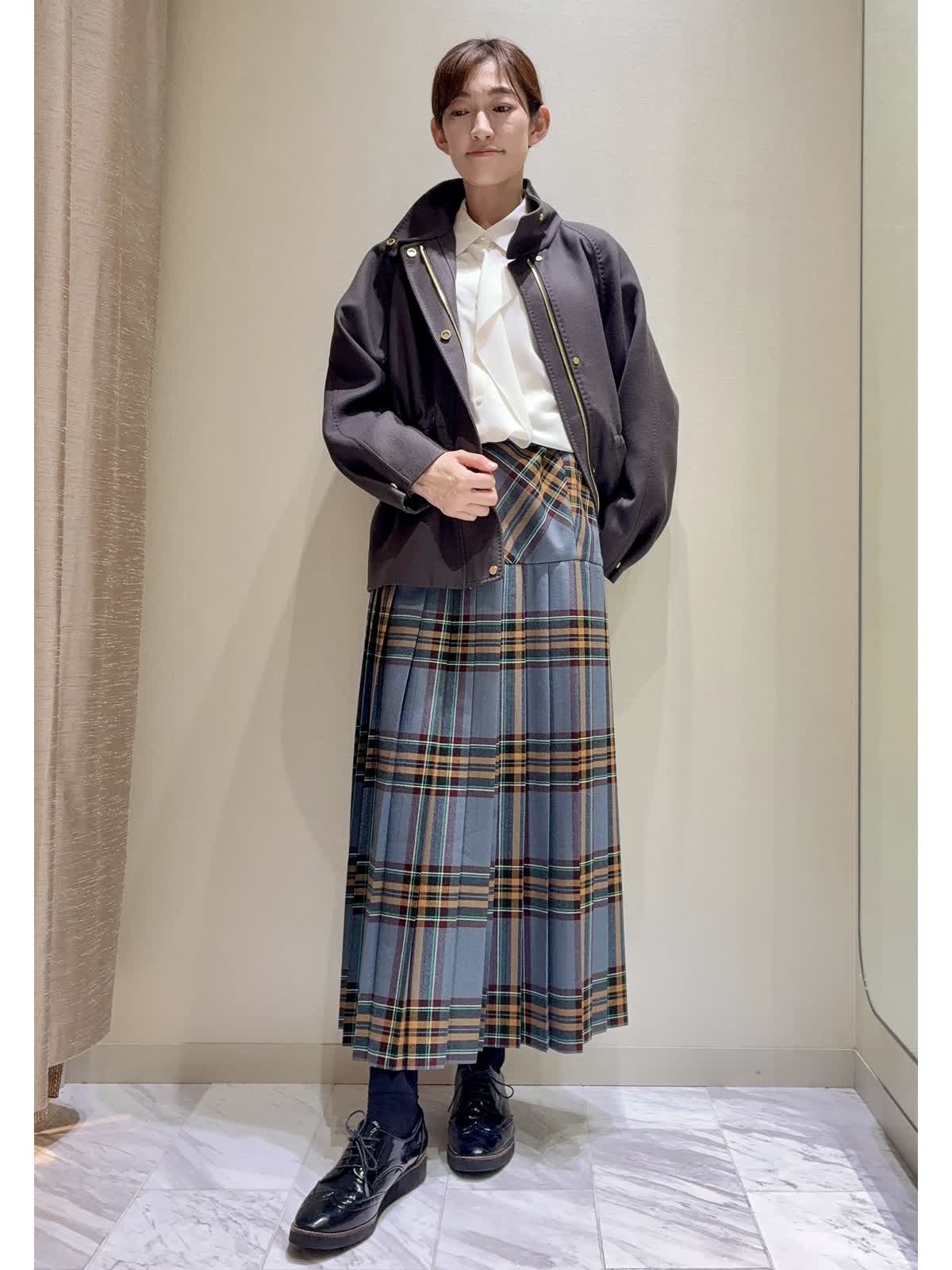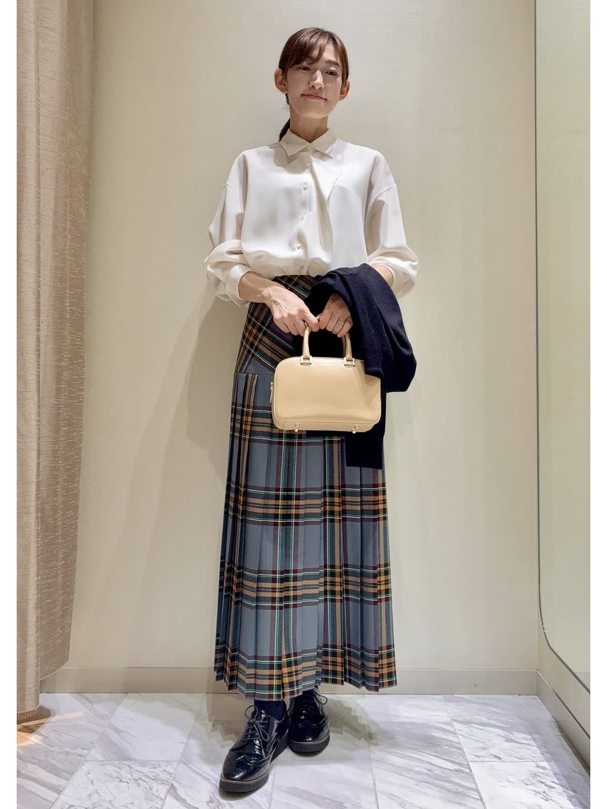 【着用サイズ】全て:9号 【着用カラー】ブラウス:オフホワイト ニット:ブラック スカート:ブルーグレー ブルゾン:ダークブラウン バッグ:ベージュ 秋らしいチェックスカートのご紹介です。 柔らかいブルーグレーのカラーがアクセントに。トップスはニットだけでなく、シャツを合わせてオフィスカジュアルにも。 広がりすぎないプリーツで、縦長のシルエットがきれいなデザインです。