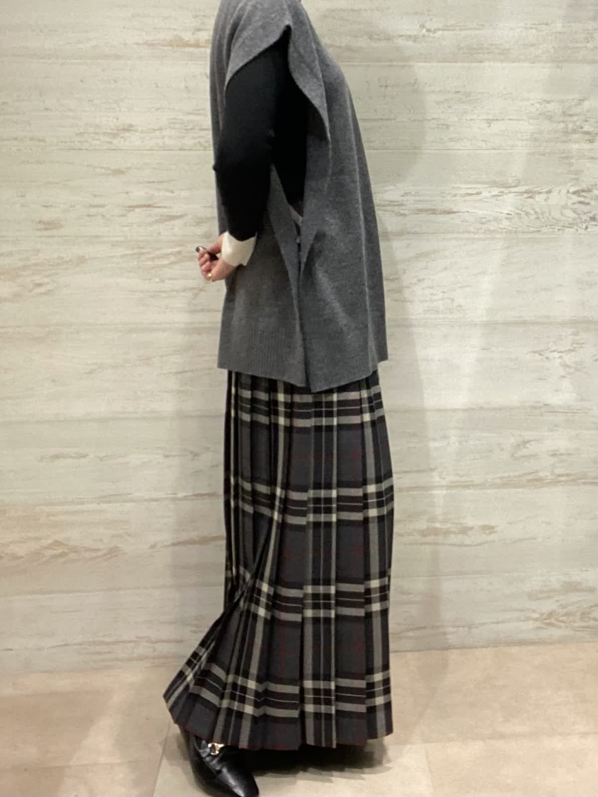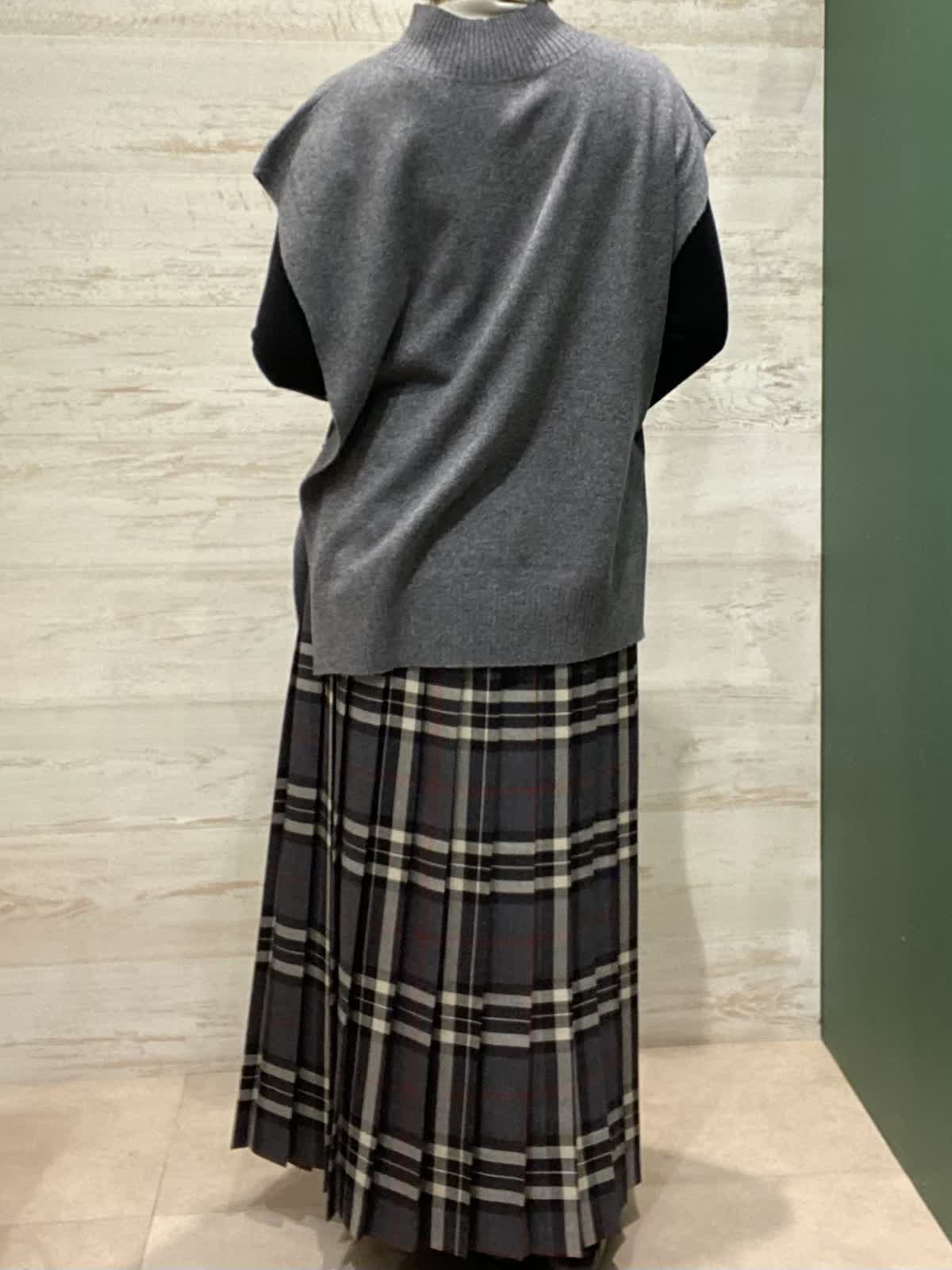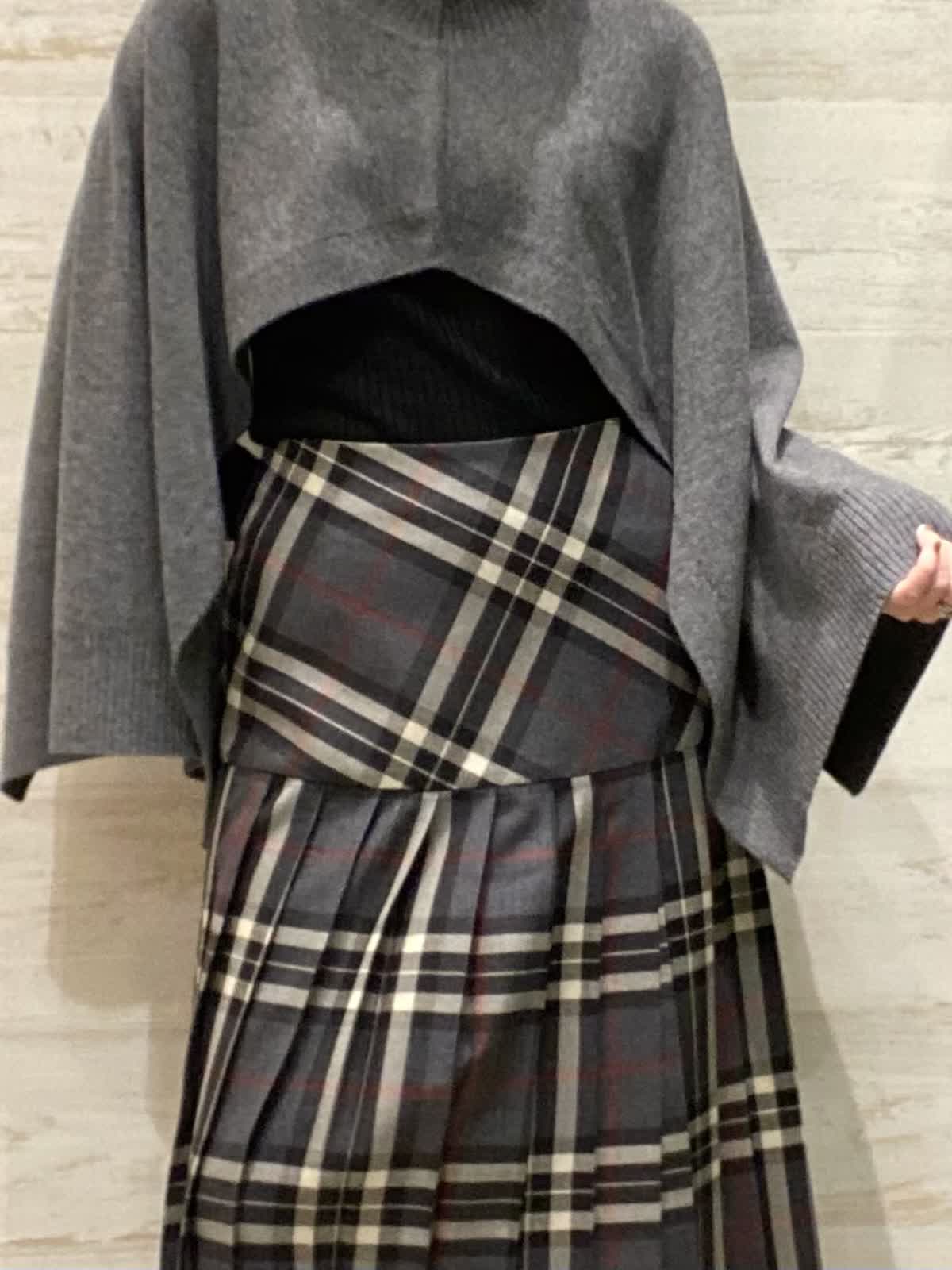 【着用カラー/サイズ】ニットジレ:グレー/フリー ニット:ソノタ/9号 スカート:グレー/9号 柔らかく肌触りの良い高品質ウールのニットジレはポンチョ風、ショートボレロ風と2wayでスタイリングが楽しめます。ウエストからヒップにかけてヨーク切り替えで細見えシルエットのチェックスカートは相性◎