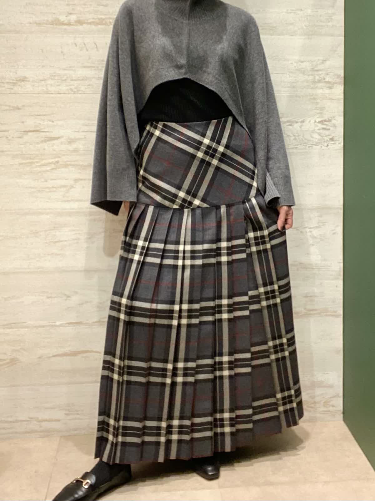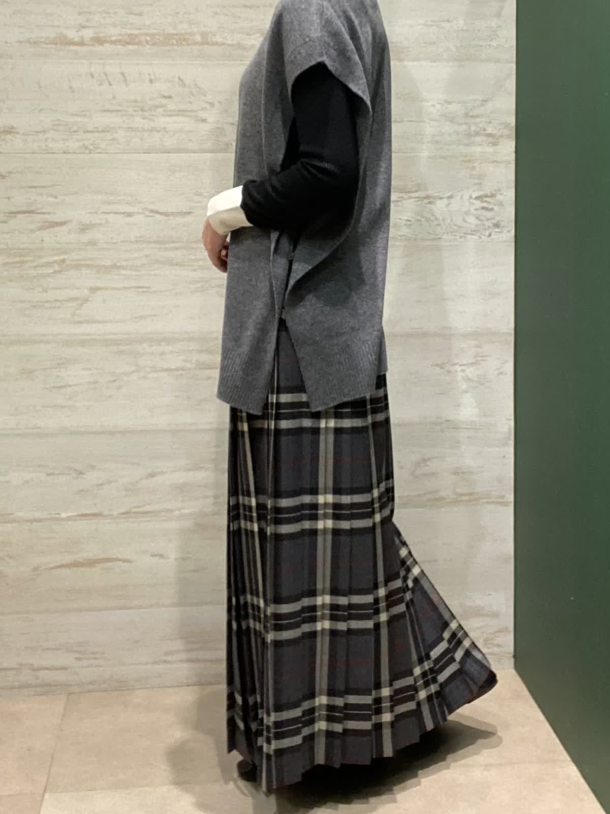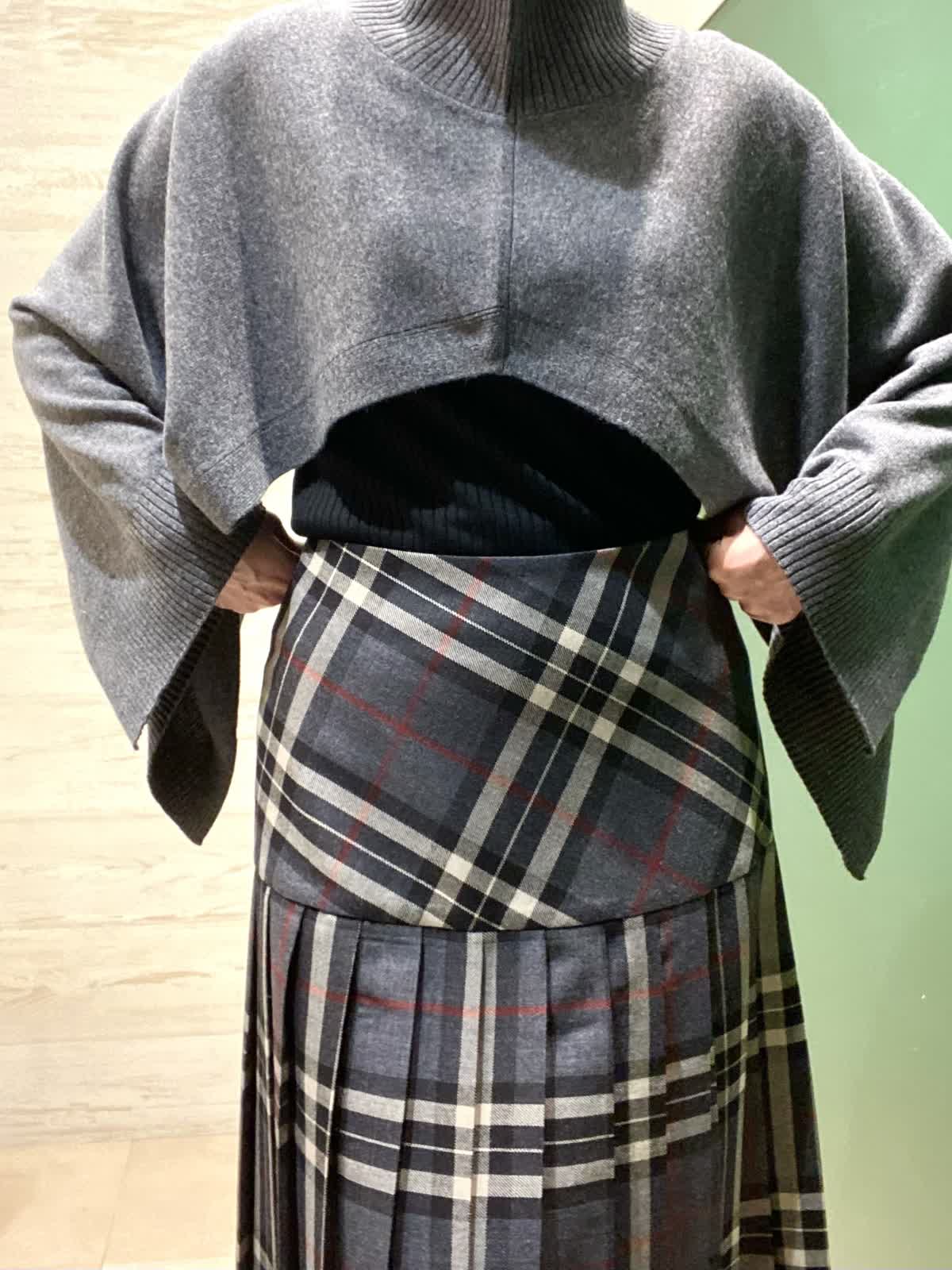 【着用カラー/サイズ】ニットジレ:グレー/フリー ニット:ソノタ/9号 スカート:グレー/9号 柔らかく肌触りの良い高品質ウールのニットジレはポンチョ風、ショートボレロ風と2wayでスタイリングが楽しめます。ウエストからヒップにかけてヨーク切り替えで細見えシルエットのチェックスカートは相性◎