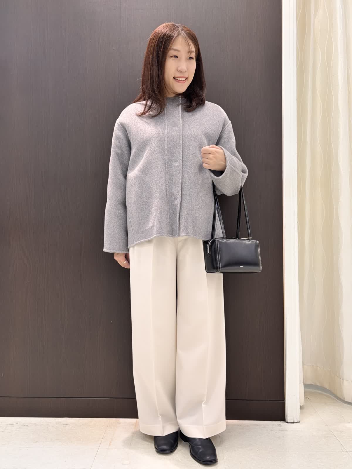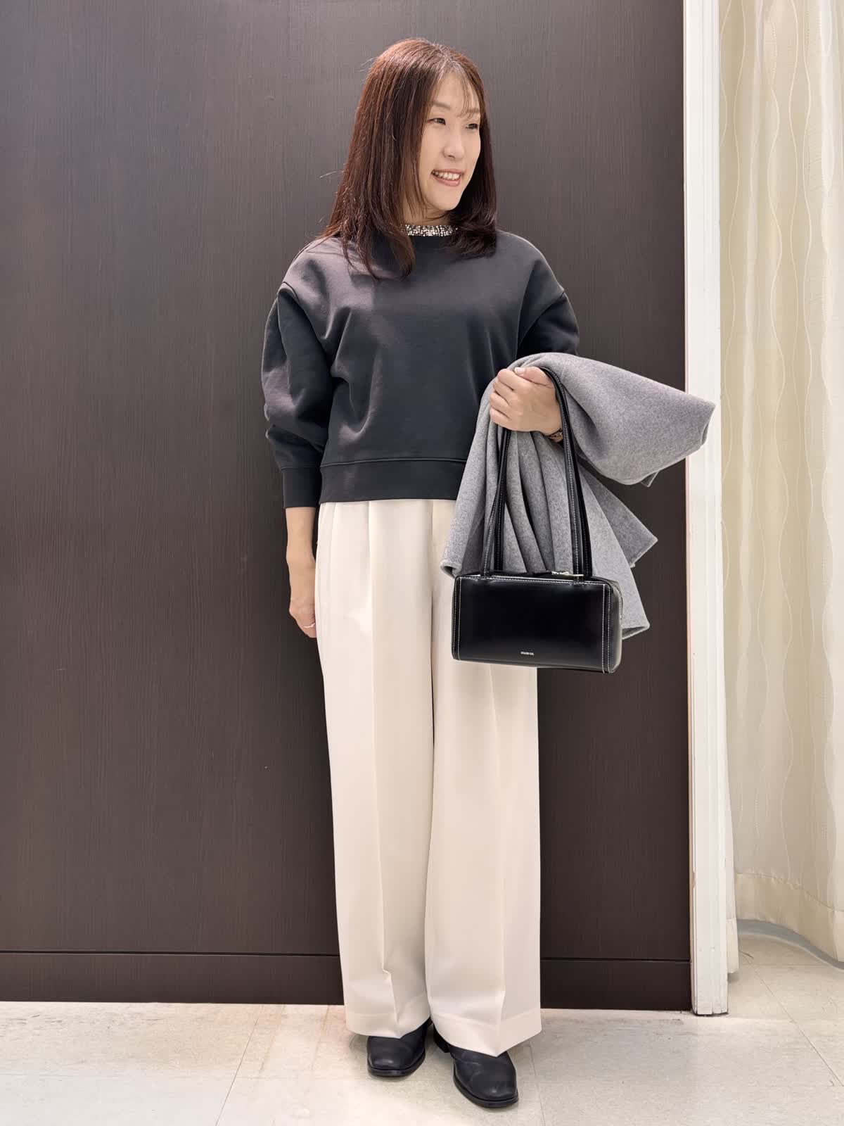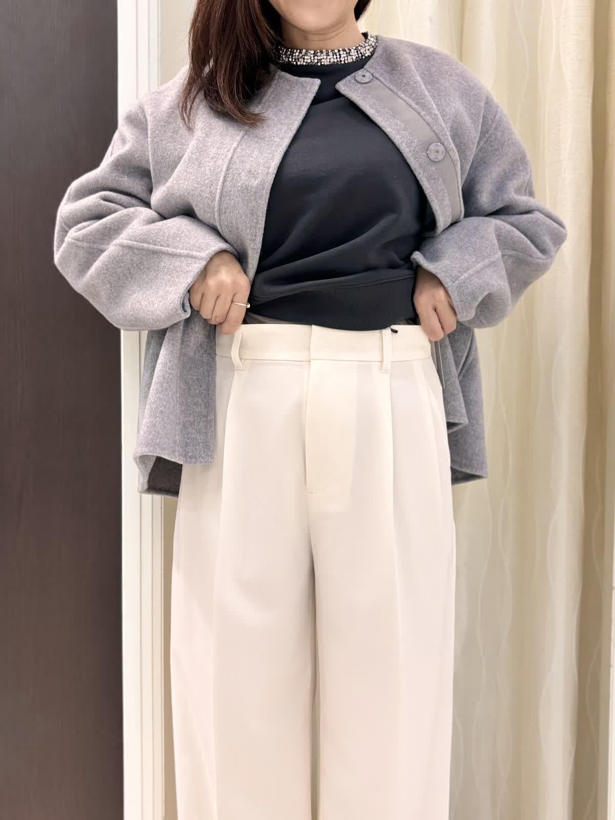 扱いやすい生地ですが、ビジューが華やかなスエット素材のトップスにピッタリなリバーコート。ノーカラーの首元からチラッと覗くのがポイントです。スエットは肉厚で身体のラインを拾わず、着るだけでサマ見えする一着です。リバーコートは身頃と袖筒だけは裏地があるのでインナーの滑りも良いです。オーバーサイズでゆとりあるサイズ感となります。合わせたパンツはシンプルなので幅広いトップスと着こなしやすい万能パンツです。シワになりくく、季節を問わずに着こなせる快適な素材です。
