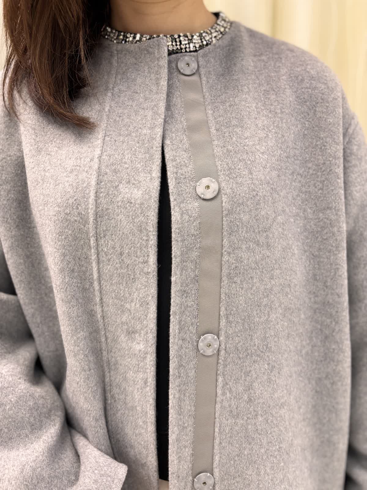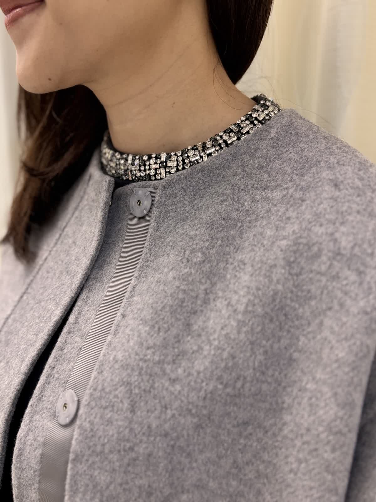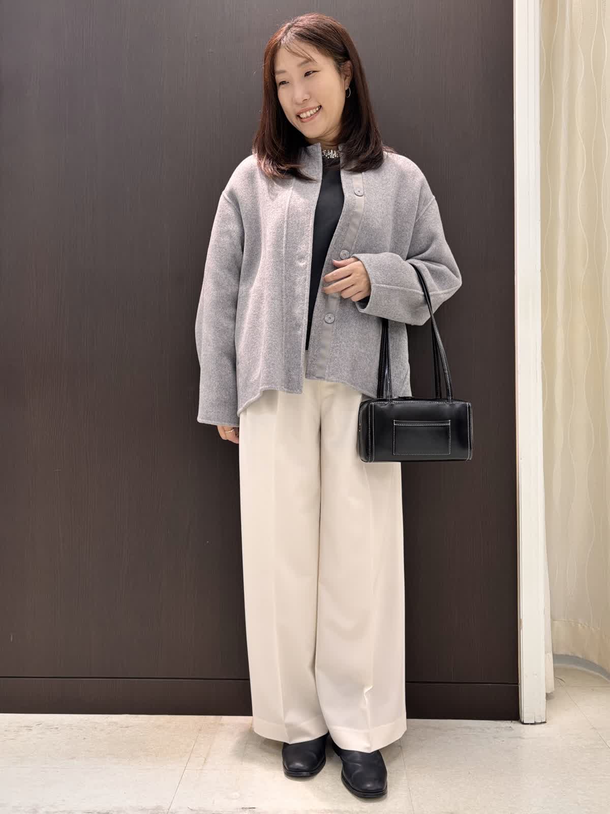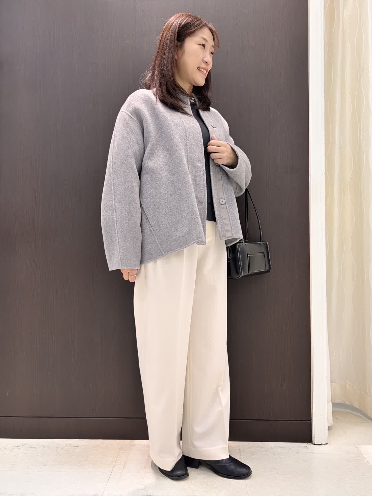 扱いやすい生地ですが、ビジューが華やかなスエット素材のトップスにピッタリなリバーコート。ノーカラーの首元からチラッと覗くのがポイントです。スエットは肉厚で身体のラインを拾わず、着るだけでサマ見えする一着です。リバーコートは身頃と袖筒だけは裏地があるのでインナーの滑りも良いです。オーバーサイズでゆとりあるサイズ感となります。合わせたパンツはシンプルなので幅広いトップスと着こなしやすい万能パンツです。シワになりくく、季節を問わずに着こなせる快適な素材です。