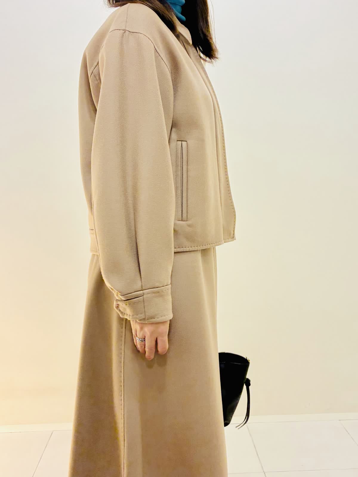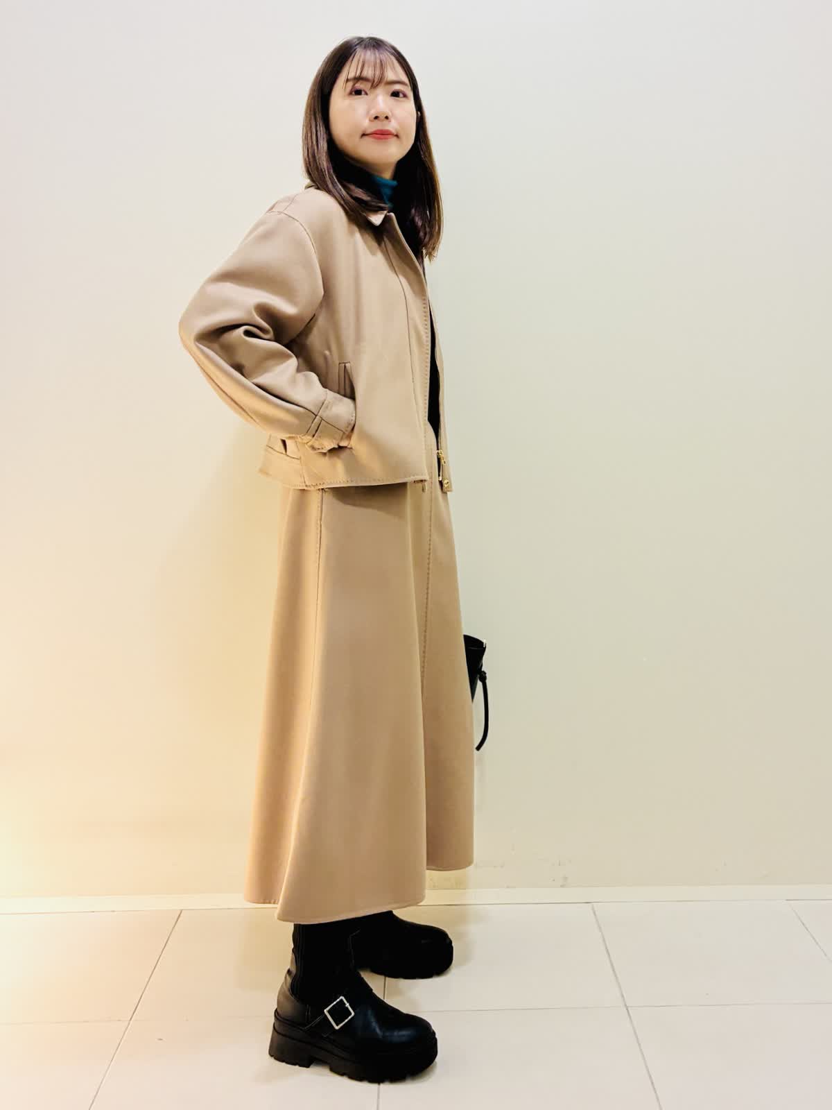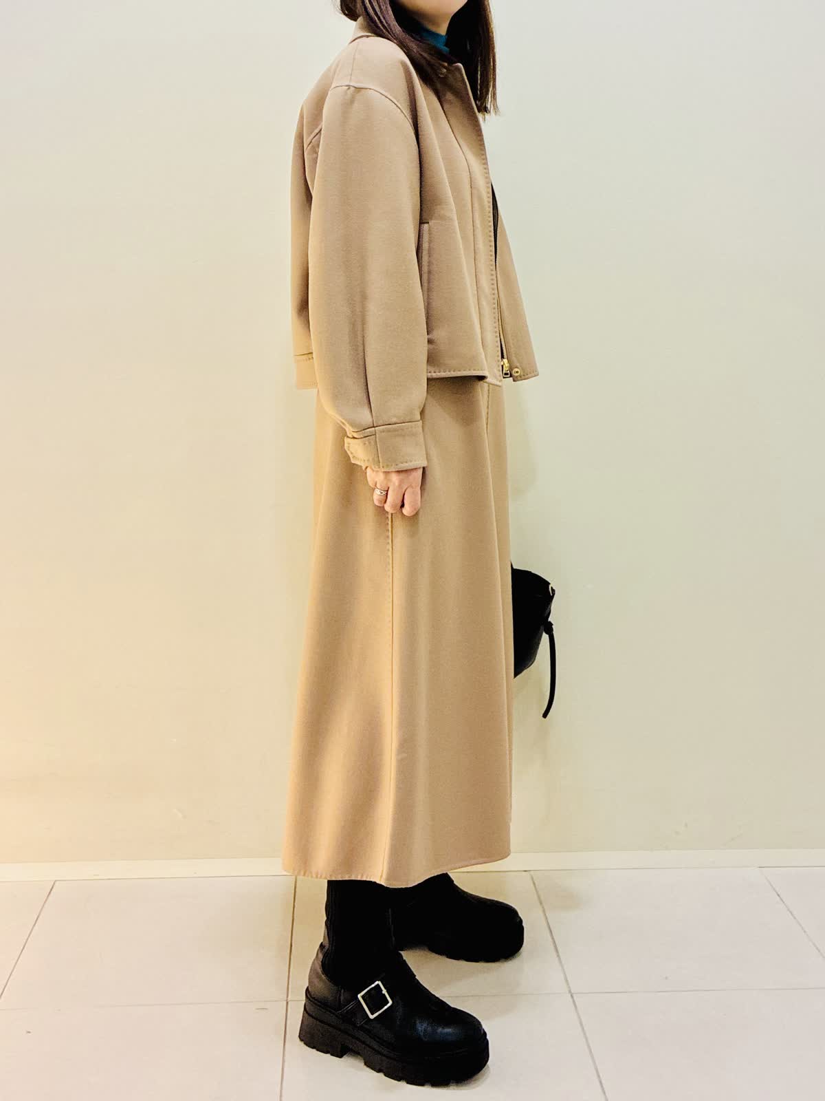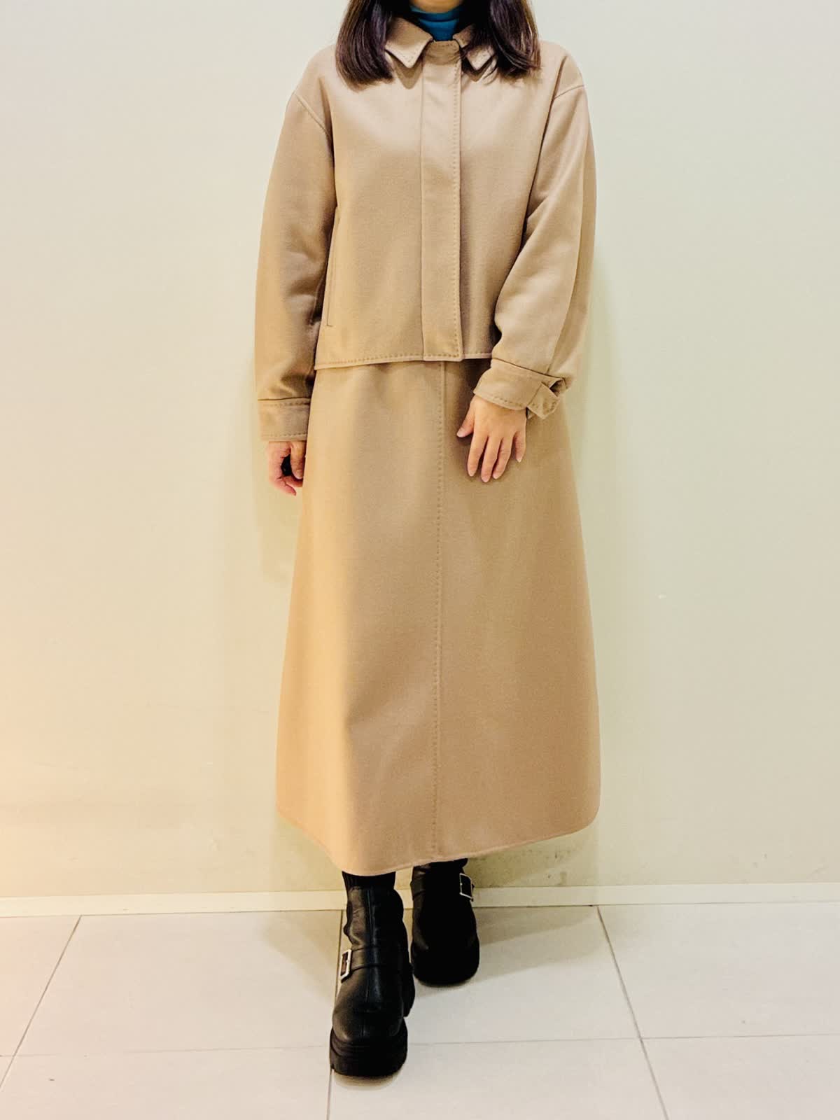 【着用サイズ】 コート:キャメル:9号サイズ スカート:キャメル:9号サイズ ニット:スミクロ:9号サイズ 『セットアップスタイリング』 ウール混のセットアップで、少しゆったり着れるので重ね着もしやすいです。 スカートもゴムではないけど、腰でとまるタイプなので楽に履けます。 ニットは着心地よくスミクロはターコイズブルーのバイカラーです。