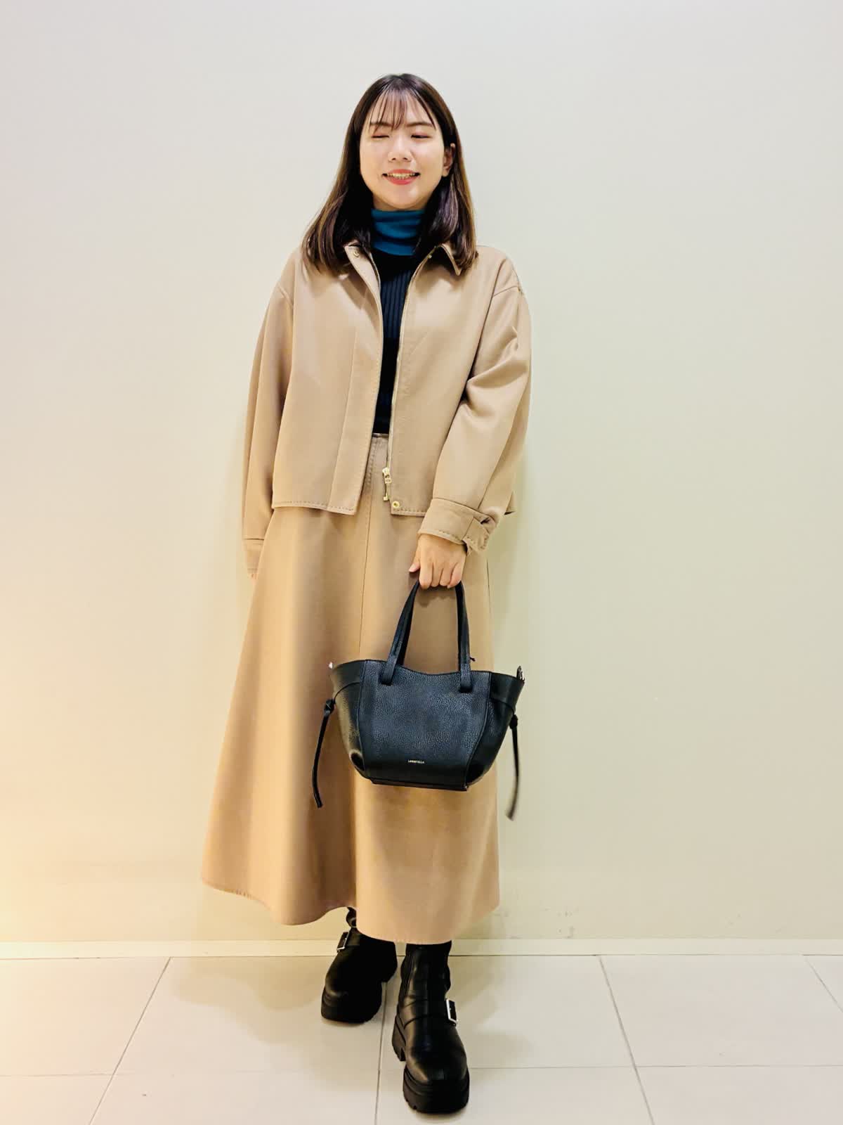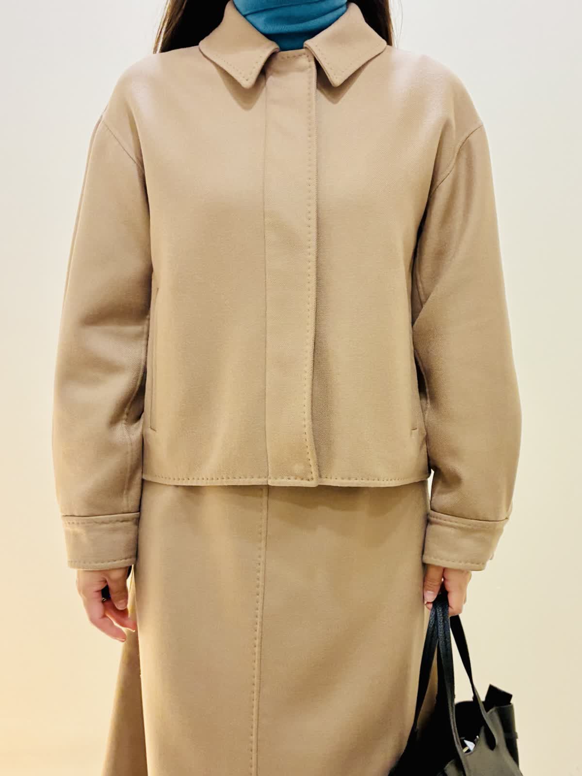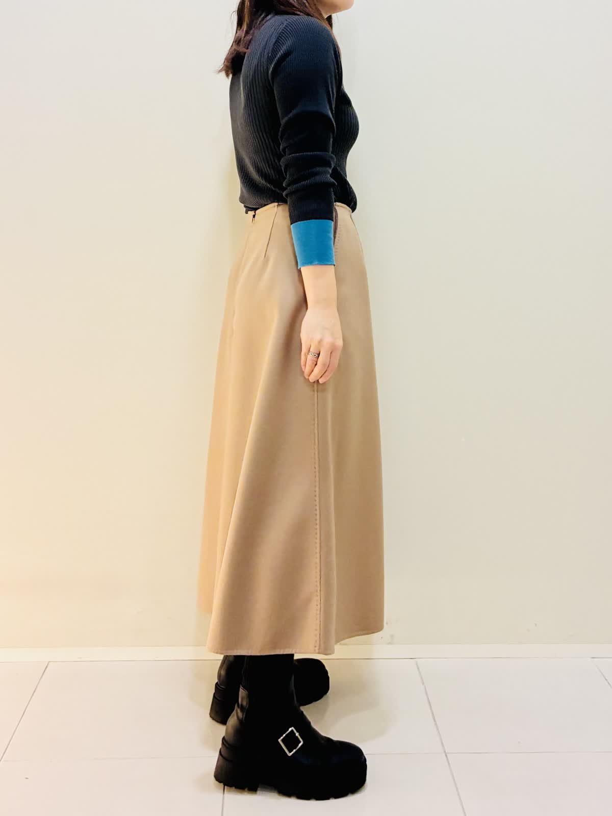 【着用サイズ】 コート:キャメル:9号サイズ スカート:キャメル:9号サイズ ニット:スミクロ:9号サイズ 『セットアップスタイリング』 ウール混のセットアップで、少しゆったり着れるので重ね着もしやすいです。 スカートもゴムではないけど、腰でとまるタイプなので楽に履けます。 ニットは着心地よくスミクロはターコイズブルーのバイカラーです。