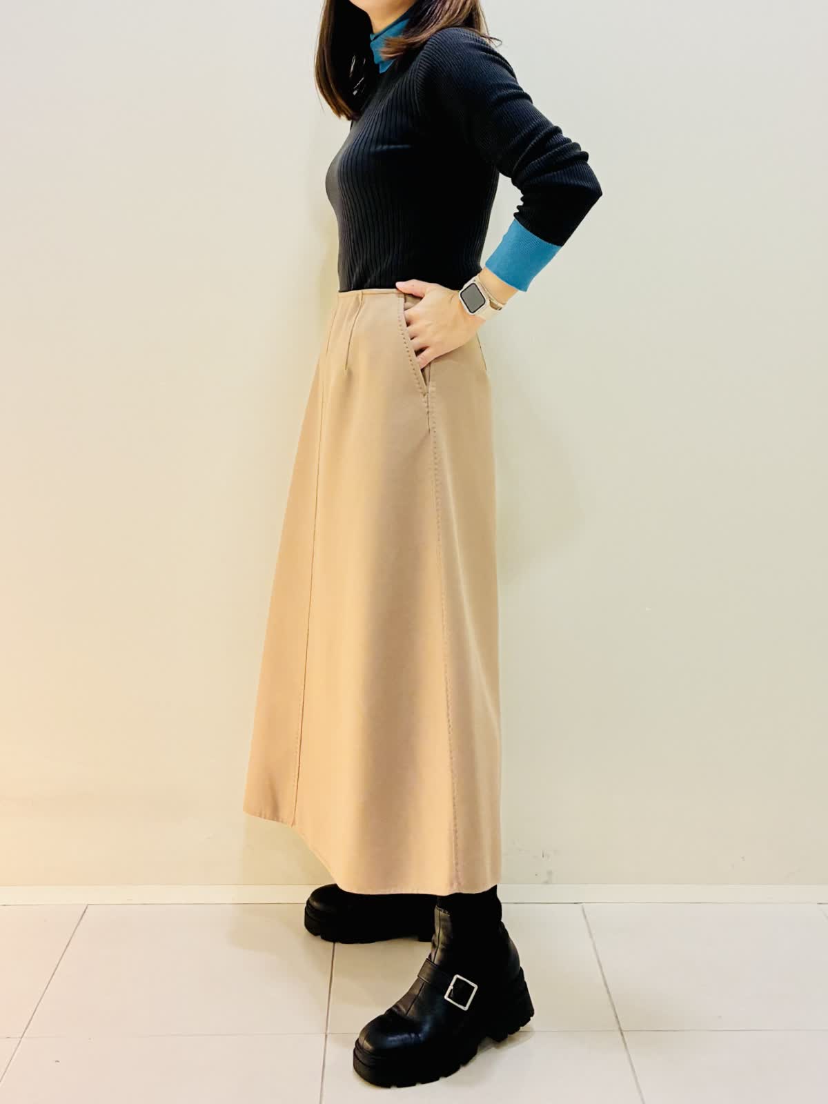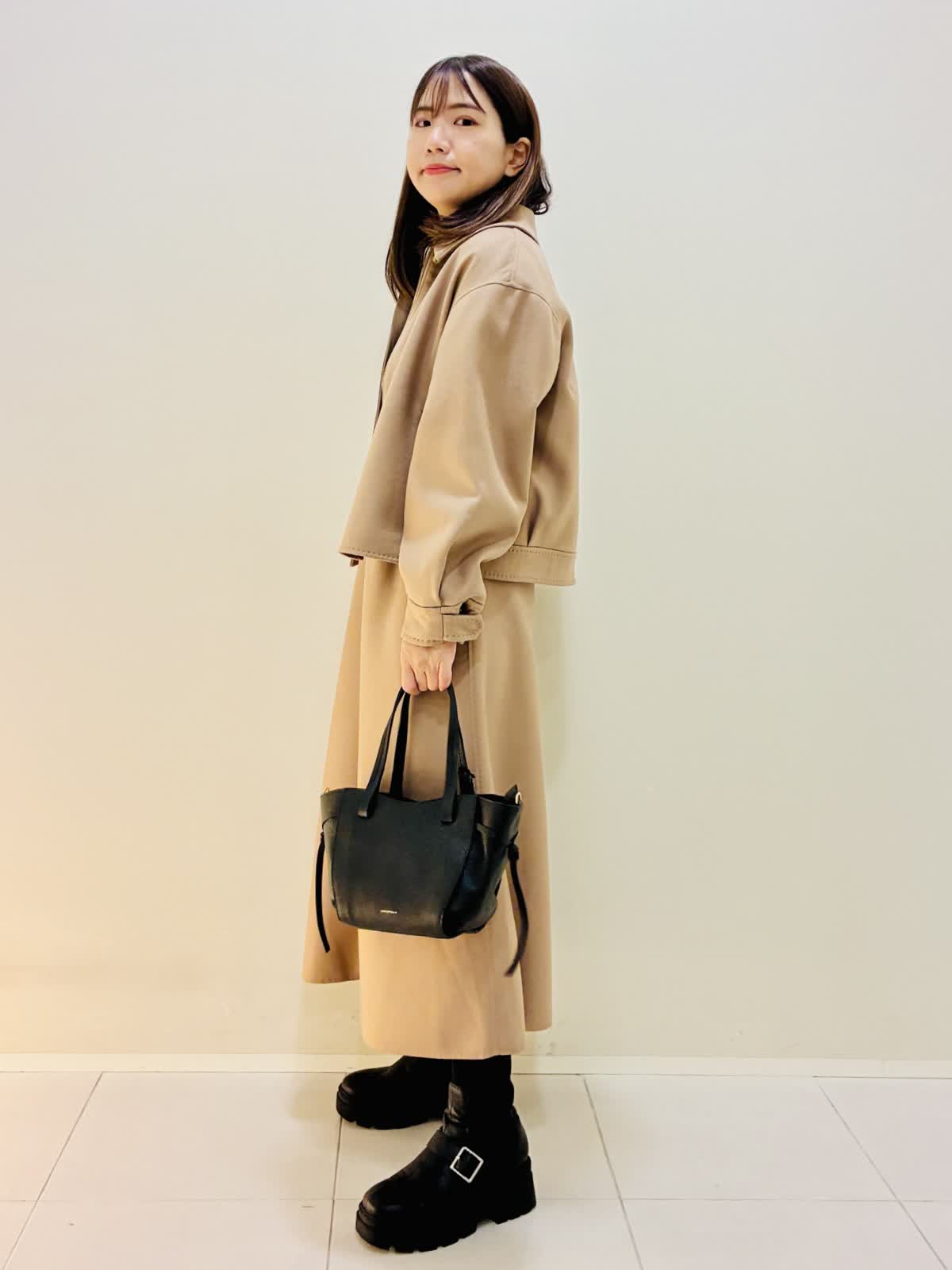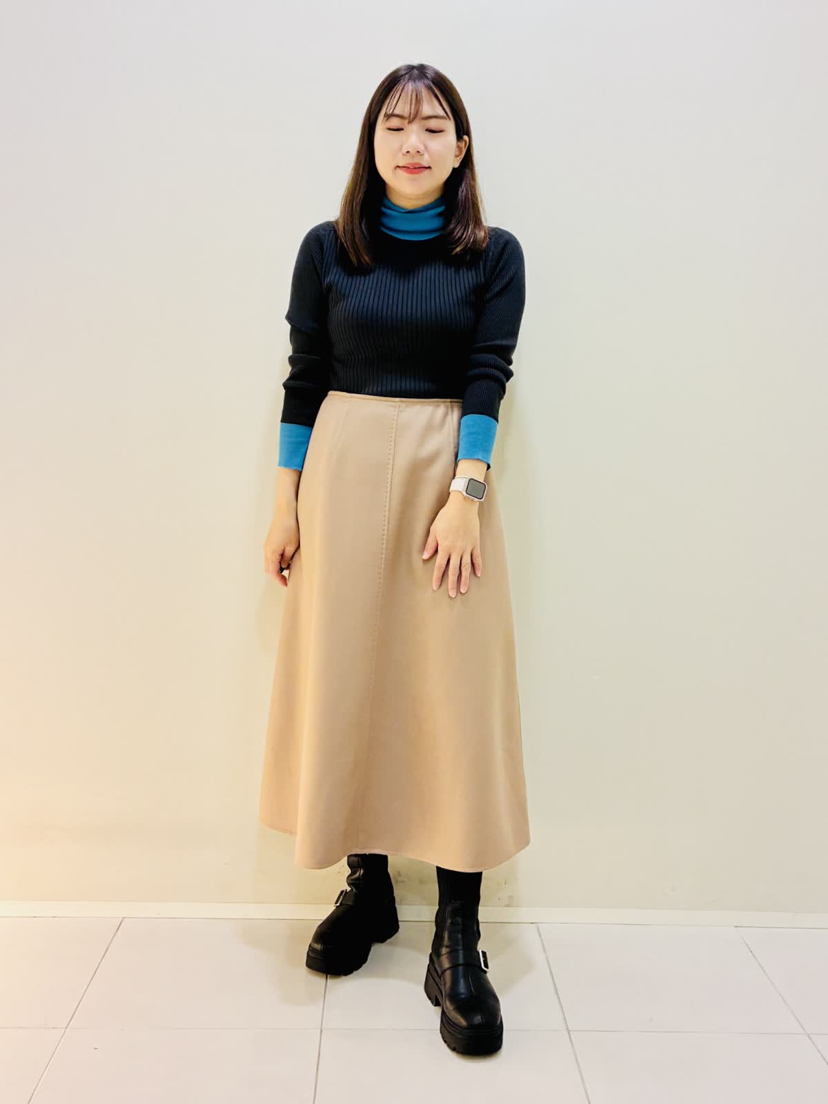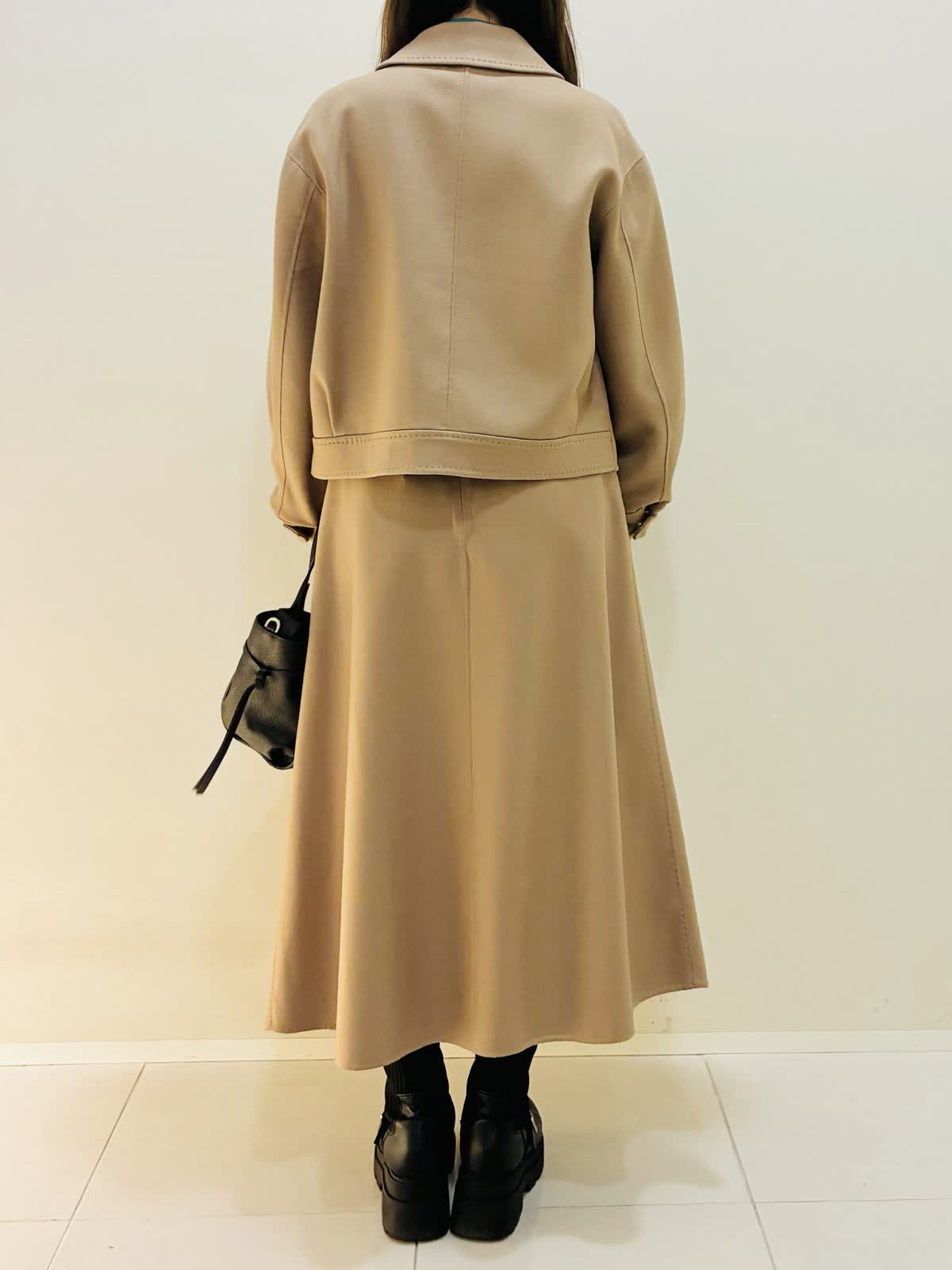 【着用サイズ】 コート:キャメル:9号サイズ スカート:キャメル:9号サイズ ニット:スミクロ:9号サイズ 『セットアップスタイリング』 ウール混のセットアップで、少しゆったり着れるので重ね着もしやすいです。 スカートもゴムではないけど、腰でとまるタイプなので楽に履けます。 ニットは着心地よくスミクロはターコイズブルーのバイカラーです。