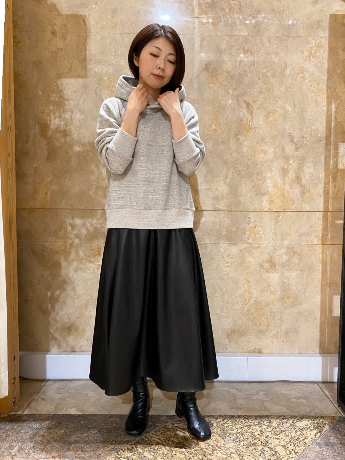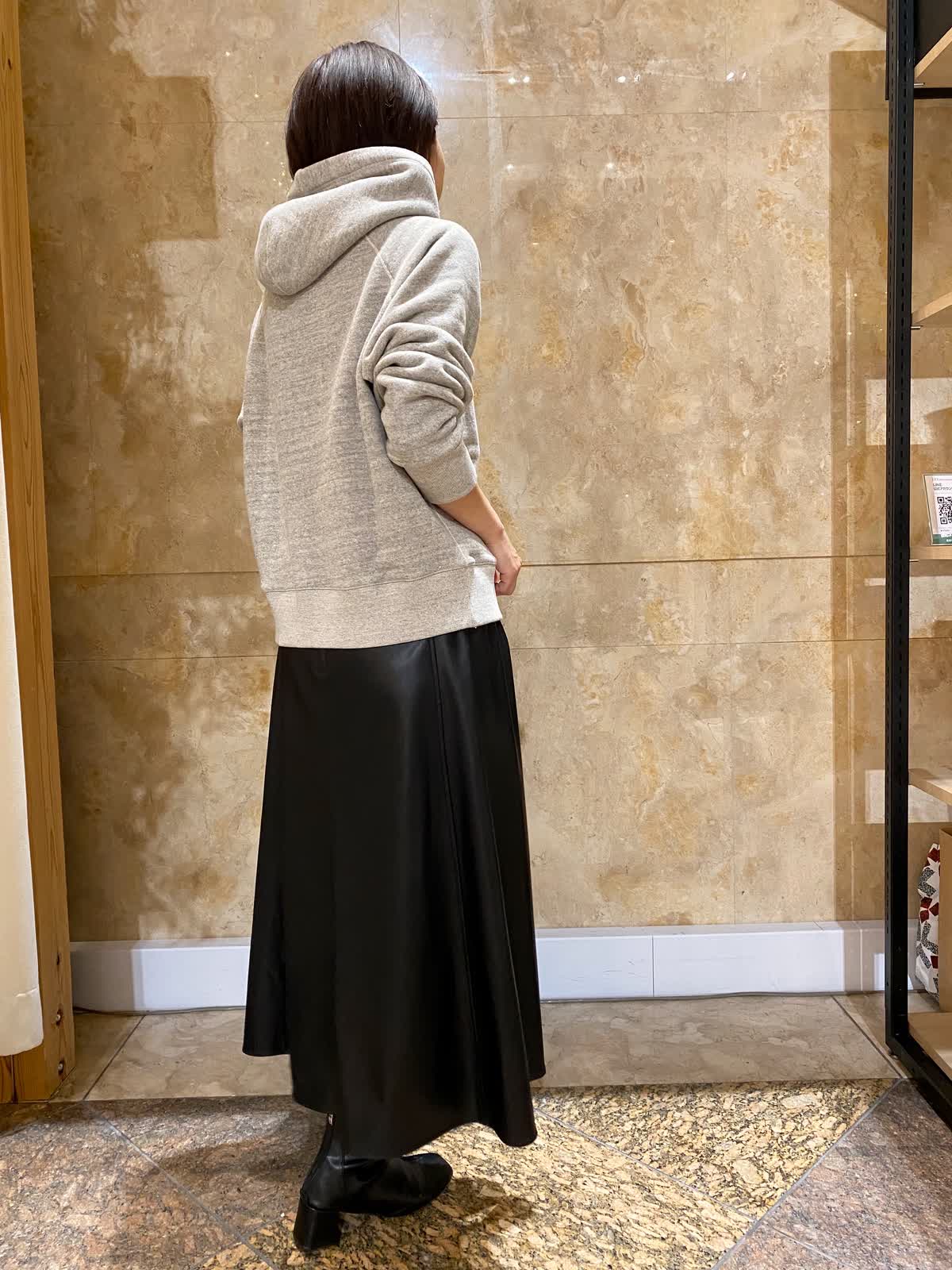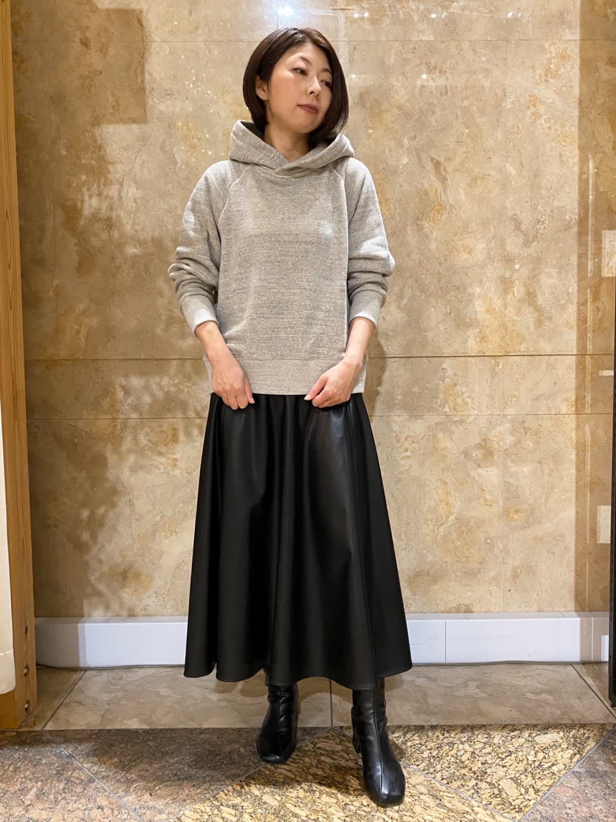 【着用サイズ/カラー】 コート:9号/ブラック カットソー : 9号/グレー スカート : 9号/ブラック 吊り編み機で時間をかけて丁寧に作られた生地を使用したフーディーは、ふわふわで柔らかく、驚くほどあったかいです。ぜひ試していただきたい1枚。TAIONのダウンは薄手で軽量。インナーダウンとしても活躍します。フェイクレザースカートと合わせてボーイッシュになり過ぎないようにしました。