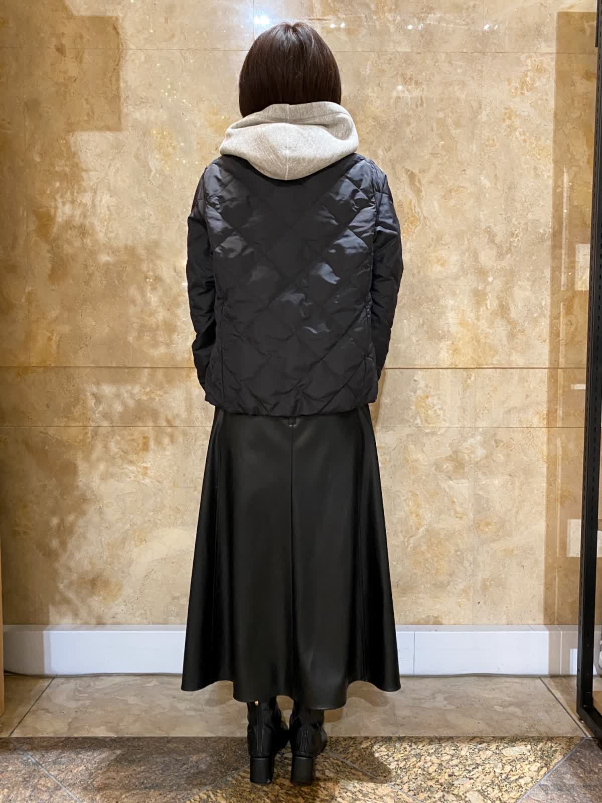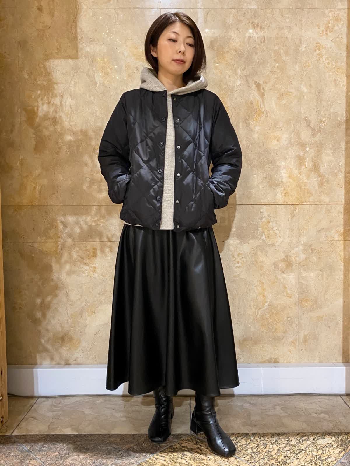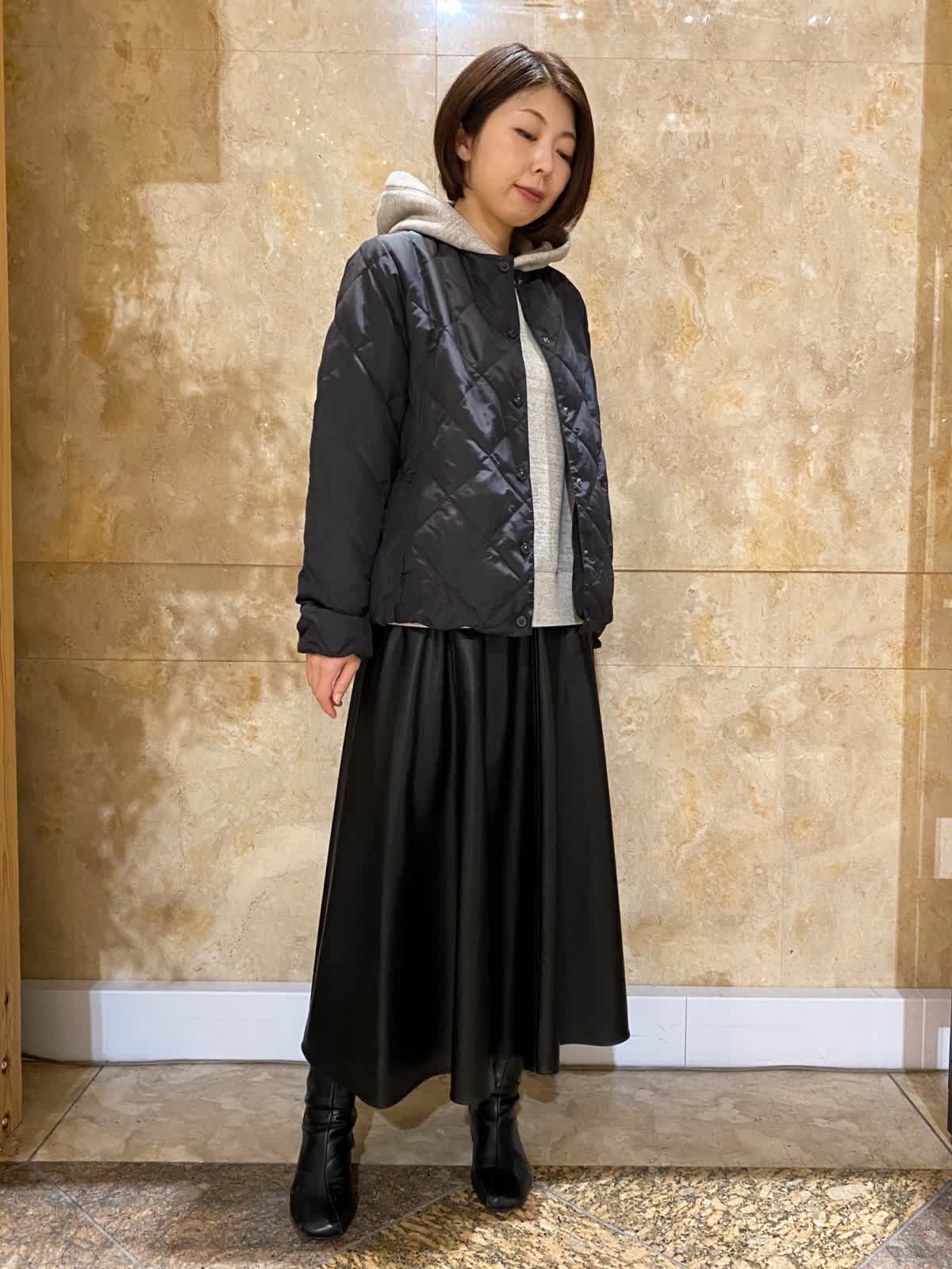 【着用サイズ/カラー】 コート:9号/ブラック カットソー : 9号/グレー スカート : 9号/ブラック 吊り編み機で時間をかけて丁寧に作られた生地を使用したフーディーは、ふわふわで柔らかく、驚くほどあったかいです。ぜひ試していただきたい1枚。TAIONのダウンは薄手で軽量。インナーダウンとしても活躍します。フェイクレザースカートと合わせてボーイッシュになり過ぎないようにしました。
