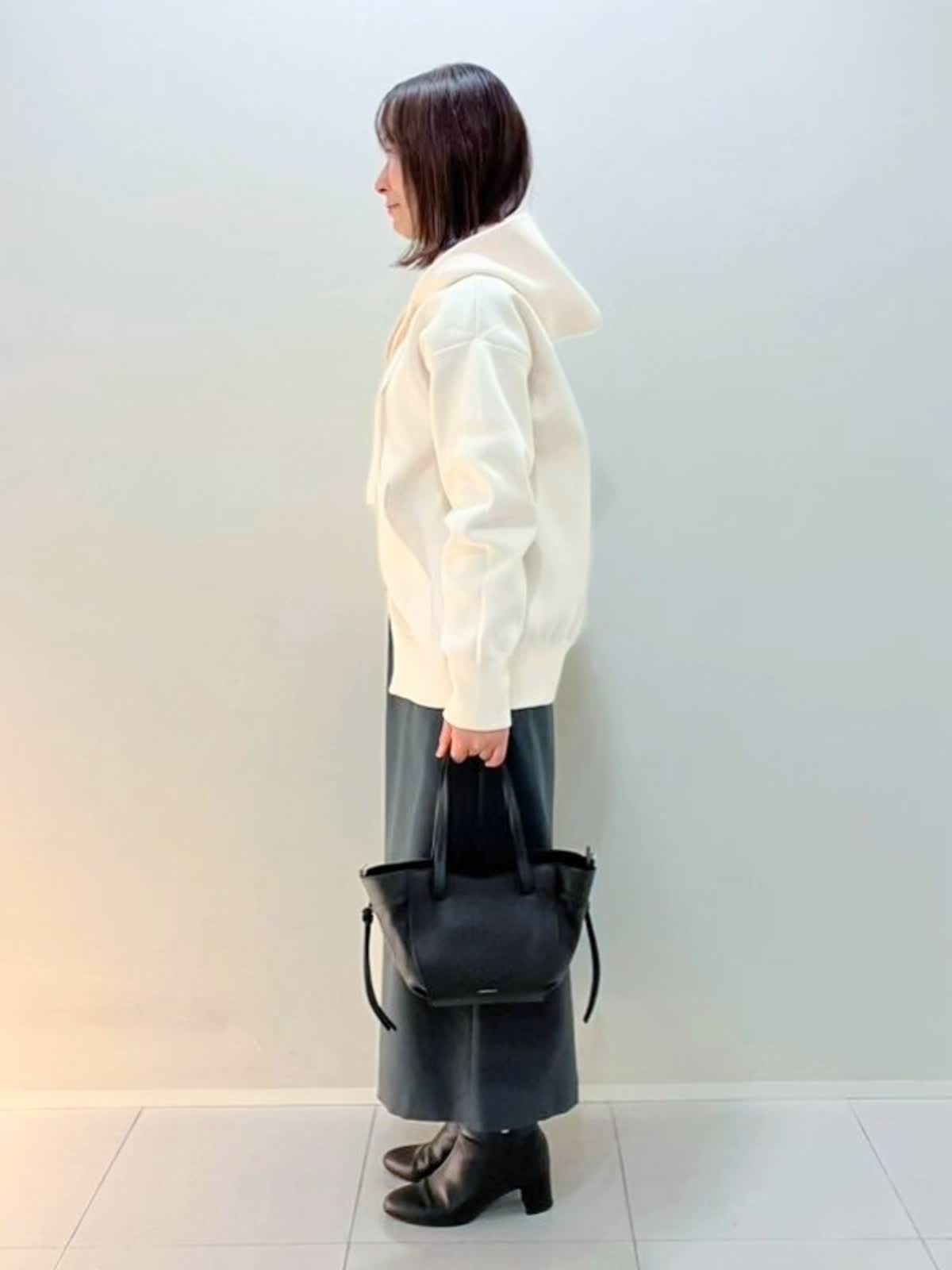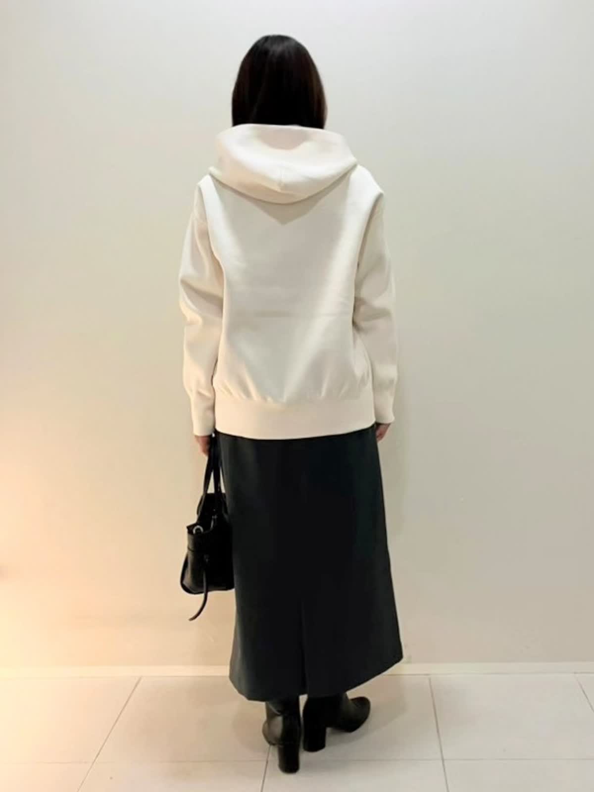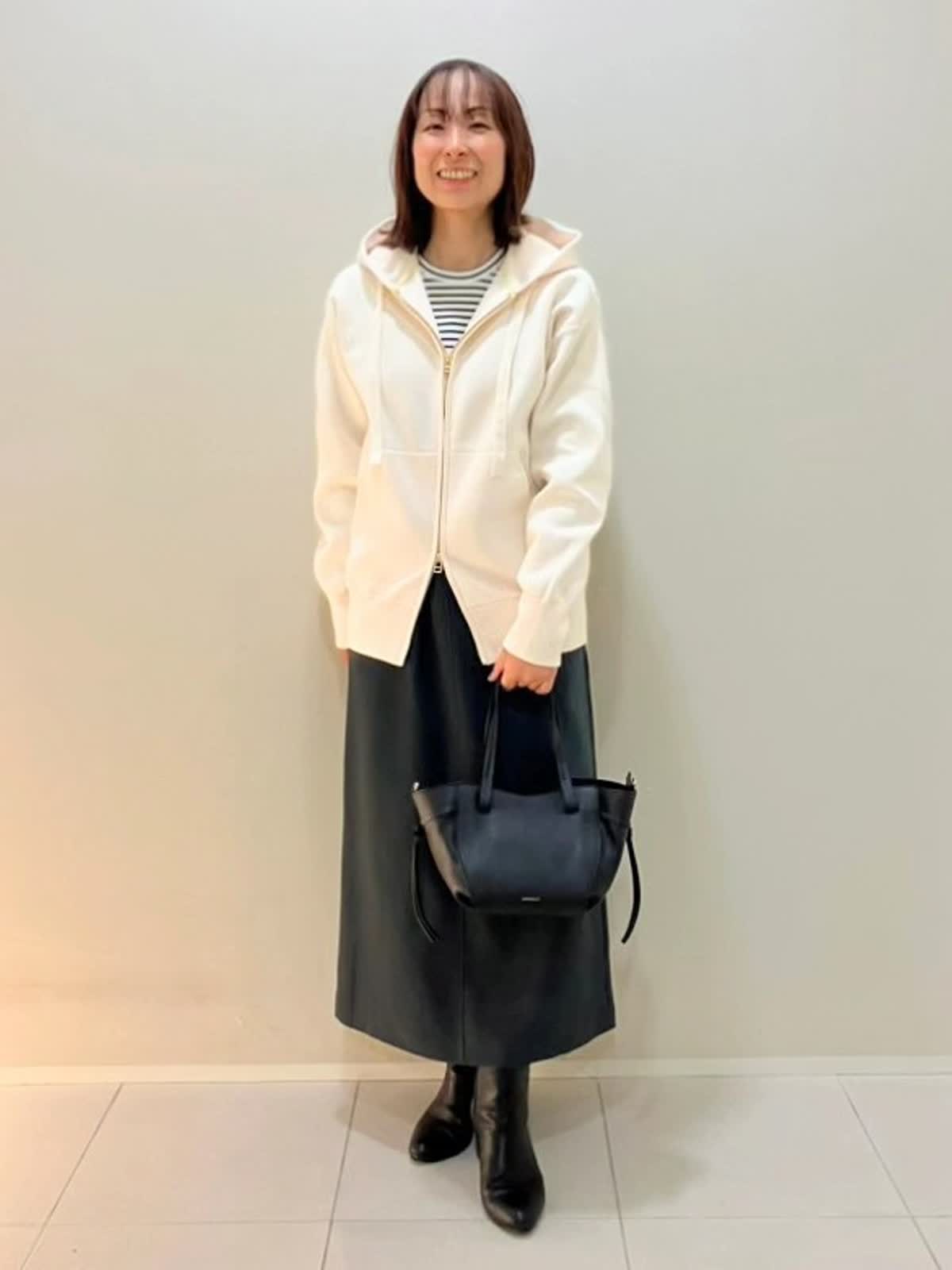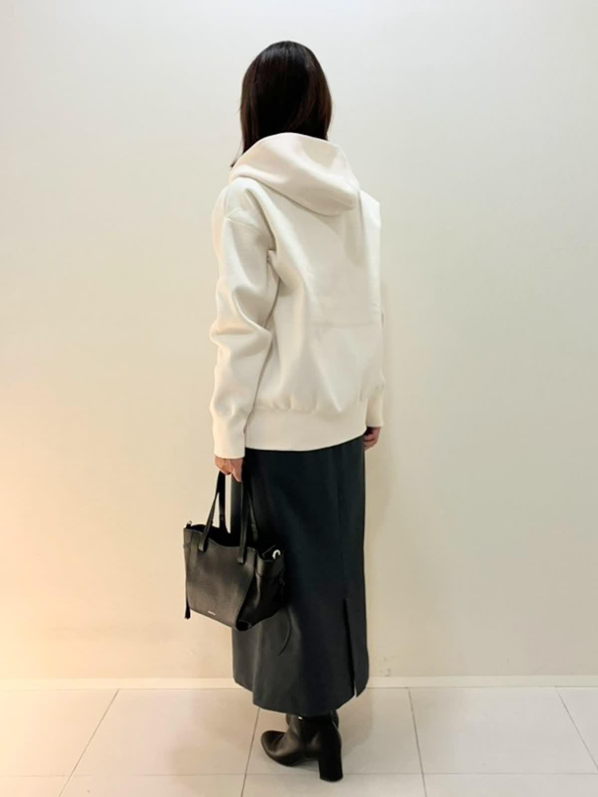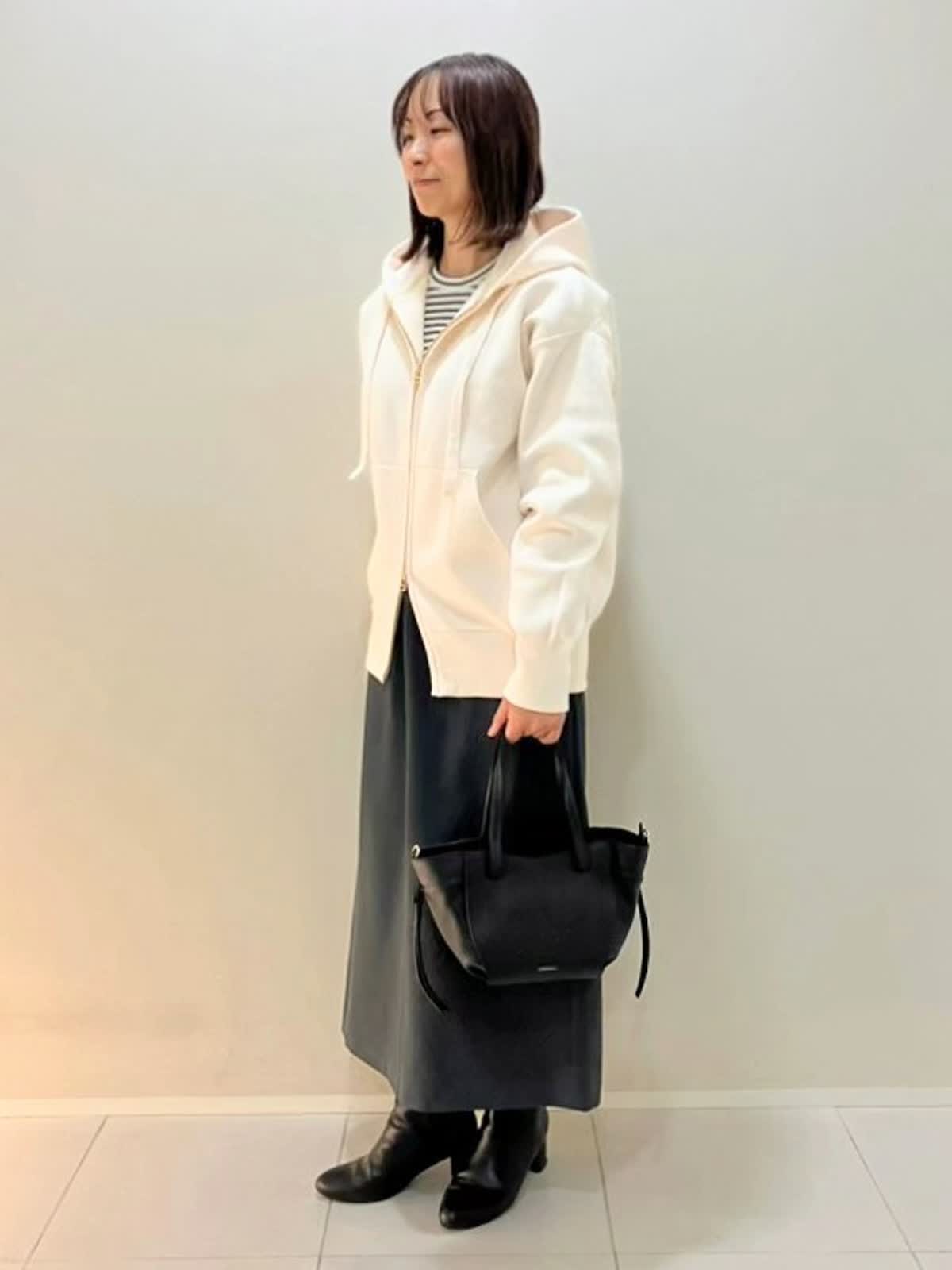 【着用サイズ】パーカー:フリー カットソー:9号 スカート:9号【着用カラー】パーカー:オフホワイト カットソー:ボーダー スカート:ミディアムグレー 秋のおでかけスタイル パーカーはポリエステル100%で伸縮性のあり、しっかりめの素材感。インナーはカシミヤ入りで着心地が抜群です。スカートはウールライクな肌触りで、ウエストゴム仕様で楽に着ていただけます。