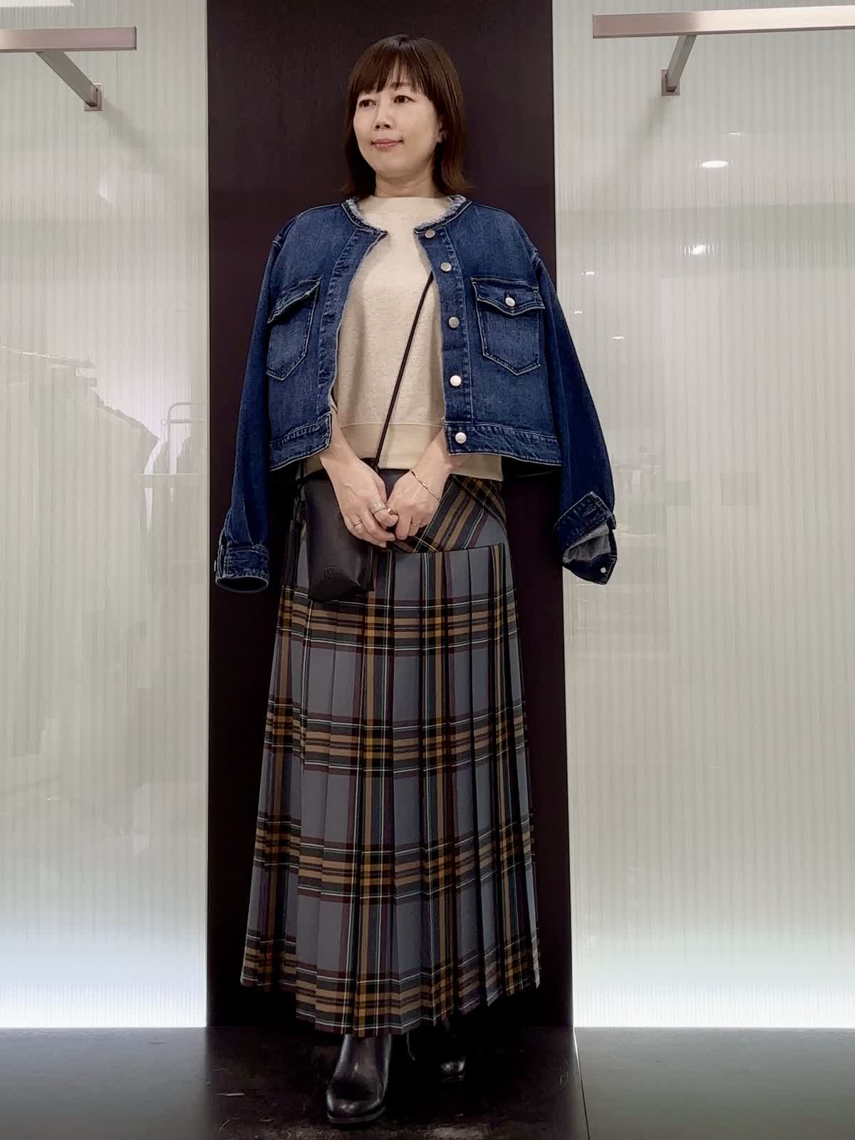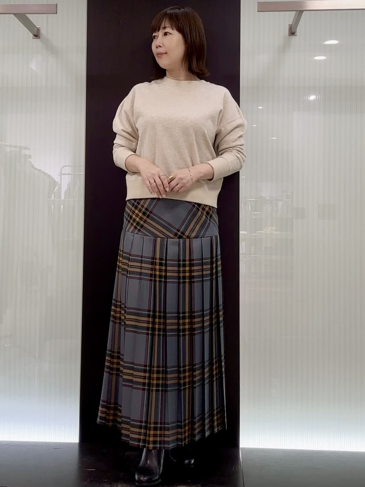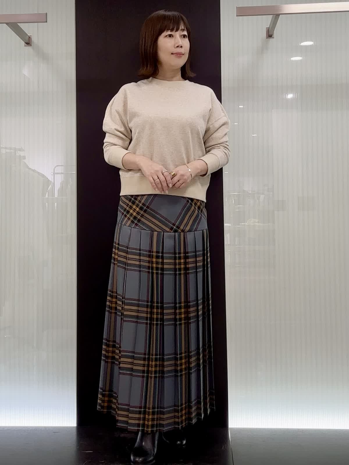 【着用サイズ】全て9号 【着用カラー】ブルゾン:インディゴ カットソー:アイボリー スカート:ブルーグレー カットソーはカジュアルになり過ぎず、女性らしい大人のスウェットとして着用いただけます。スカートはヒップ部分がヨーク切り替えでお腹腰周りがスッキリと見え、プリーツが広がらないデザインです。インでもアウトでもバランスが良いです。