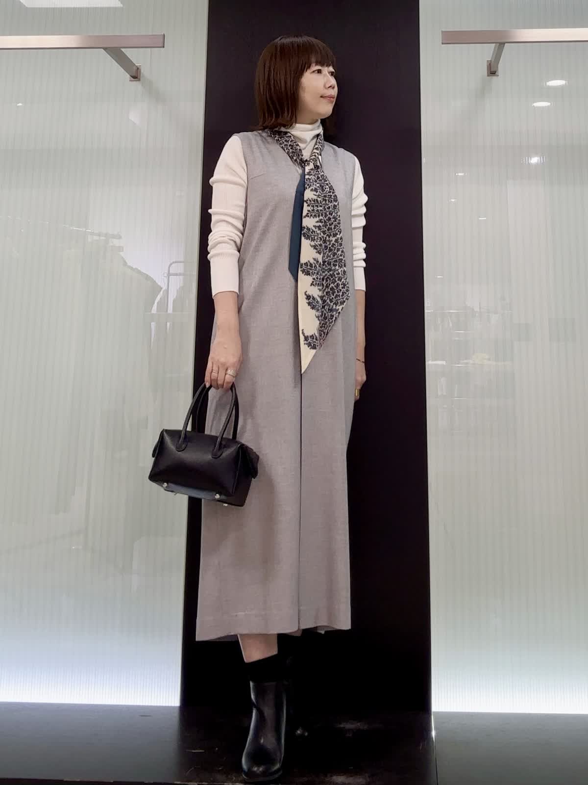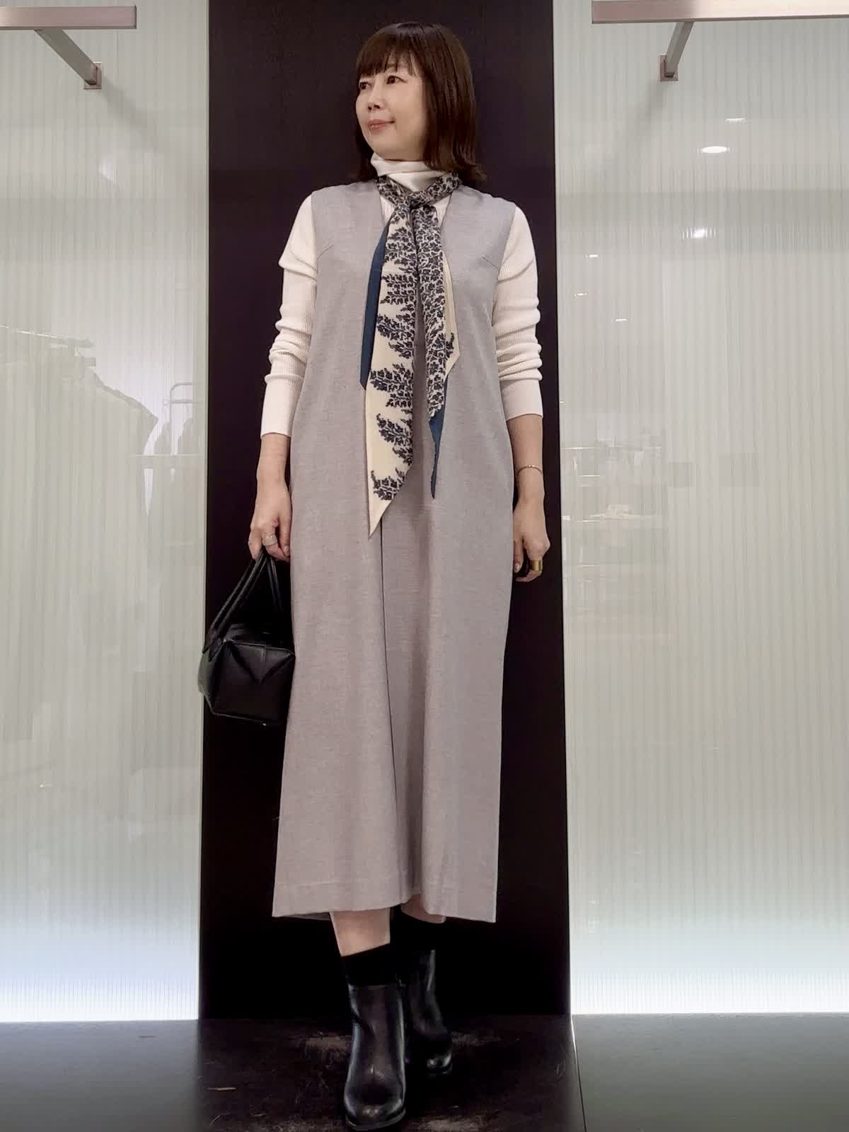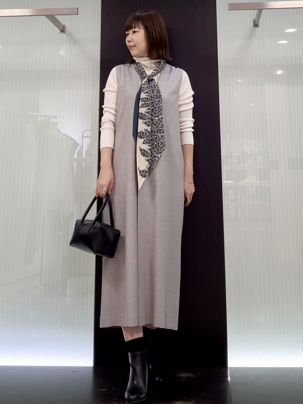 【着用サイズ】全て9号 【着用カラー】ニット:オフホワイト ワンピース:グレー ジャンパースカートは女性らしい深いVネックとゆるやかなコクーンシルエット。 インナーには着心地抜群のタートルニットを着用しました♪