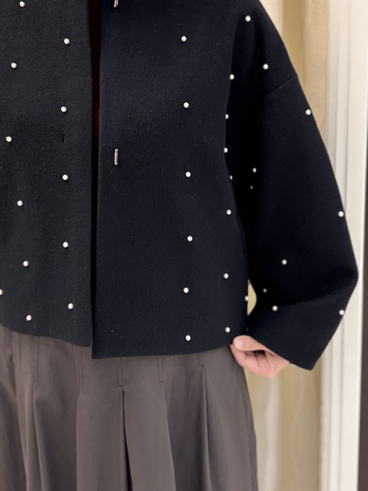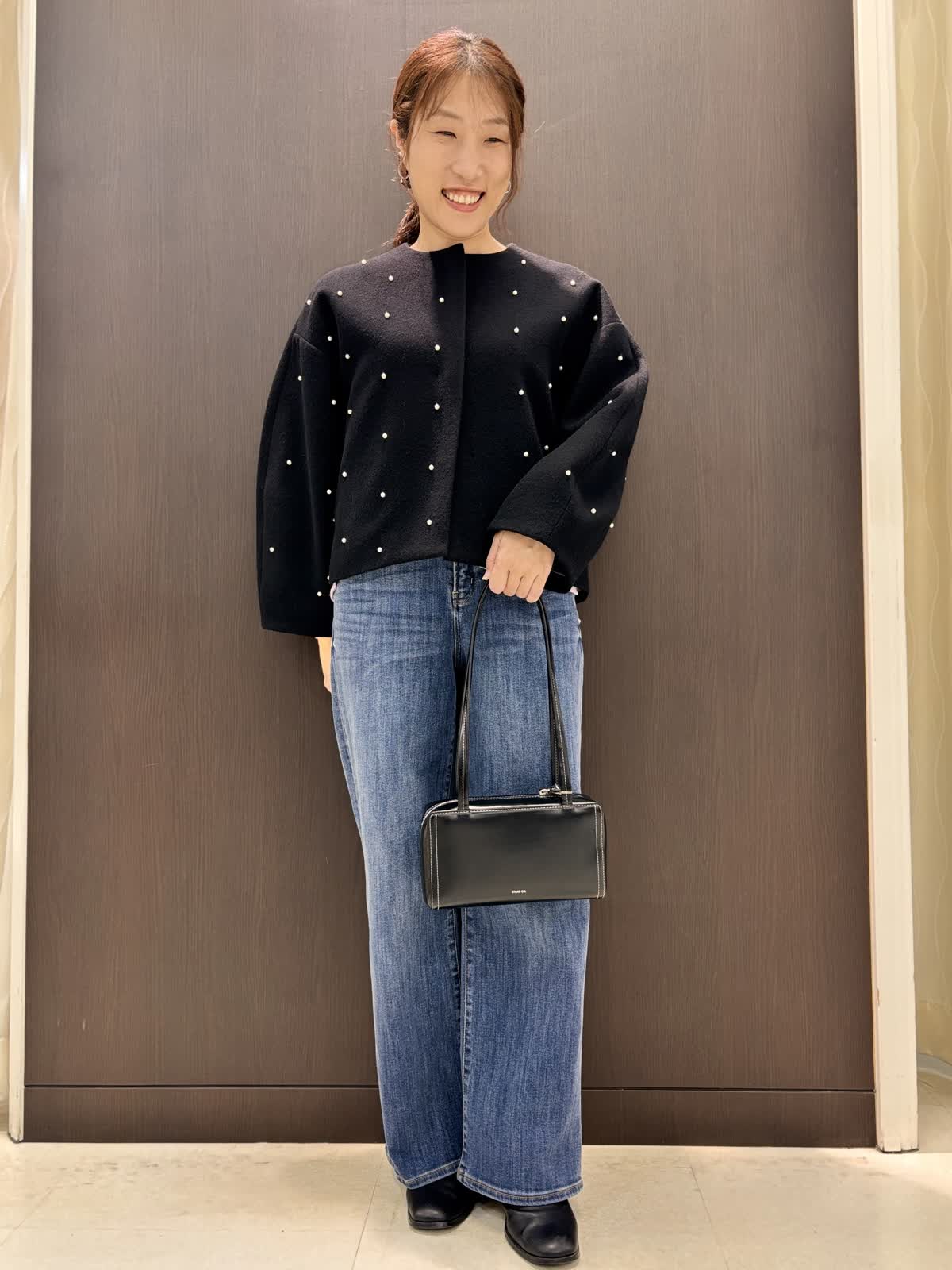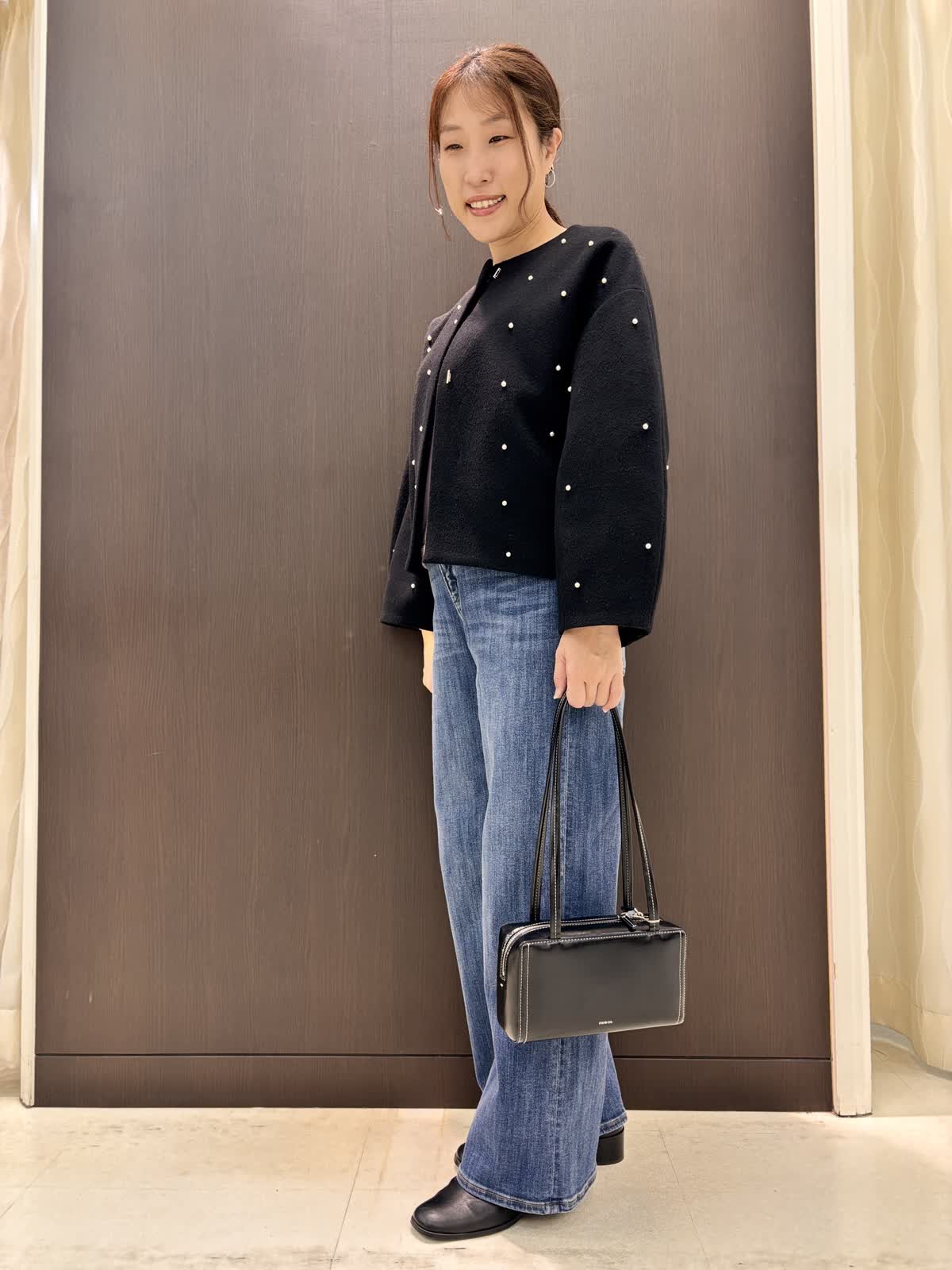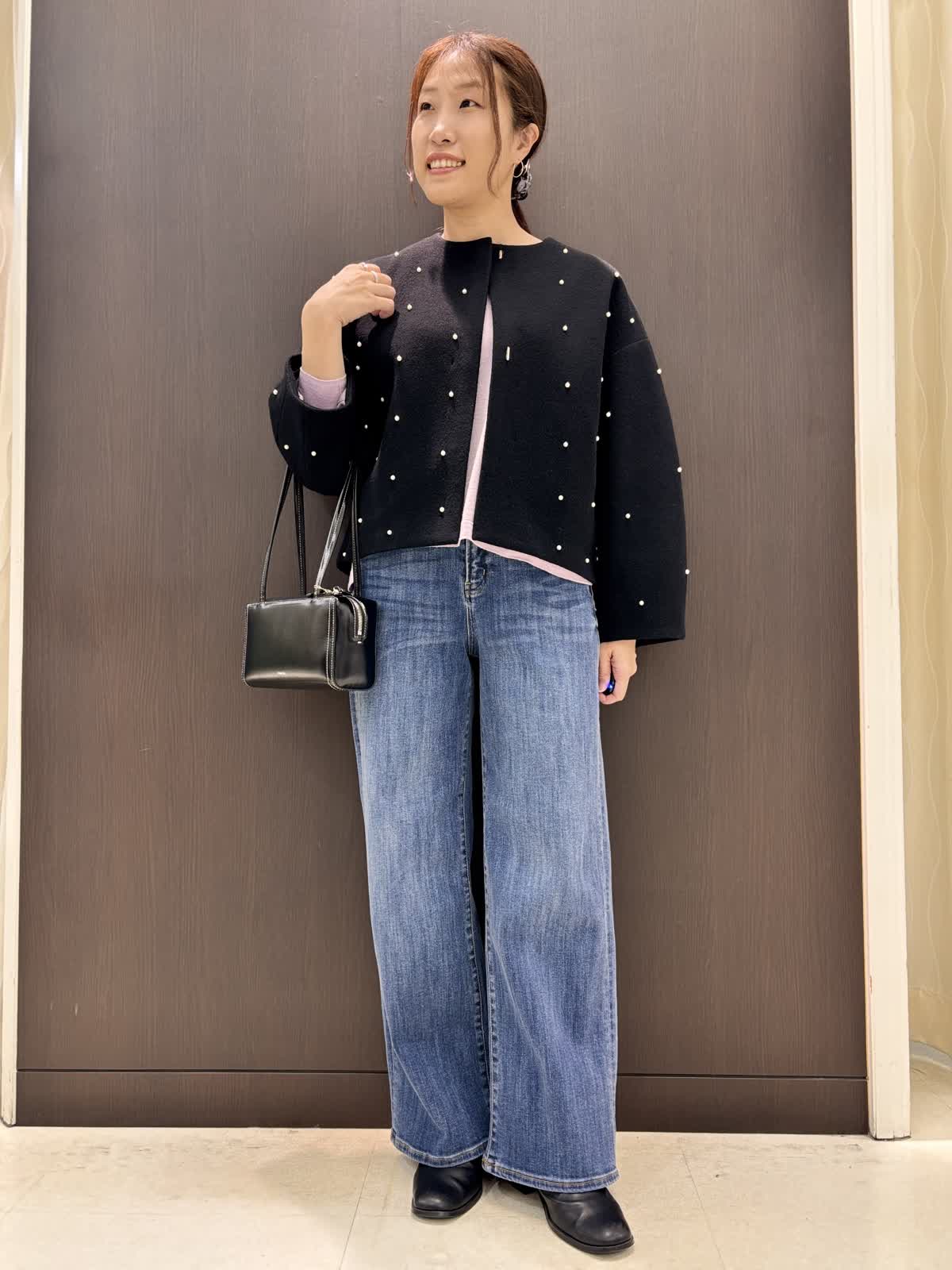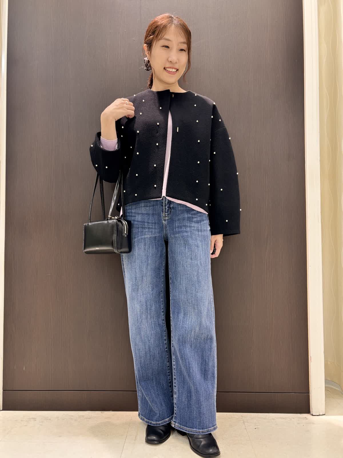 着るだけでかわいいパールコート。デニムに合わせてももちろんOK!シルエットが丸みを帯びていてゆるっとした見え感が今っぽいです。短め丈のコートは早く買ってちょっと寒いなと言う日にすぐ着れるのでぜひ早くゲットしてがオススメ。ジャケット感覚で着れる軽さなのにウールの暖かみがあるので、インナーは薄手でも良さそう。