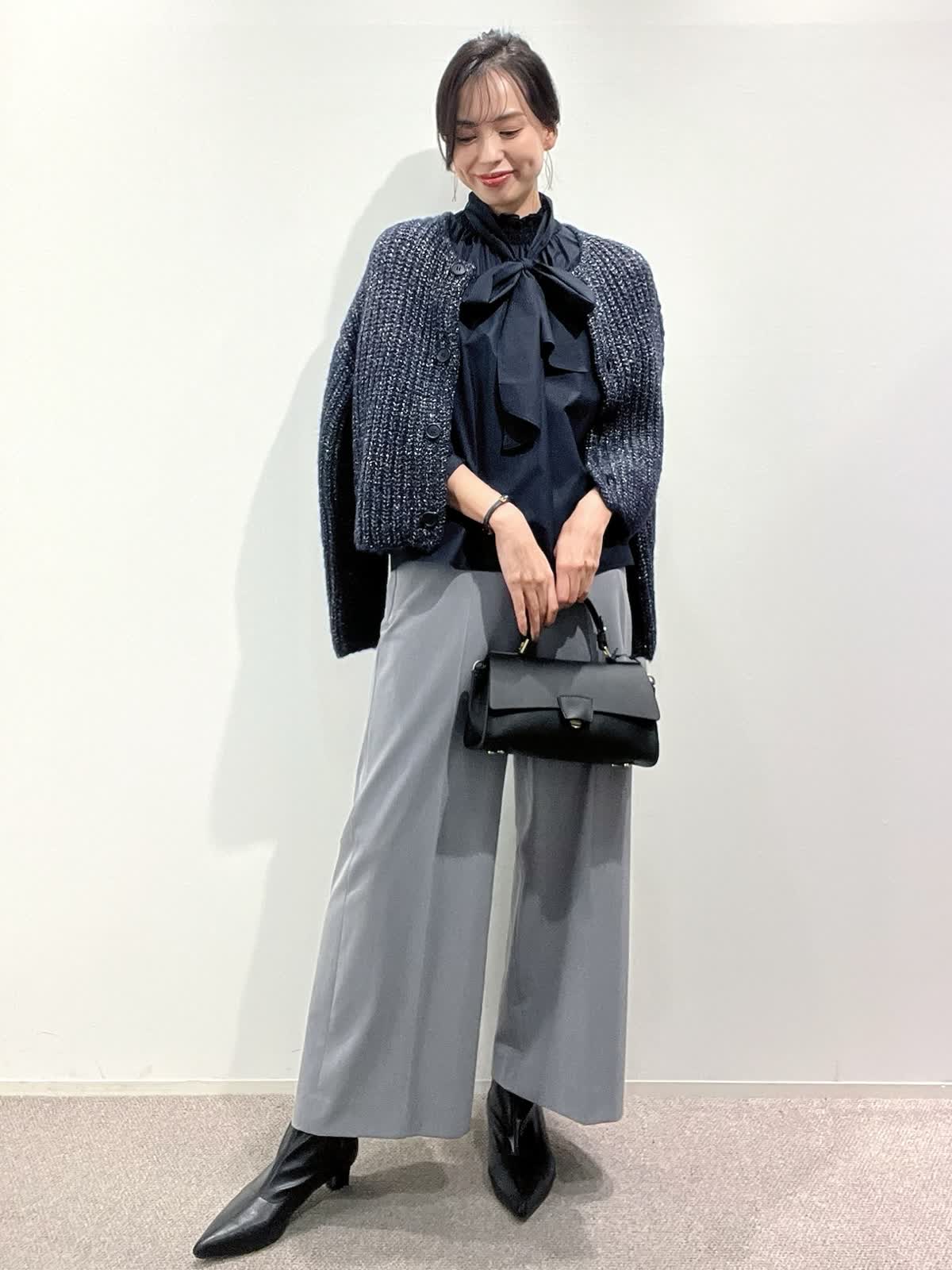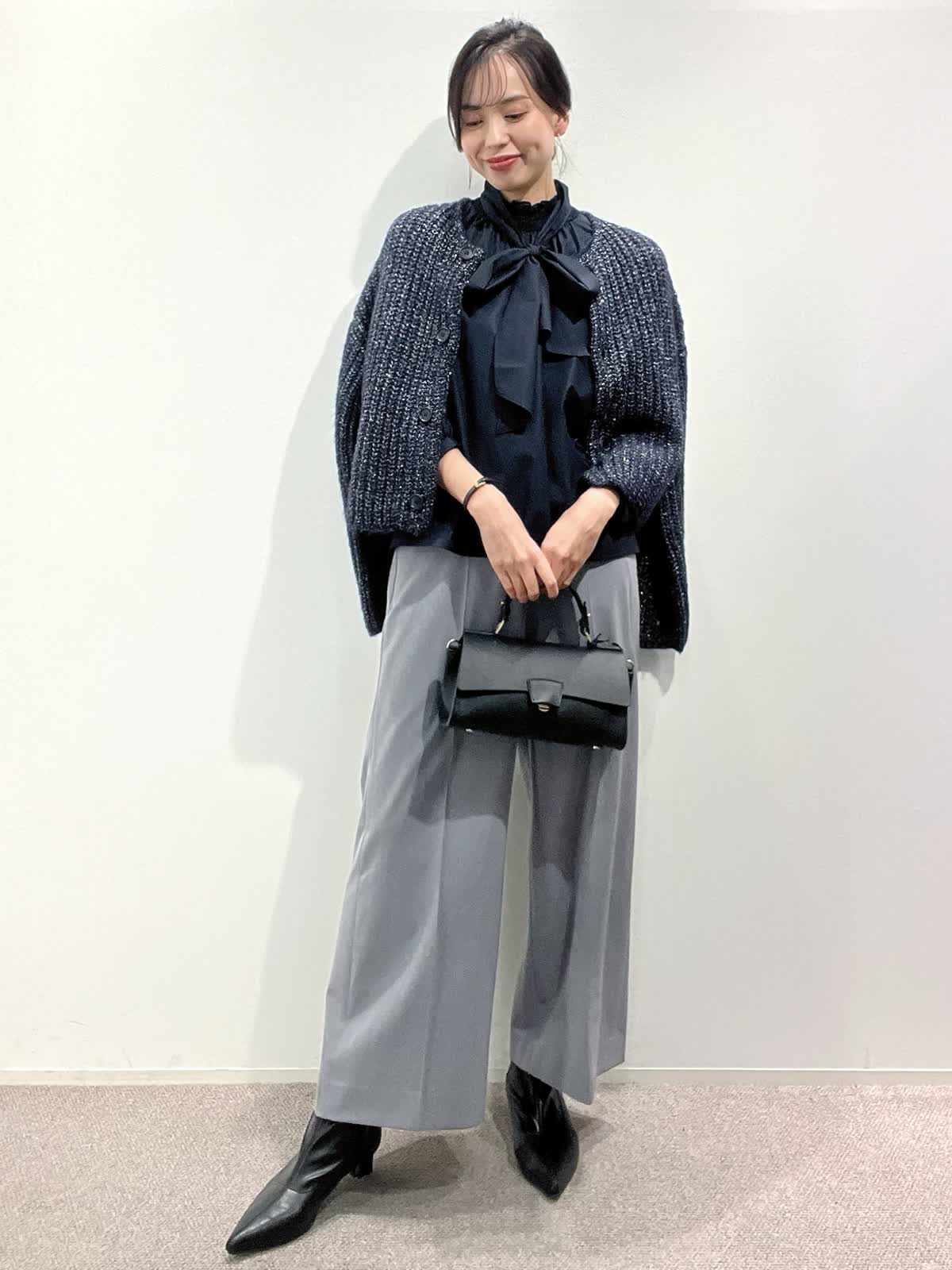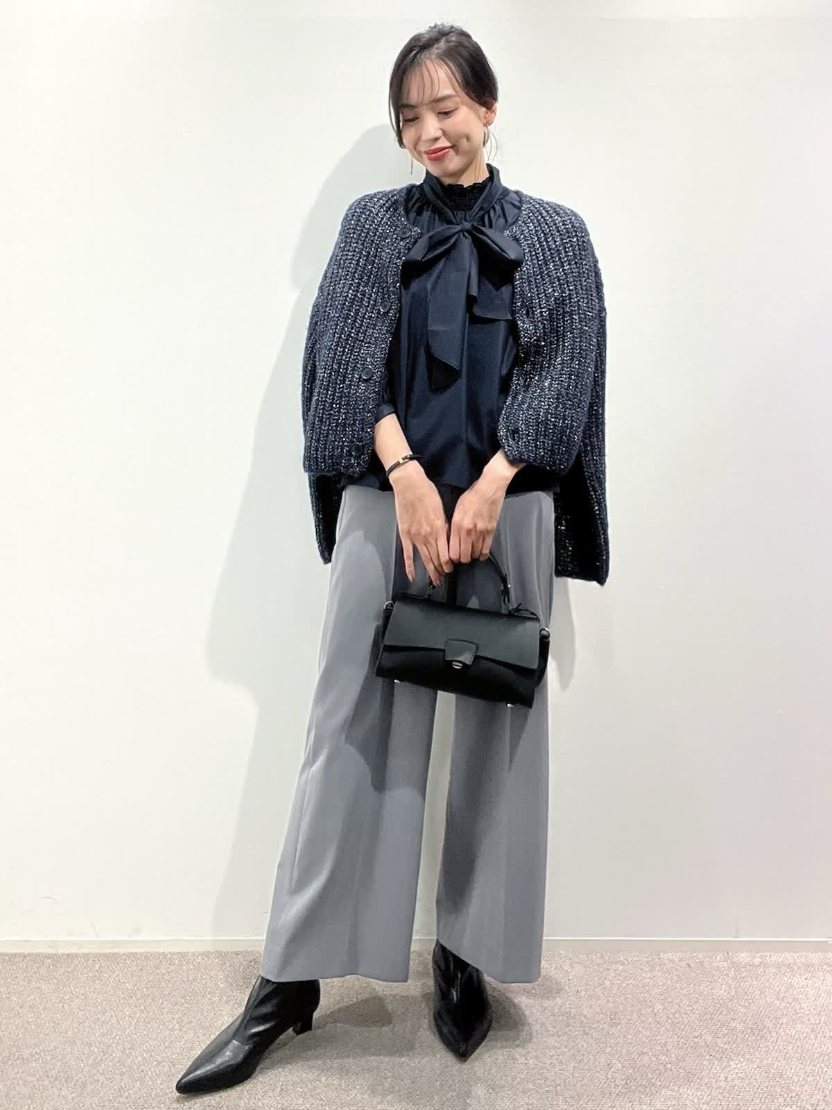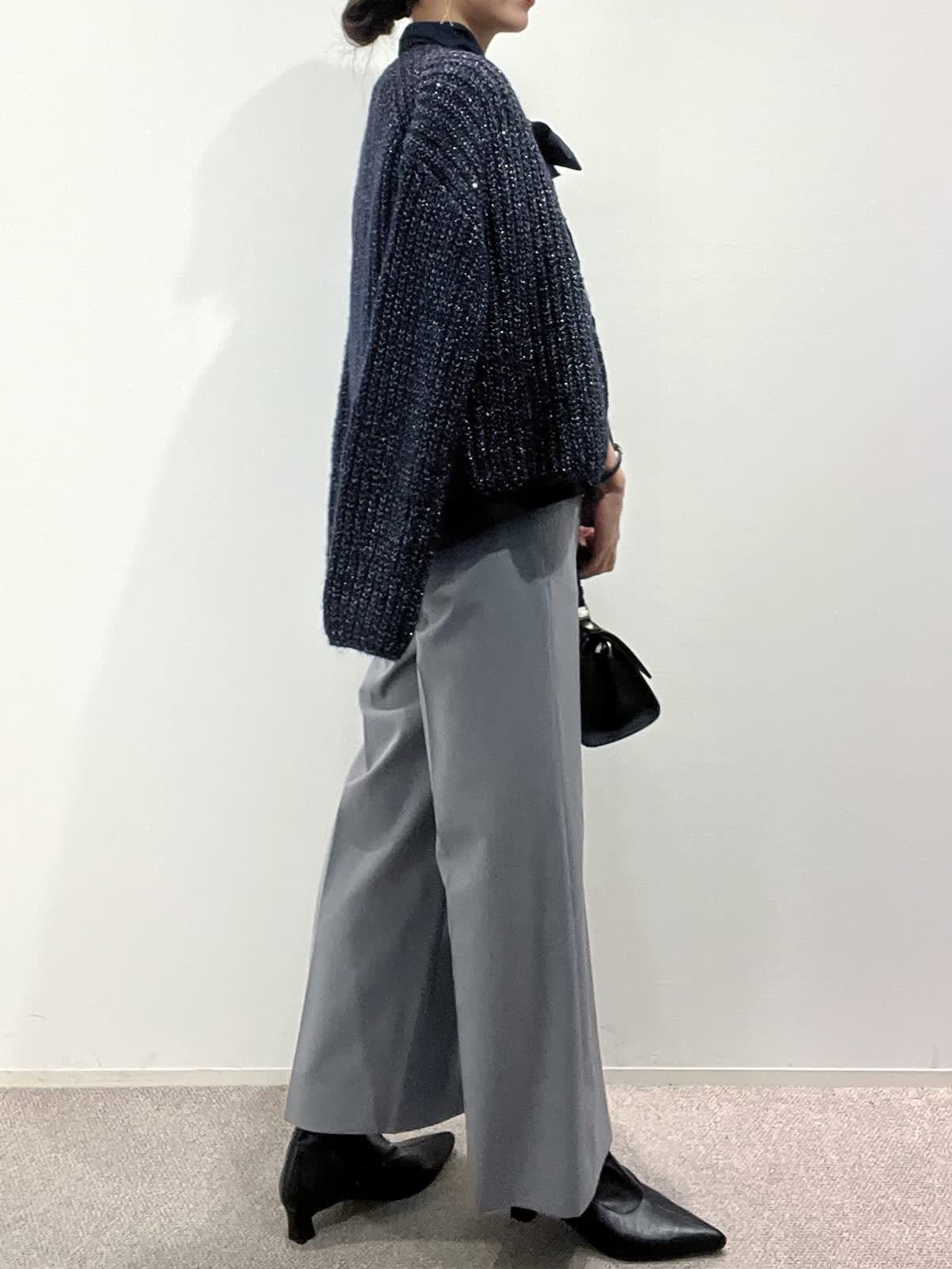 【着用サイズ】カーディガン:9号 ブラウス:9号 パンツ:9号 【着用カラー】カーディガン:ネイビー ブラウス:ネイビー パンツ:ミディアムグレー バッグ:ブラック 「クラシカルエレガントコーデ」 ラメニットカーディガンとボウタイブラウスの上品コンビの組み合わせで、華やかさが際立つクラシカルスタイル。 カーディガンは、ざっくりとした編み地で華やかなグリッターやラメ糸がポイント。柔らかい素材感で軽く羽織れるデザインなので、季節の変わり目にも大活躍。ネイビー×グレーの配色で、お仕事や綺麗めにも映えるおすすめスタイルです。