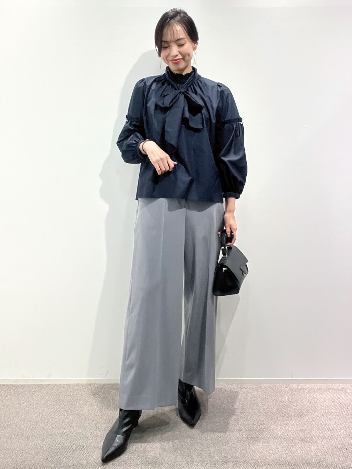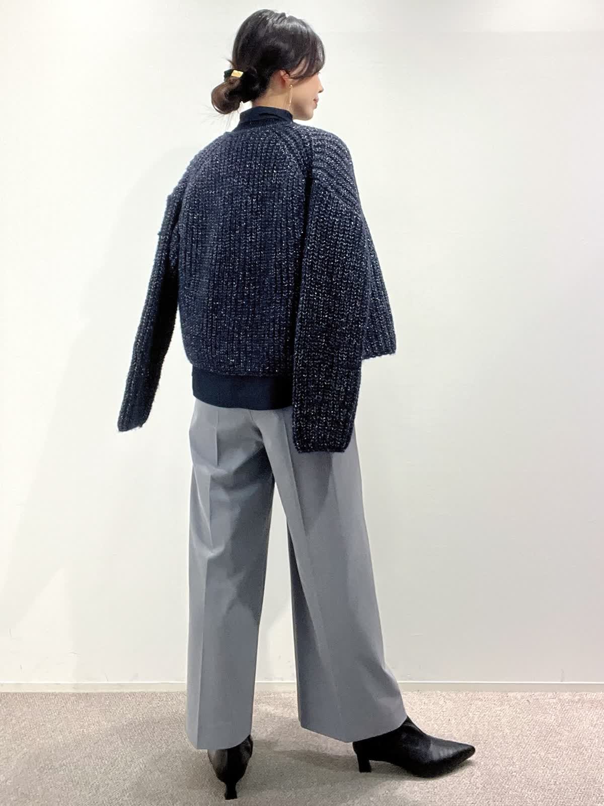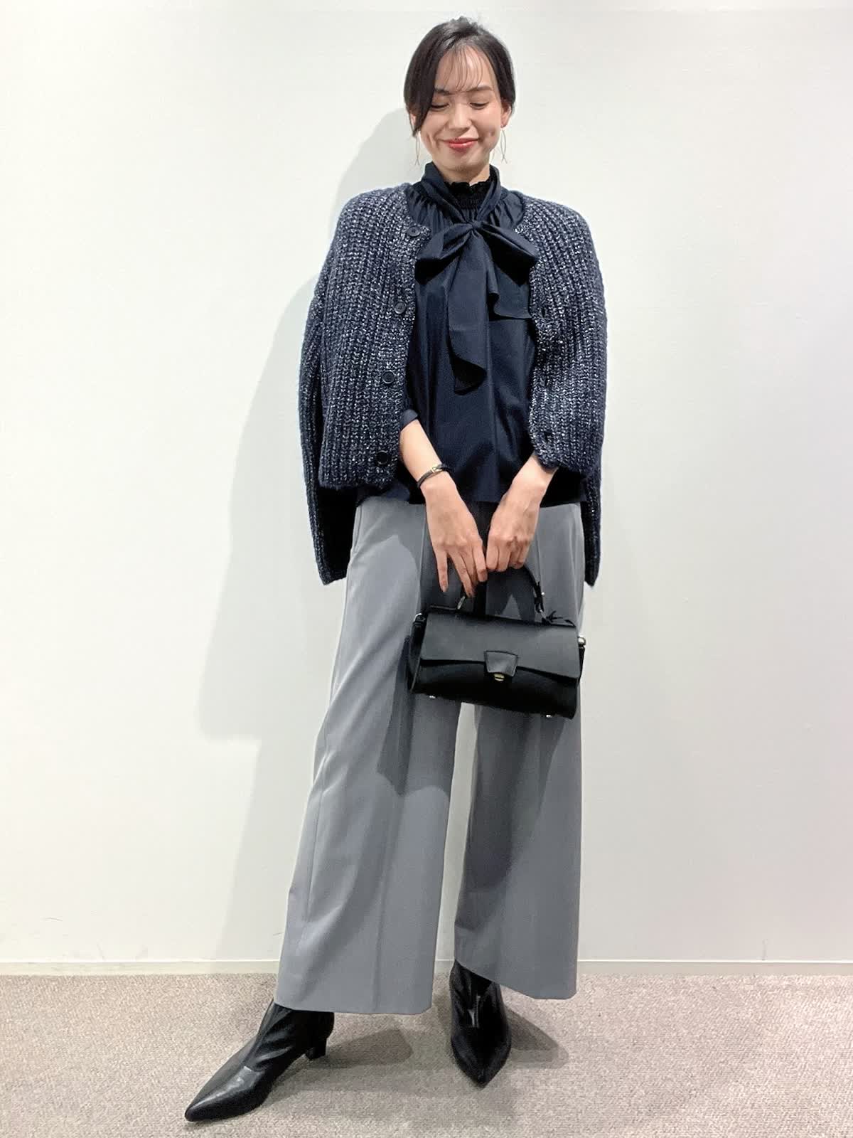 【着用サイズ】カーディガン:9号 ブラウス:9号 パンツ:9号 【着用カラー】カーディガン:ネイビー ブラウス:ネイビー パンツ:ミディアムグレー バッグ:ブラック 「クラシカルエレガントコーデ」 ラメニットカーディガンとボウタイブラウスの上品コンビの組み合わせで、華やかさが際立つクラシカルスタイル。 カーディガンは、ざっくりとした編み地で華やかなグリッターやラメ糸がポイント。柔らかい素材感で軽く羽織れるデザインなので、季節の変わり目にも大活躍。ネイビー×グレーの配色で、お仕事や綺麗めにも映えるおすすめスタイルです。