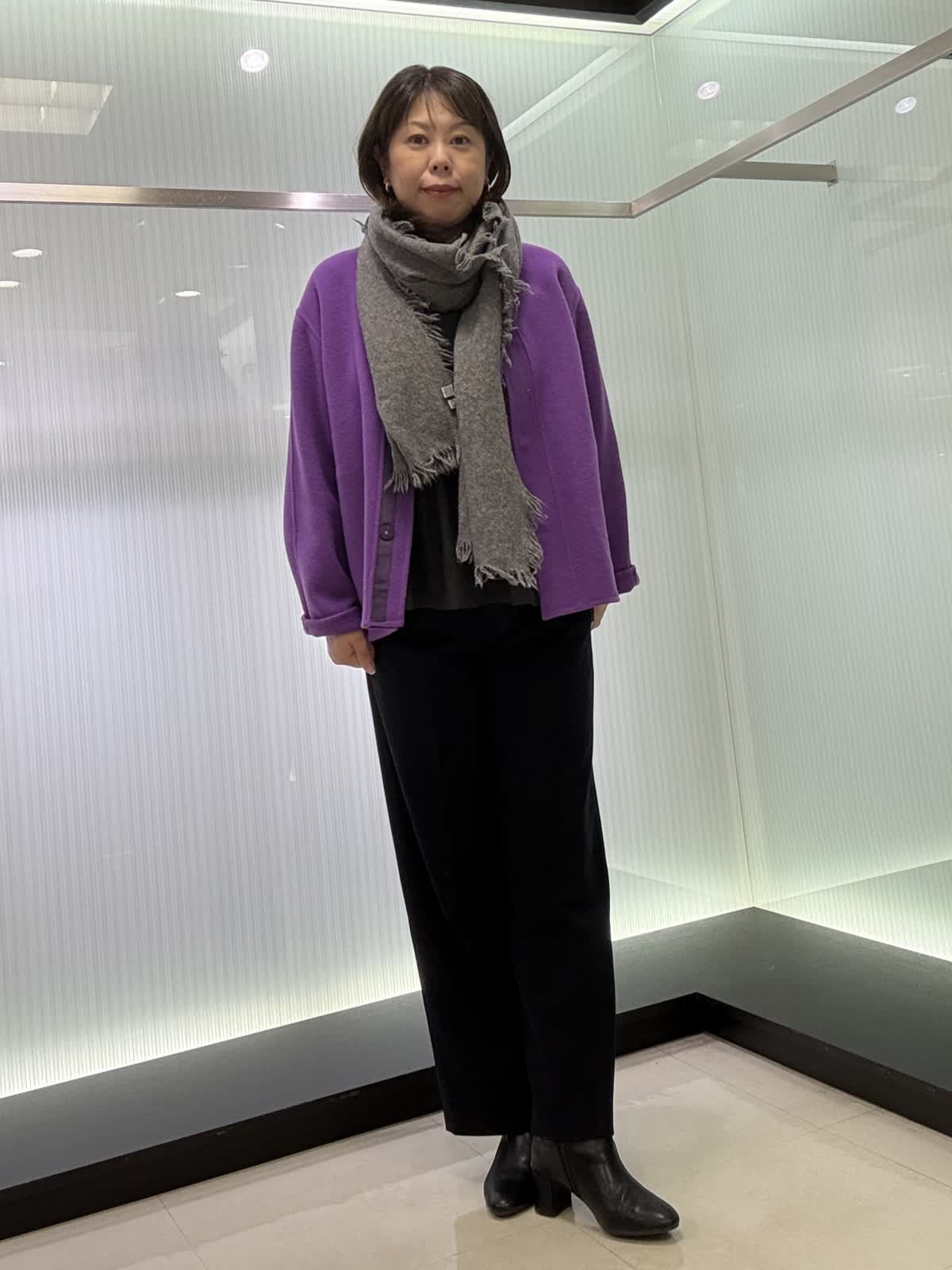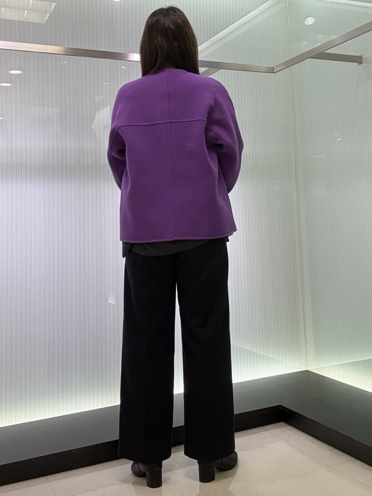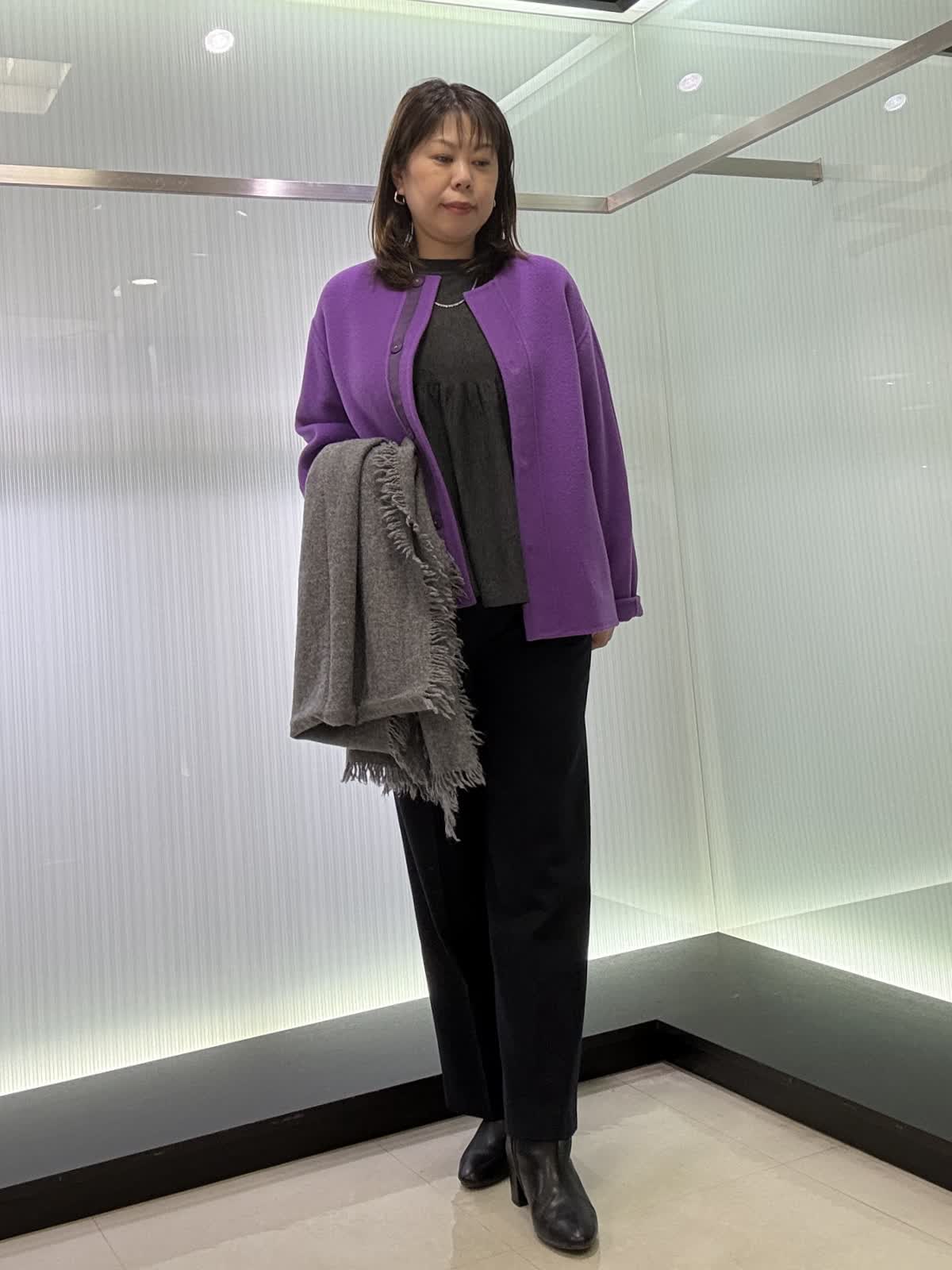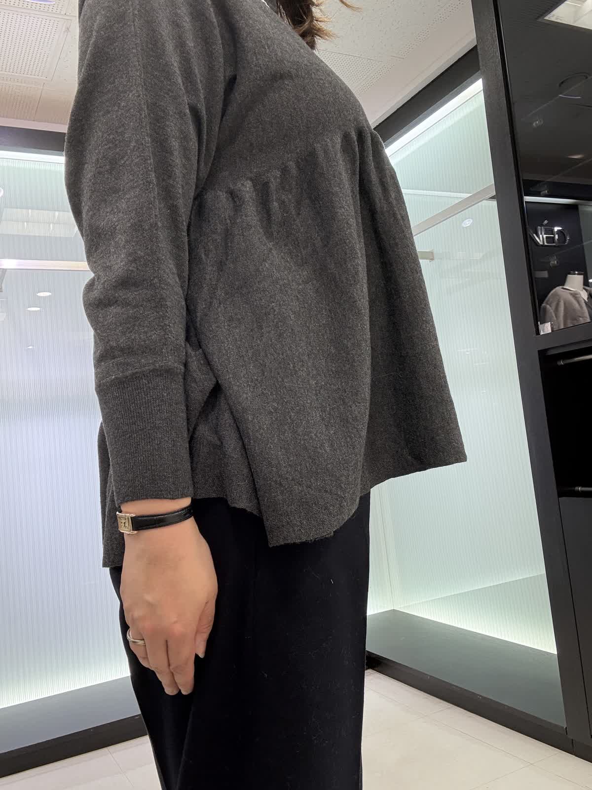 コート 9号 ウールリバーコート。ノーカラータイプなのでタートルで合わせて着てもスッキリ見えます。とても軽いので着ていて疲れません。オーバータイプなので中も着込めます。 ニット 9号ギャザーを使ったお腹周りがフワッと見えるデザインです。長さもあるので後ろ姿も気になりません。一枚で着映えするニットです。 パンツ 11号 ウール素材のワイドパンツ。ウール素材なので暖かく履いていただけます。シンプルなので着回しが効きます。裏地付きです。
