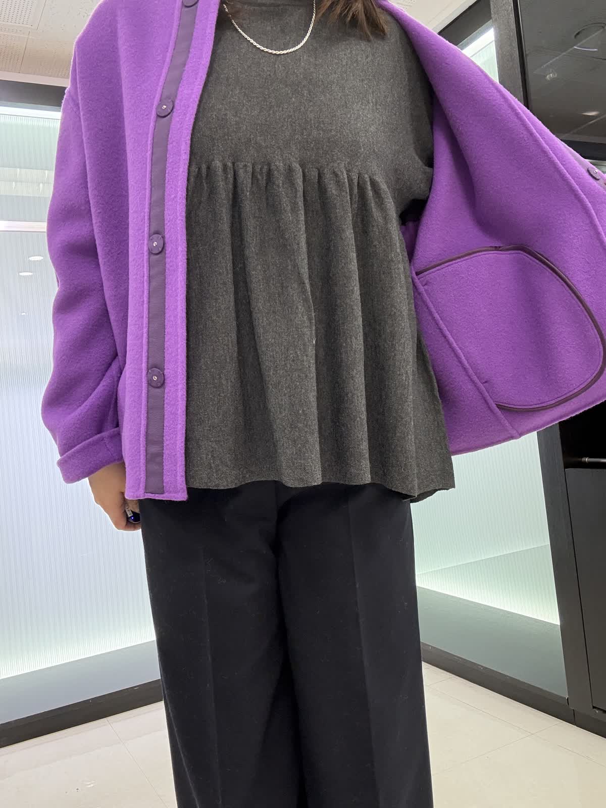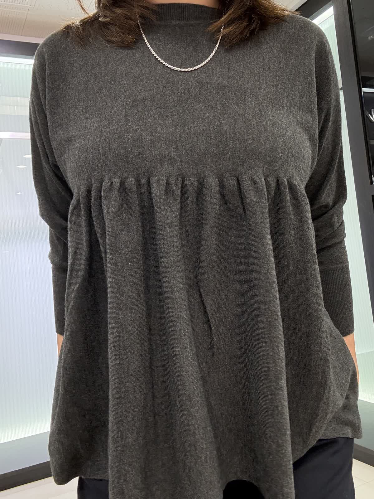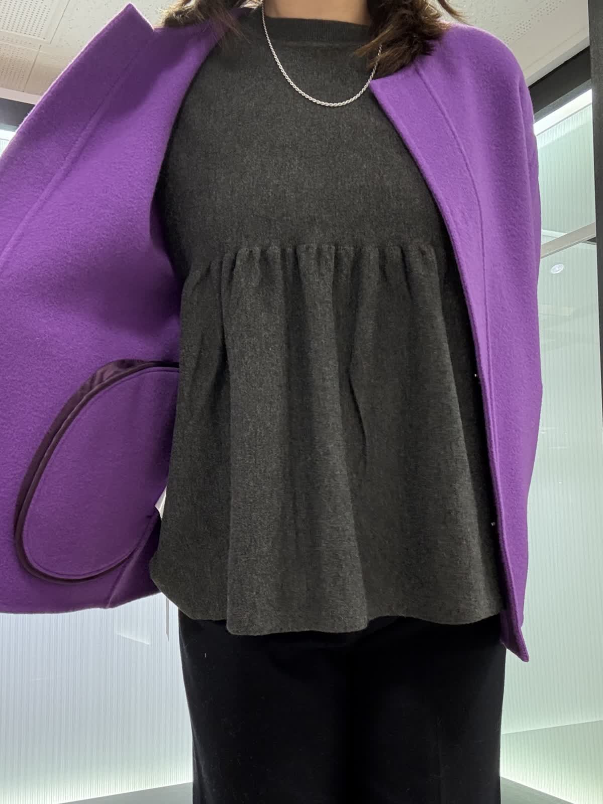 コート 9号 ウールリバーコート。ノーカラータイプなのでタートルで合わせて着てもスッキリ見えます。とても軽いので着ていて疲れません。オーバータイプなので中も着込めます。 ニット 9号ギャザーを使ったお腹周りがフワッと見えるデザインです。長さもあるので後ろ姿も気になりません。一枚で着映えするニットです。 パンツ 11号 ウール素材のワイドパンツ。ウール素材なので暖かく履いていただけます。シンプルなので着回しが効きます。裏地付きです。