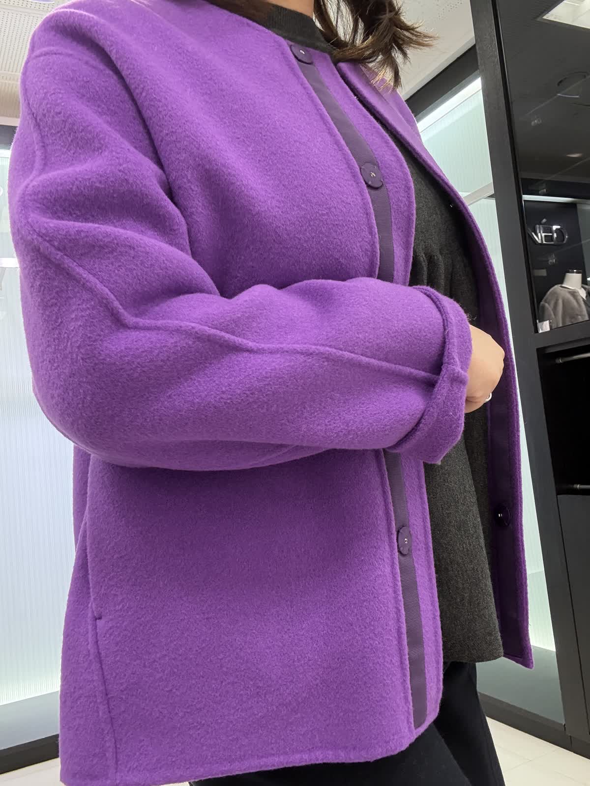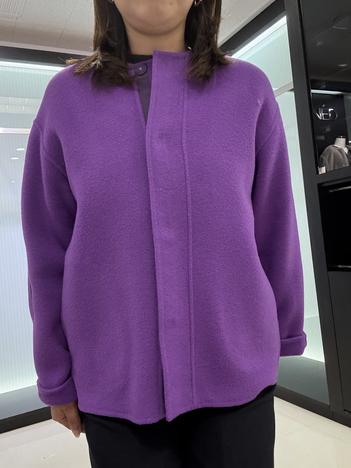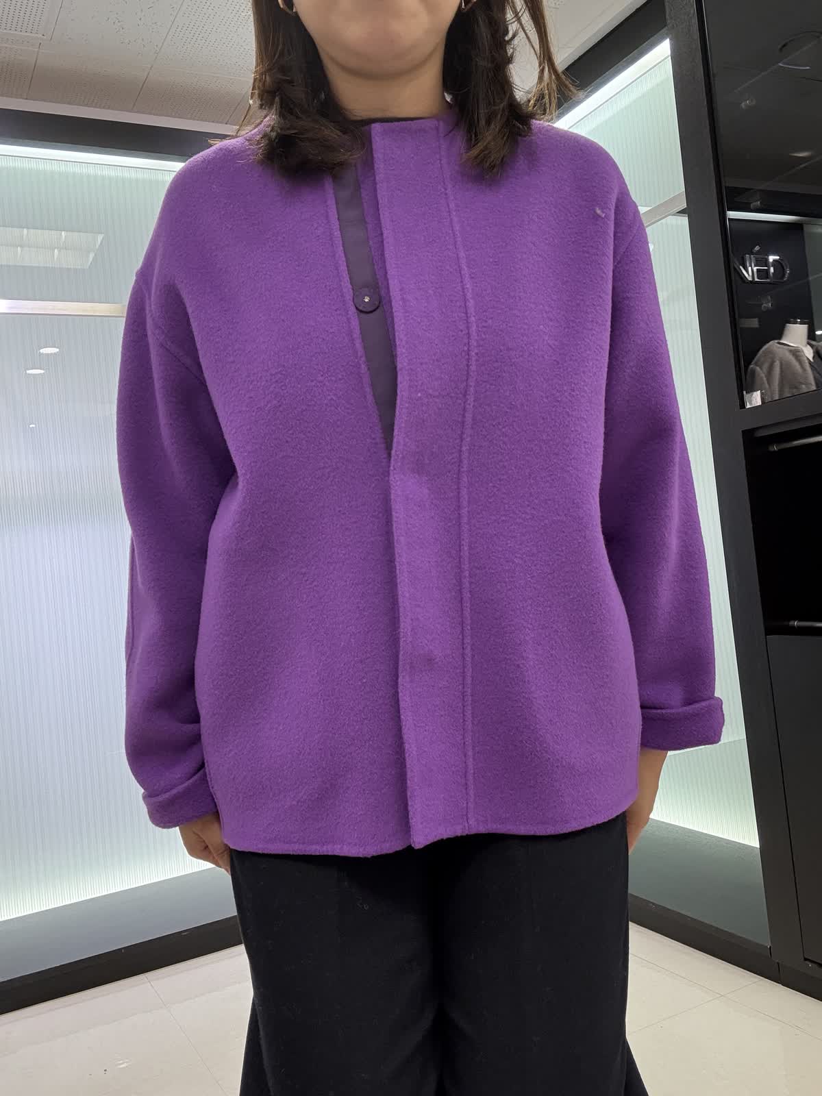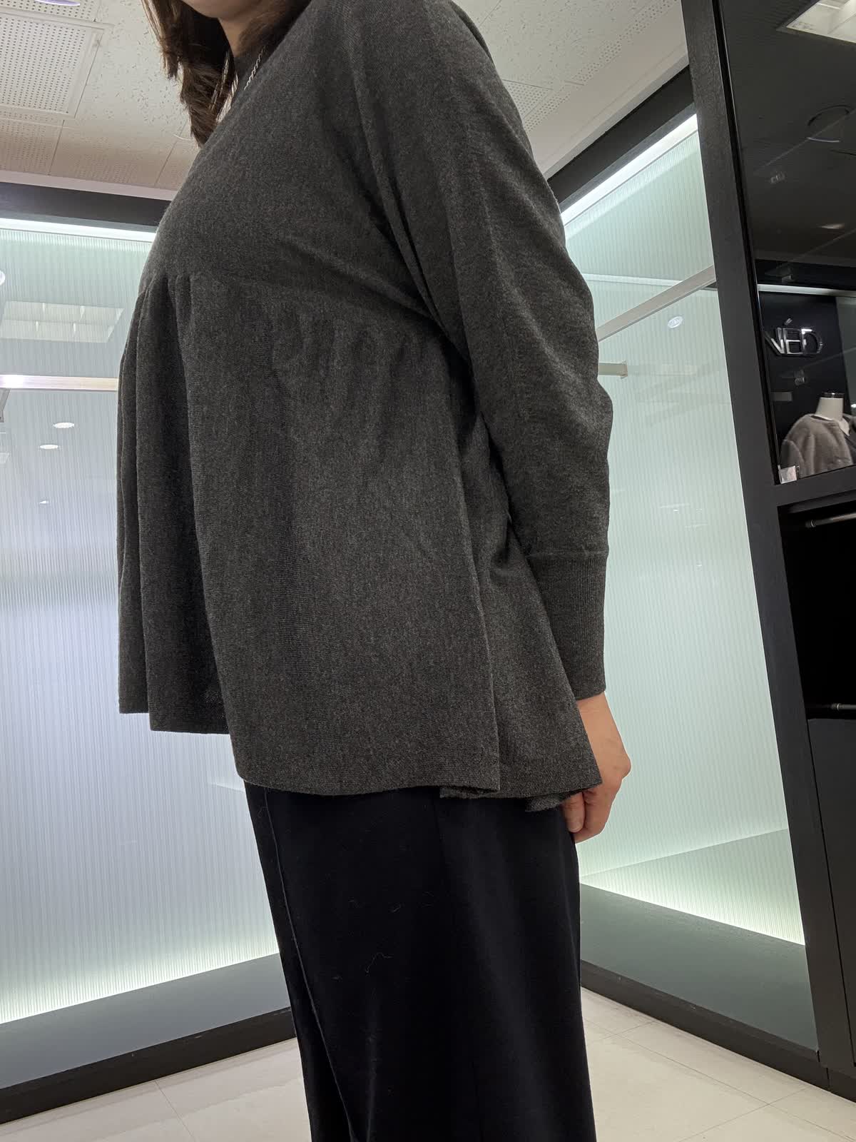 コート 9号 ウールリバーコート。ノーカラータイプなのでタートルで合わせて着てもスッキリ見えます。とても軽いので着ていて疲れません。オーバータイプなので中も着込めます。 ニット 9号ギャザーを使ったお腹周りがフワッと見えるデザインです。長さもあるので後ろ姿も気になりません。一枚で着映えするニットです。 パンツ 11号 ウール素材のワイドパンツ。ウール素材なので暖かく履いていただけます。シンプルなので着回しが効きます。裏地付きです。
