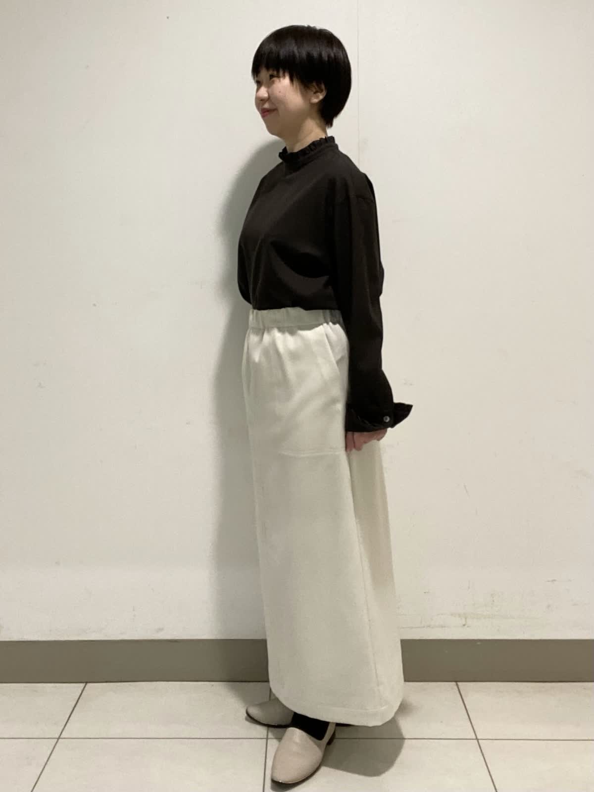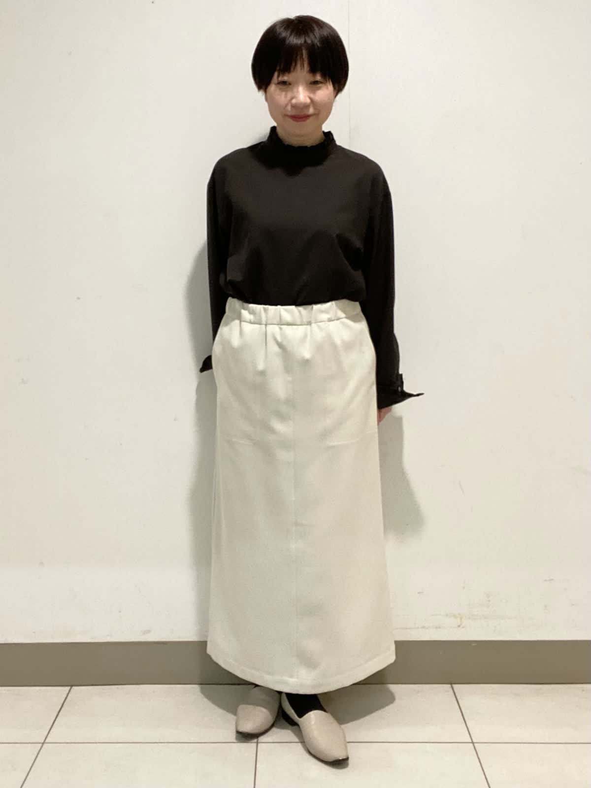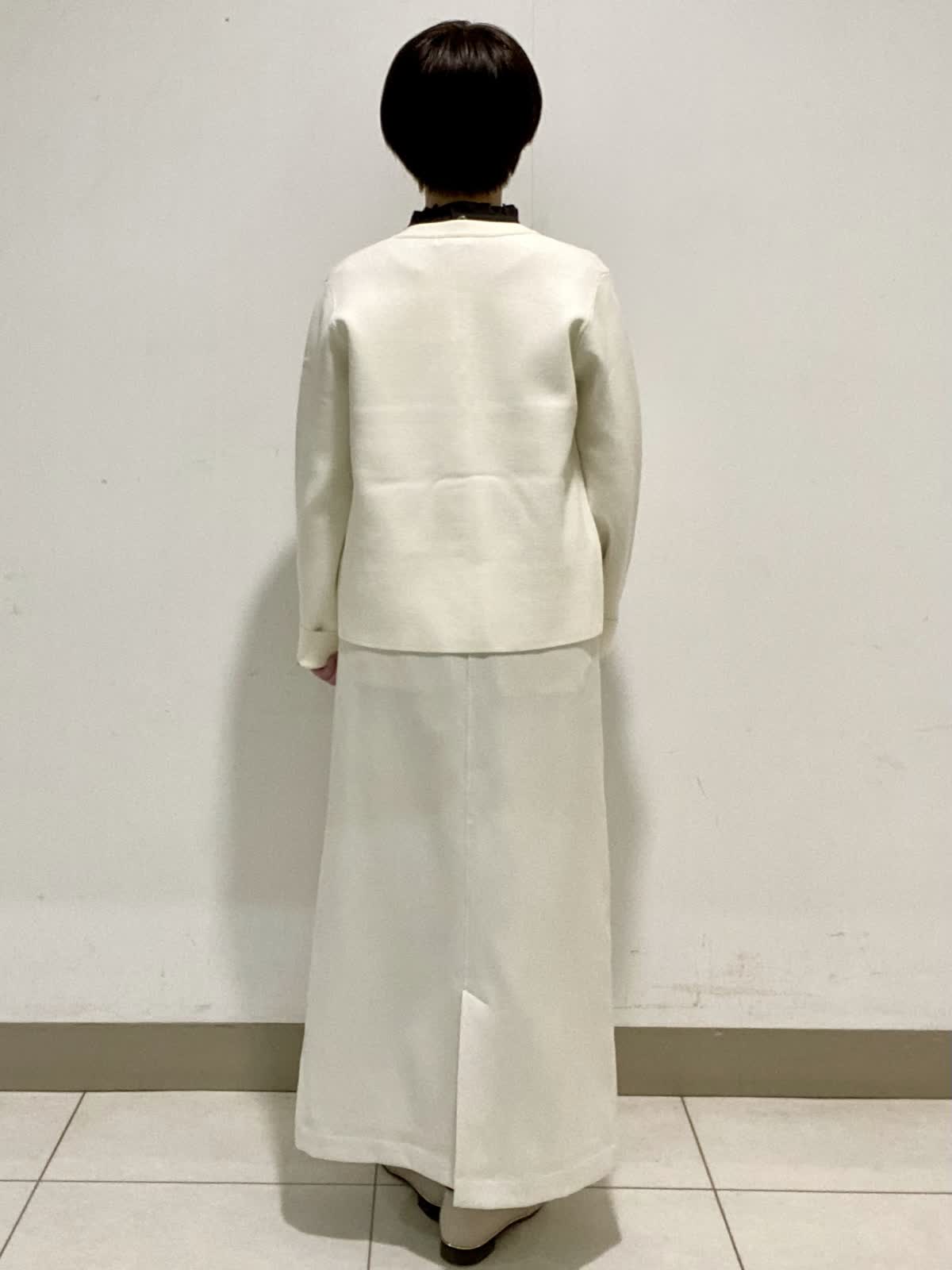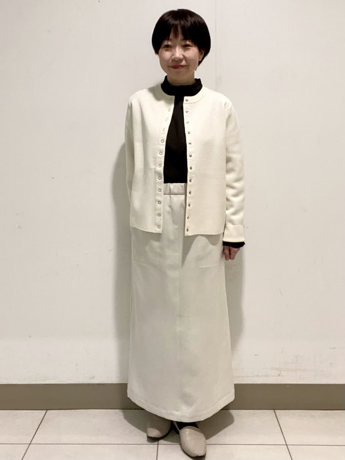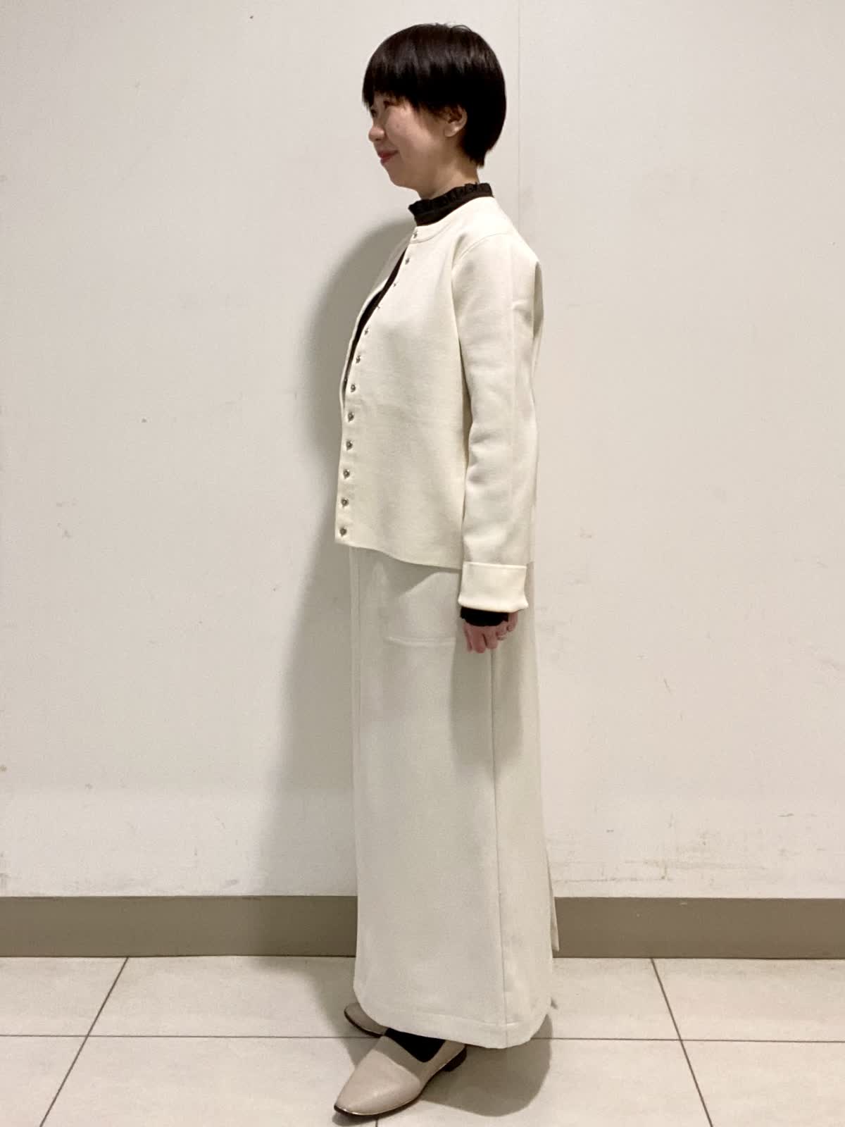 【着用サイズ】カーディガン:フリー ブラウス:フリー スカート:9号 ドットボタンのカーディガンはストンとしたシルエットでボリュームが出過ぎずジャケットの様に着るのも◎。袖口と襟のフリルがポイントのブラウスと合わせました。ウールタッチのスカートは手触りが柔らかく履き心地も◎。ウエストがゴム仕様なのも嬉しいポイントです。
