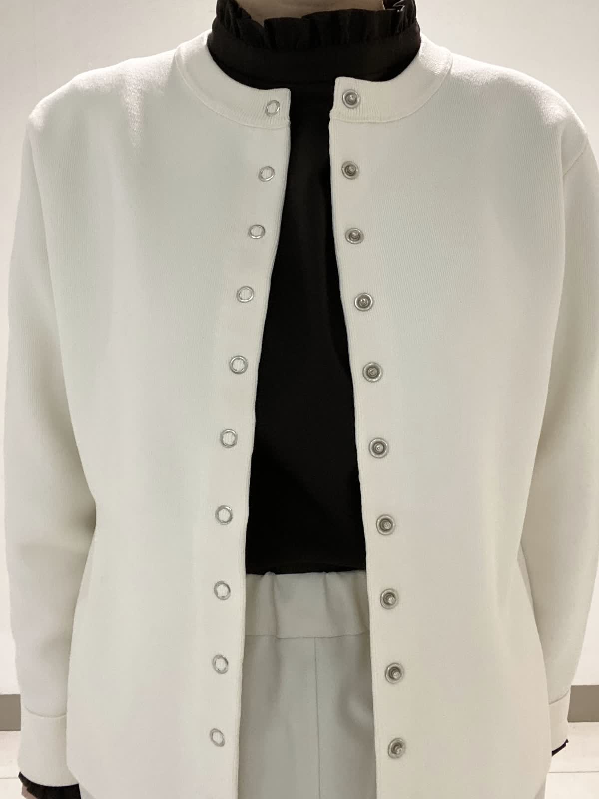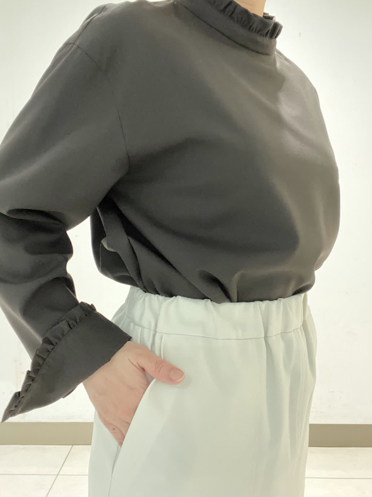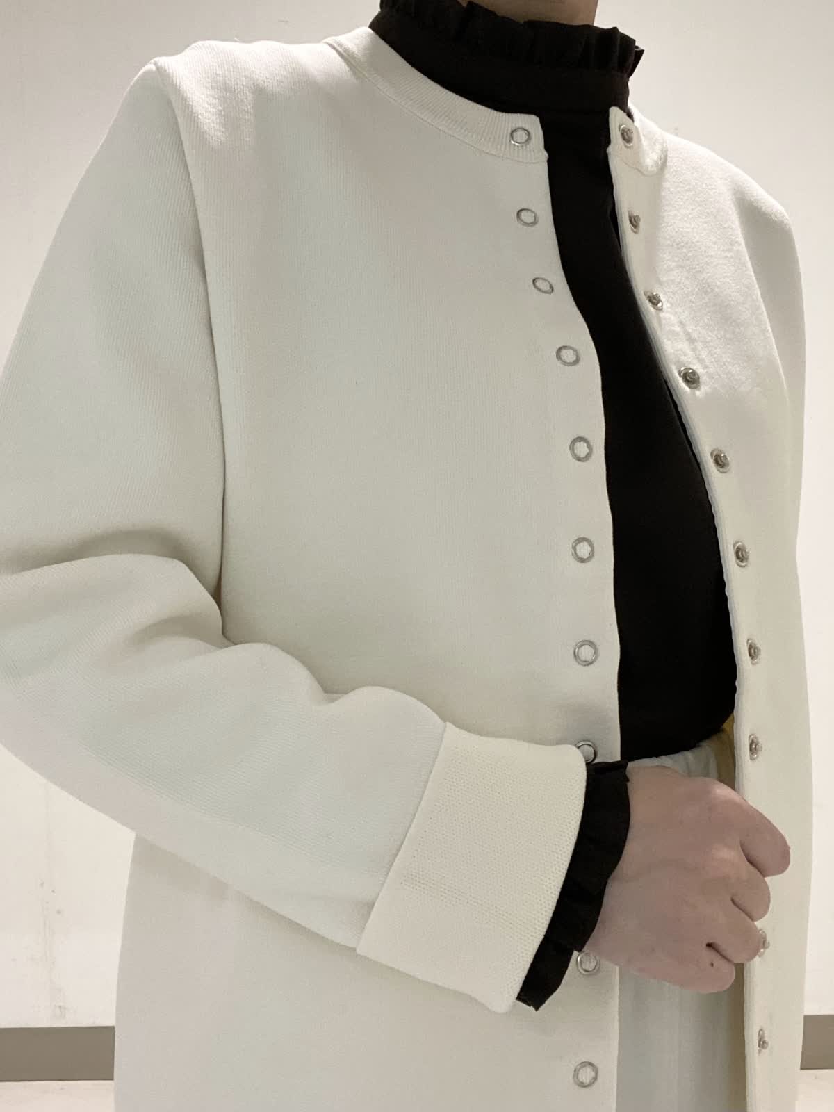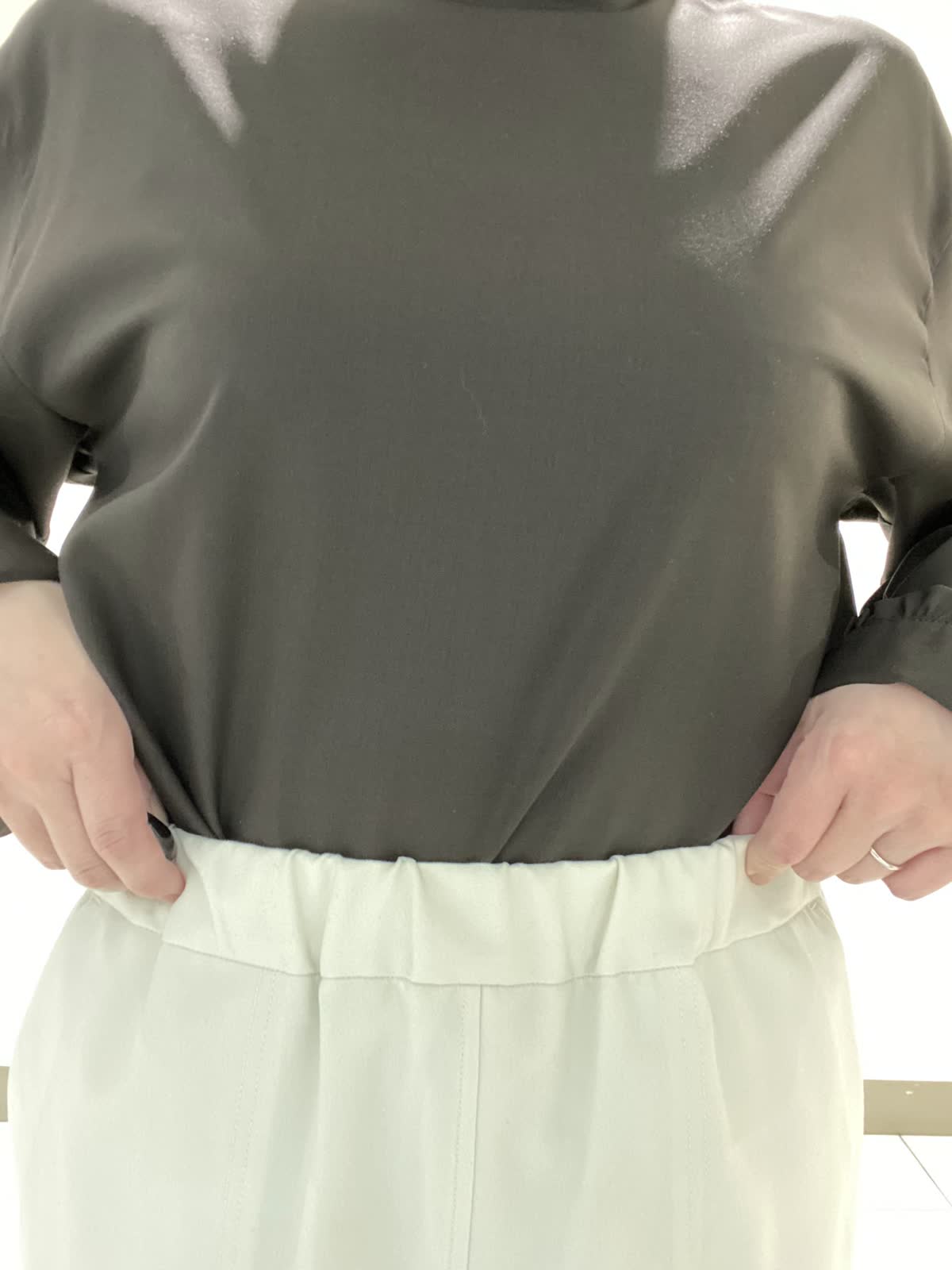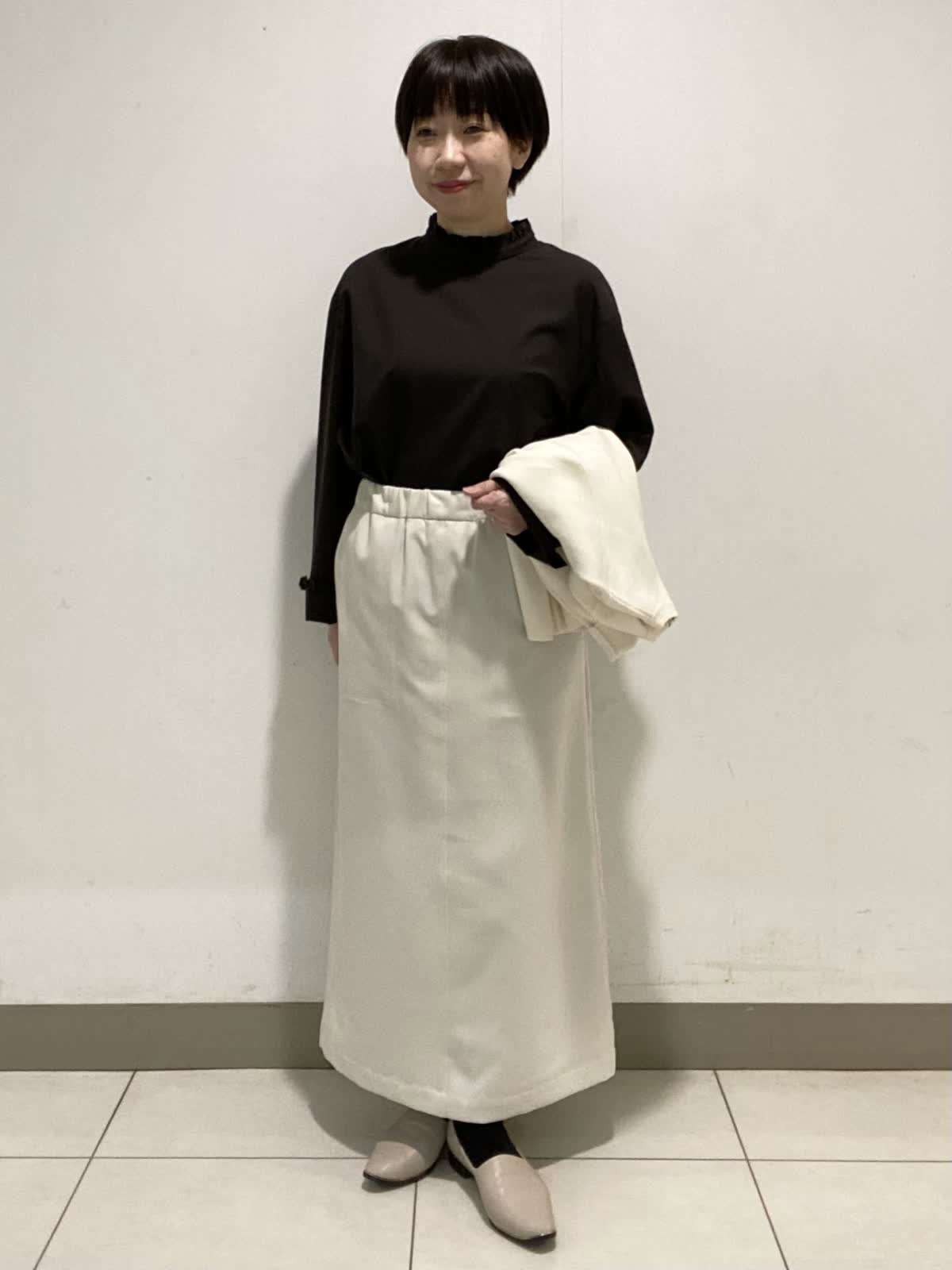 【着用サイズ】カーディガン:フリー ブラウス:フリー スカート:9号 ドットボタンのカーディガンはストンとしたシルエットでボリュームが出過ぎずジャケットの様に着るのも◎。袖口と襟のフリルがポイントのブラウスと合わせました。ウールタッチのスカートは手触りが柔らかく履き心地も◎。ウエストがゴム仕様なのも嬉しいポイントです。