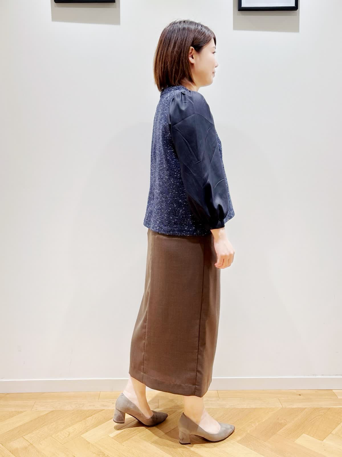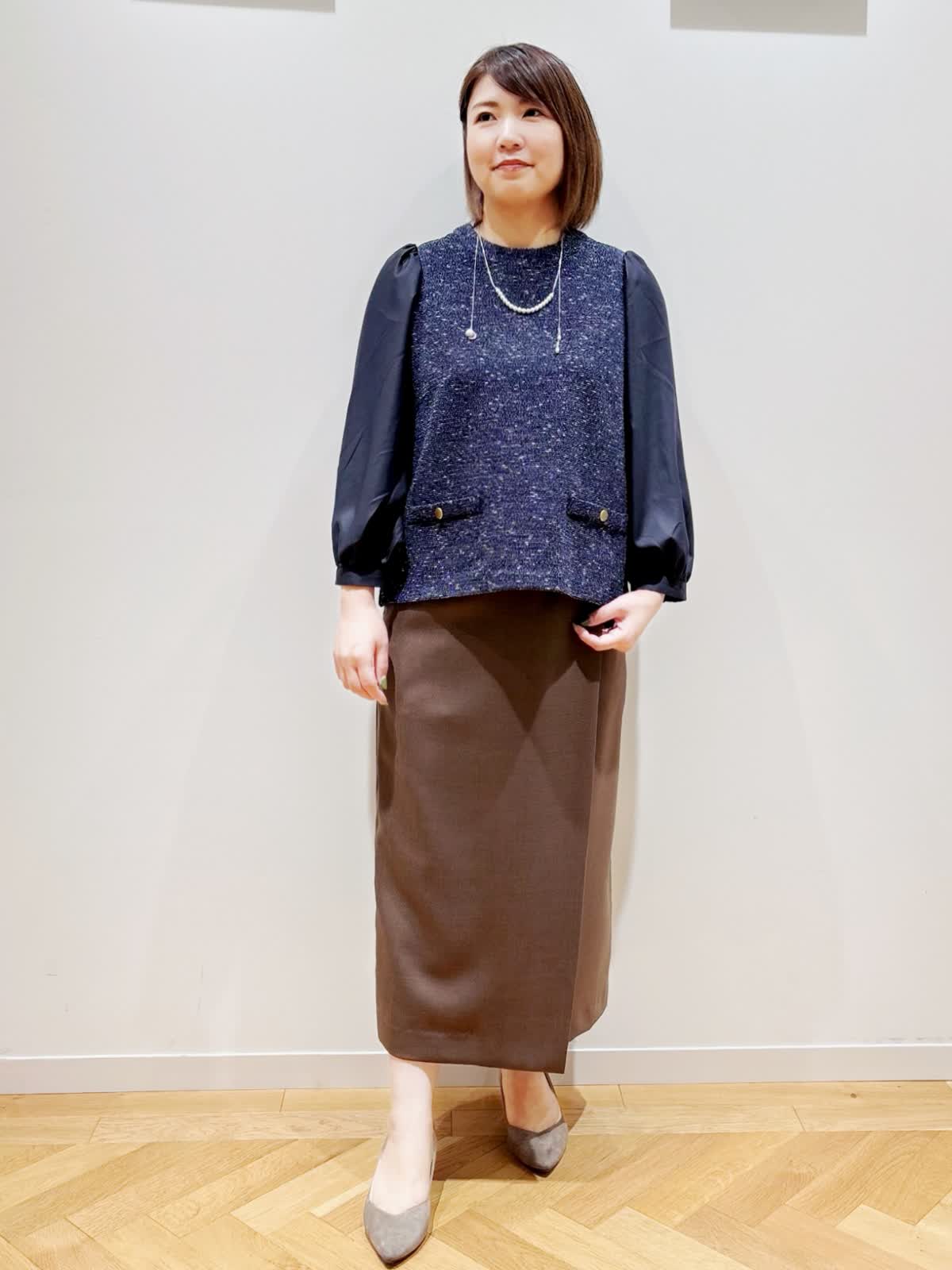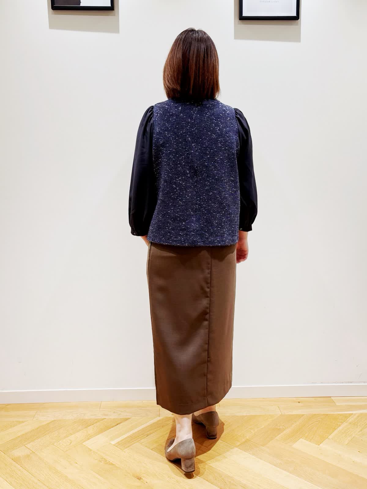【着用サイズ】全て9号 【着用カラー】カットソー:ネイビー スカート:ブラウン 秋のお出かけコーディネート。ハリのあるツイード調の見頃と柔らかな袖の組み合わせがきちんと見えて硬すぎないので、幅広いシーンで活躍します。見頃は伸縮性があるので、着心地抜群です。スカートはフロントには深めのスリットがあり動きやすいです。オンオフ問わず合わせやすいスカートです。